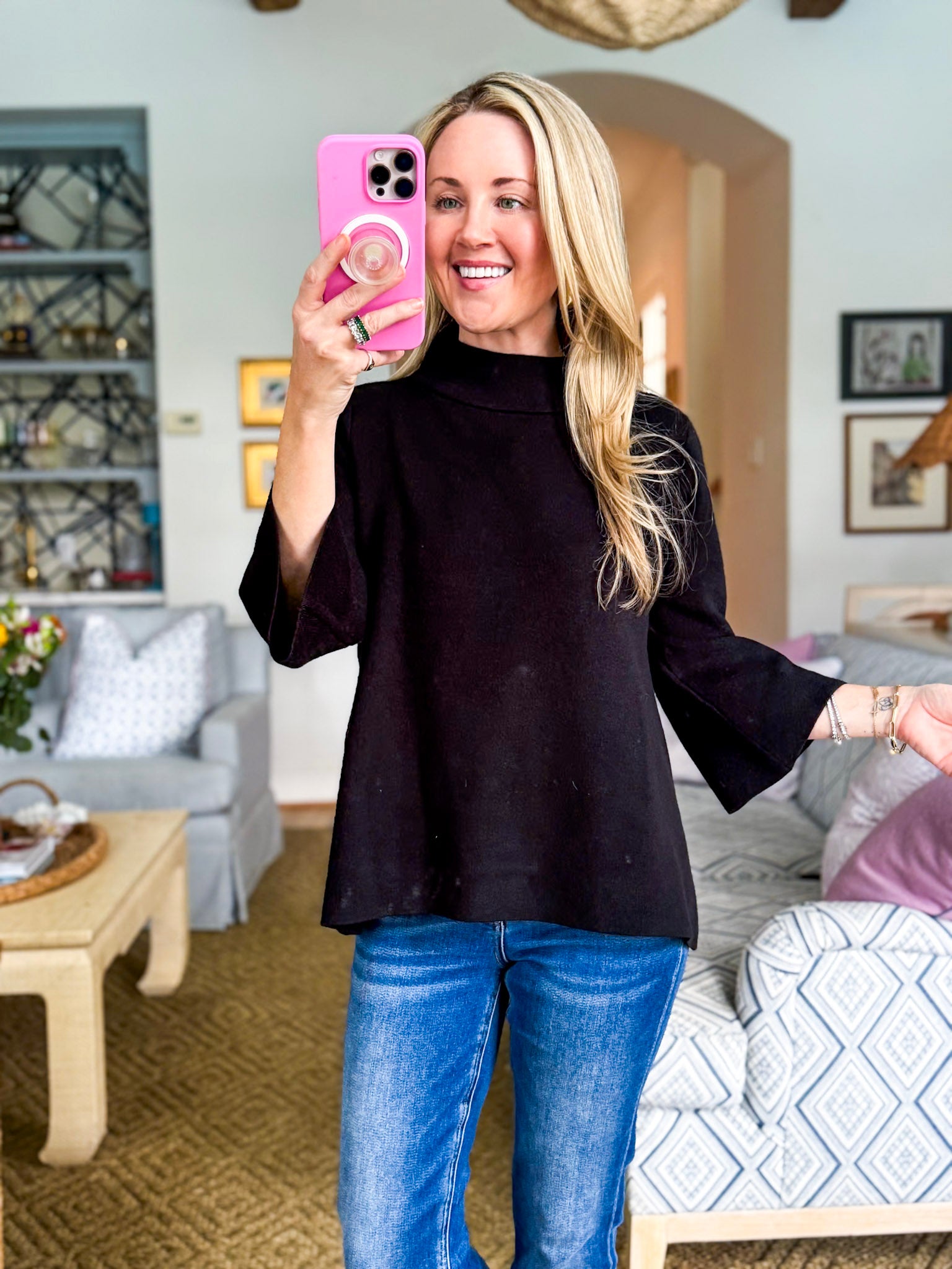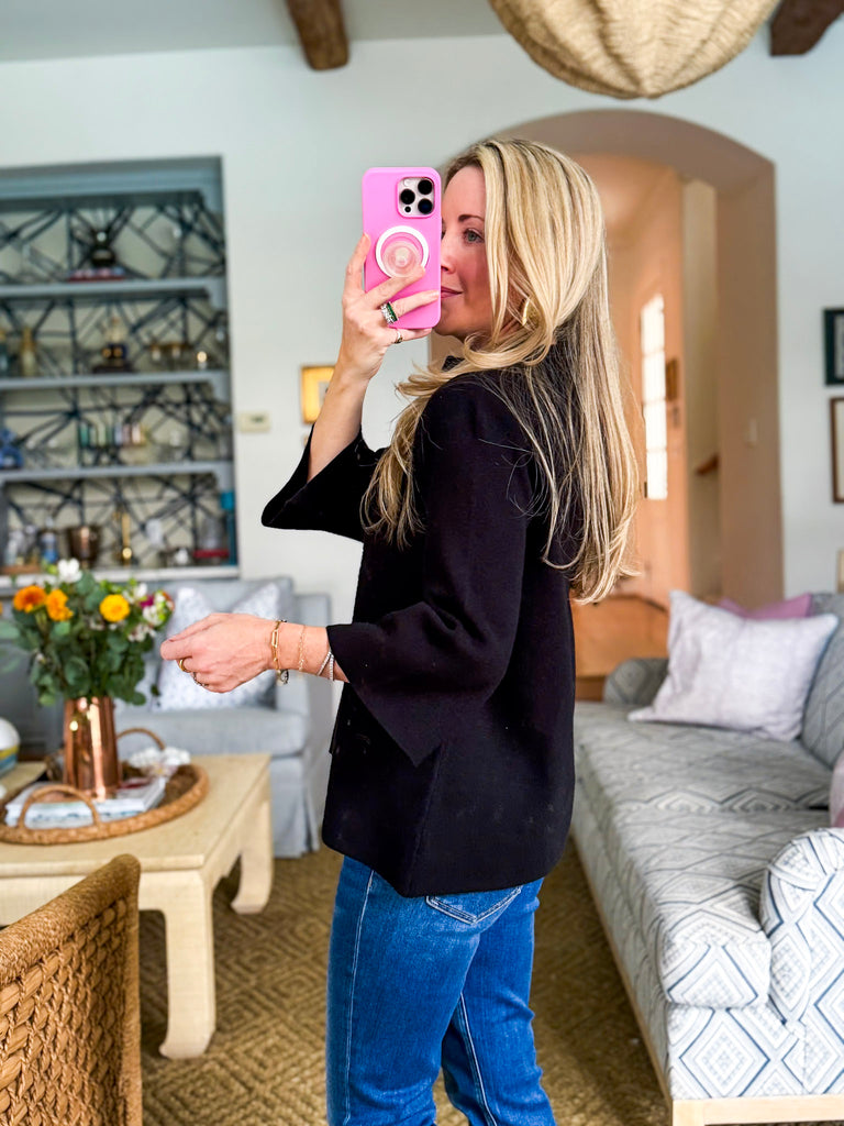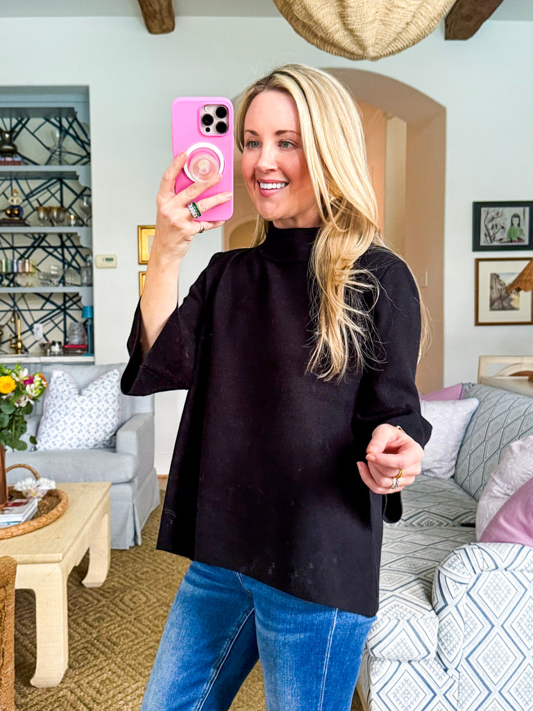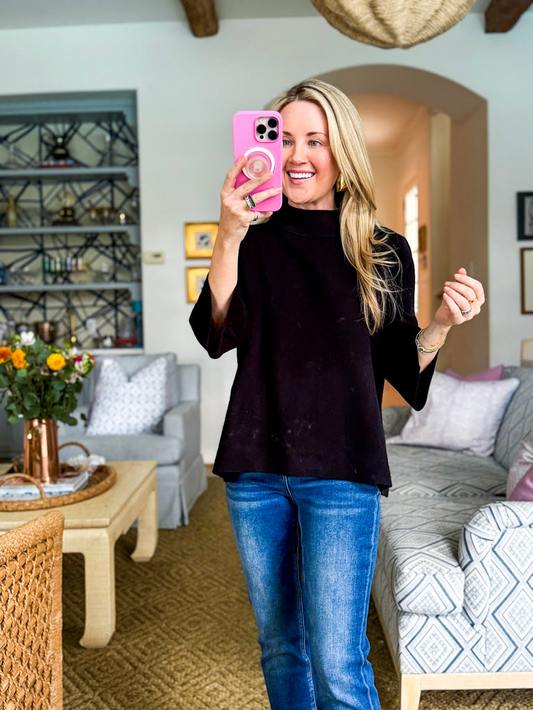 The Sweet and Soft Pull Over Sweater in black is your new cozy go-to. With its chic mock neck and flowy bell sleeves, it’s just the right mix of classic and playful. Perfect for coffee runs, casual Fridays, or snuggling up for weekend plans. Pair it with jeans, leggings, or even a skirt for endless outfit options.
