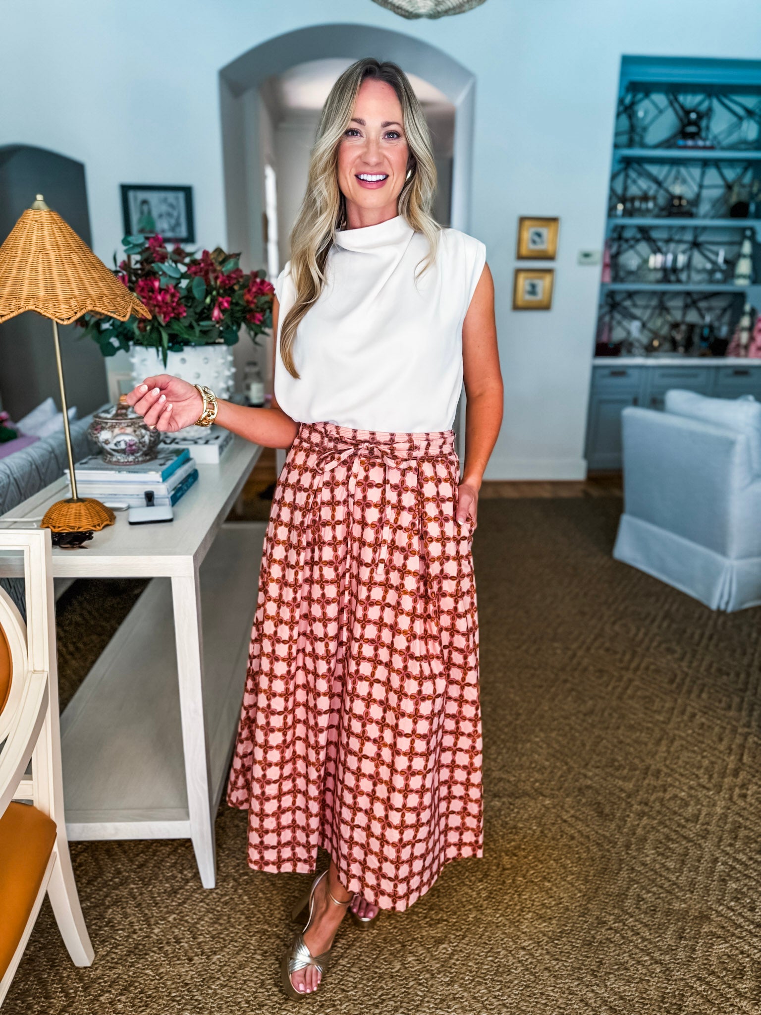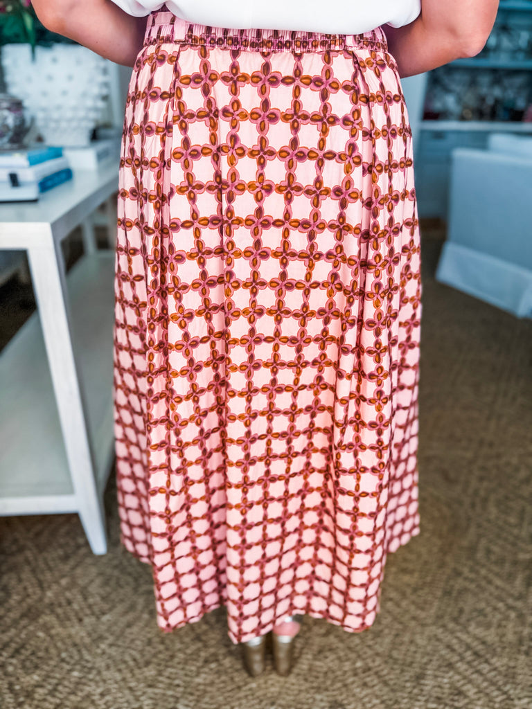 Love Us Chainlink Midi Skirt in multi delivers versatile style for any occasion. The striking geometric print complements the flattering A-line cut, while subtle pleats create graceful movement throughout. The midi length strikes the perfect balance between polished and approachable—pair it with heels for an elevated look or sneakers for laid back vibes. Whether you're heading to brunch or the office, this skirt adapts to your day with ease.