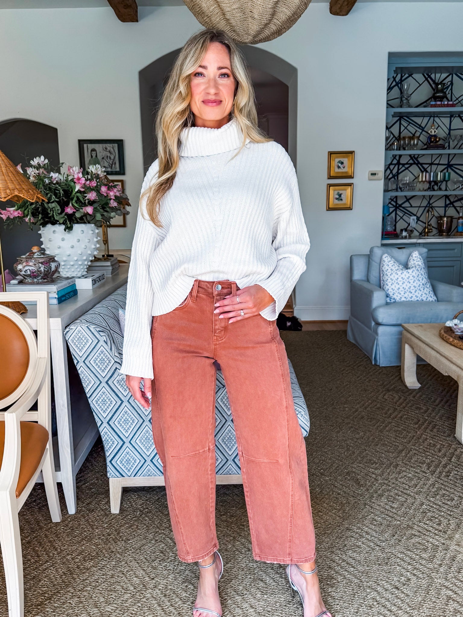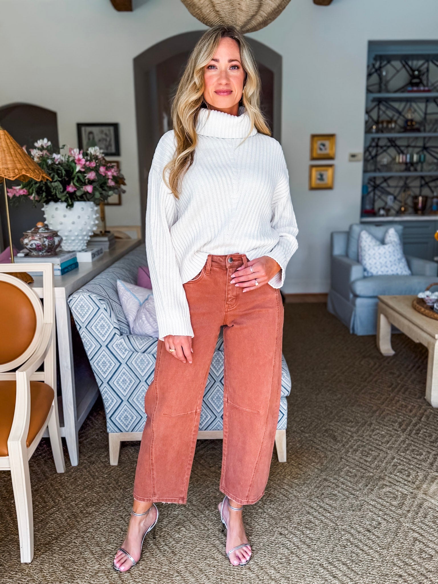 Meet your new everyday favorite – the Twist and Turn Barrel Jeans in copper! With their comfy stretch and unique seam detail, they’re perfect for running errands, casual Fridays, or brunch with the girls. The cropped length gives you that modern edge while still being easy to style. Just add sneakers or chic flats and you’re out the door.