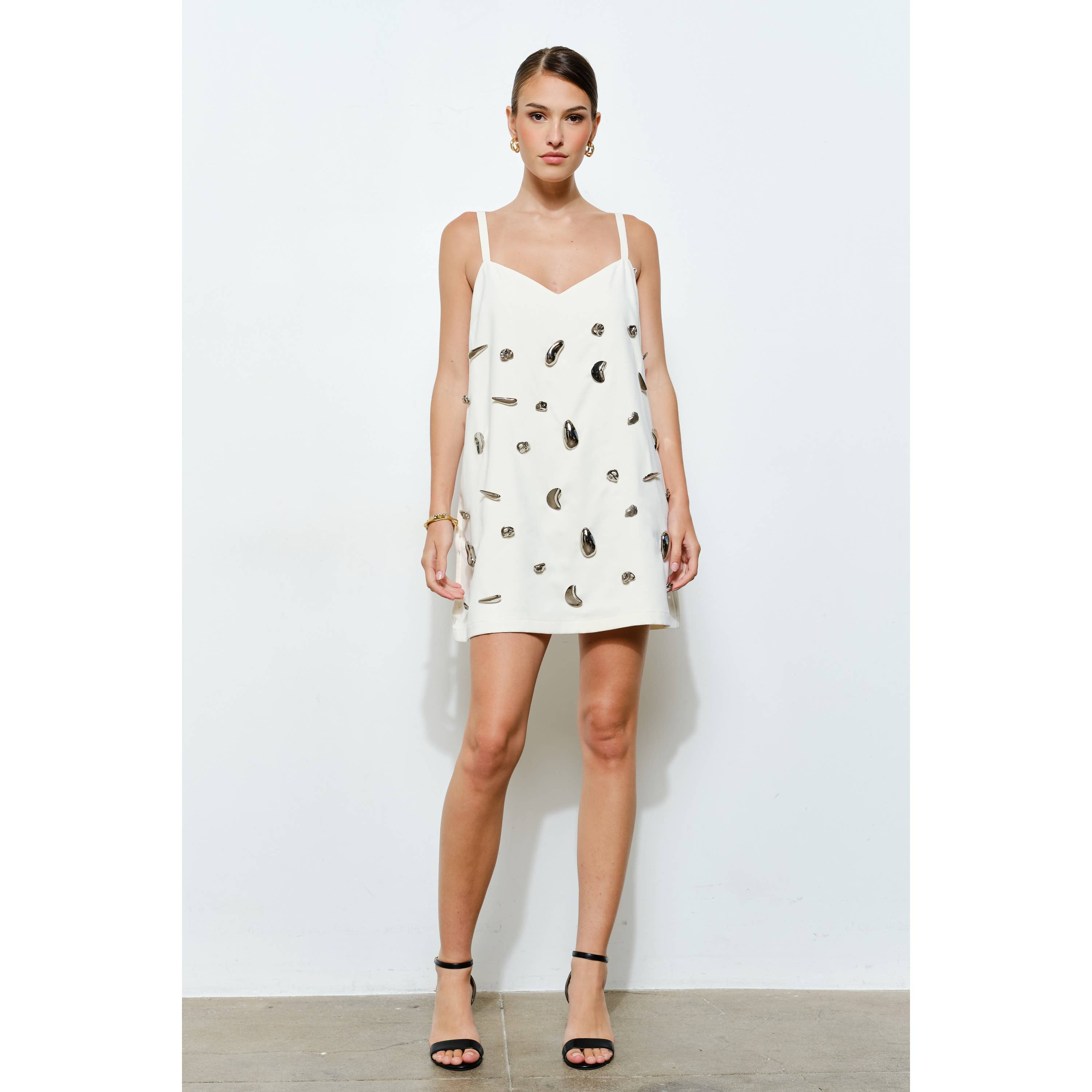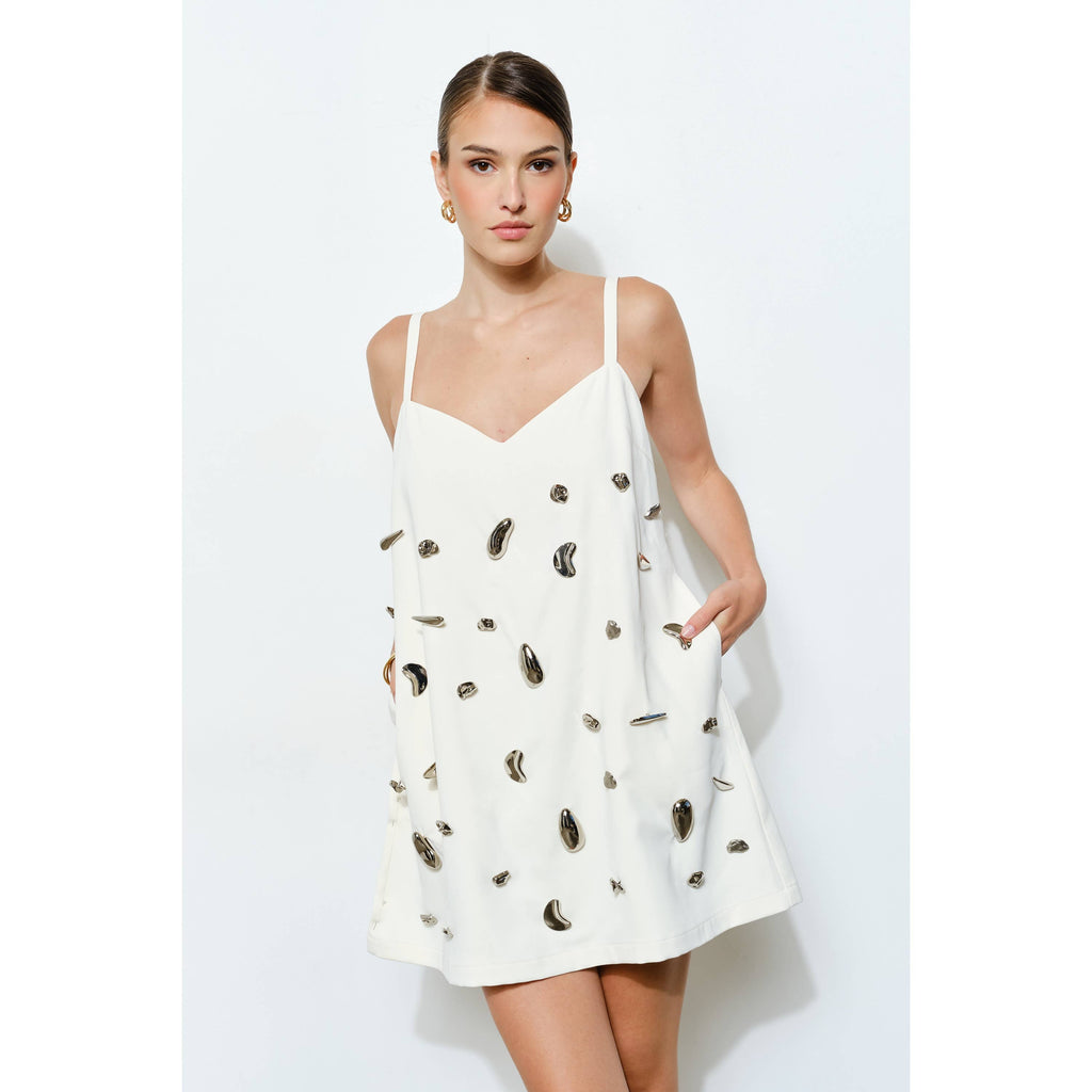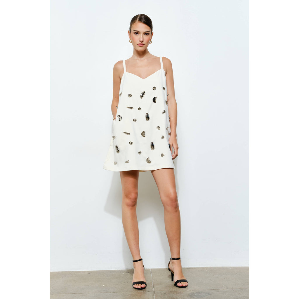 Bring the drama in the Something Special Embellished Mini Dress in cream. Sparkling silver metallic embellishments elevate the timeless A-line silhouette, giving it a look that’s both modern and stylish. Bonus points for the hidden side pockets that keep it practical. A perfect choice for stylish evenings, from holiday parties to art shows.