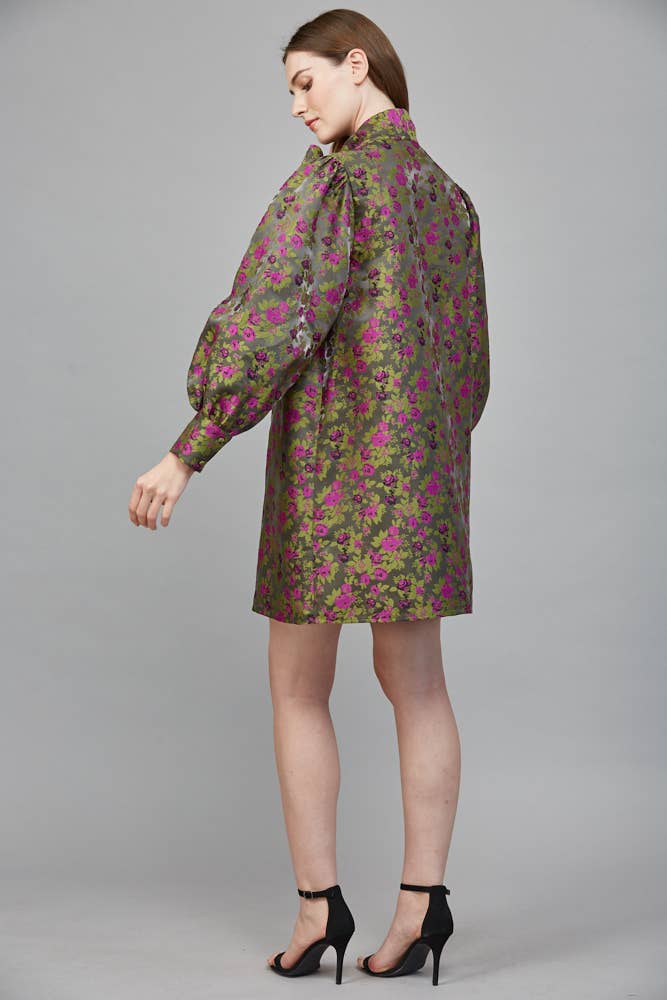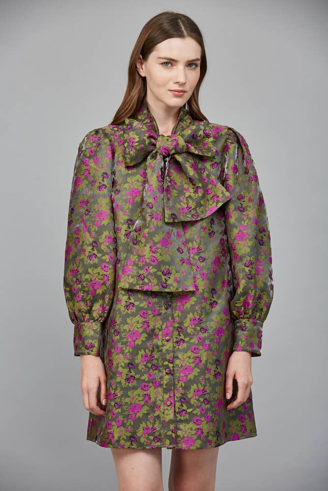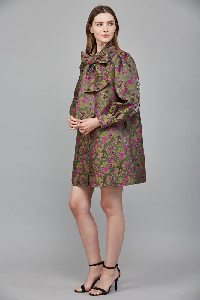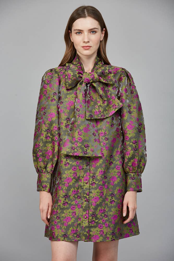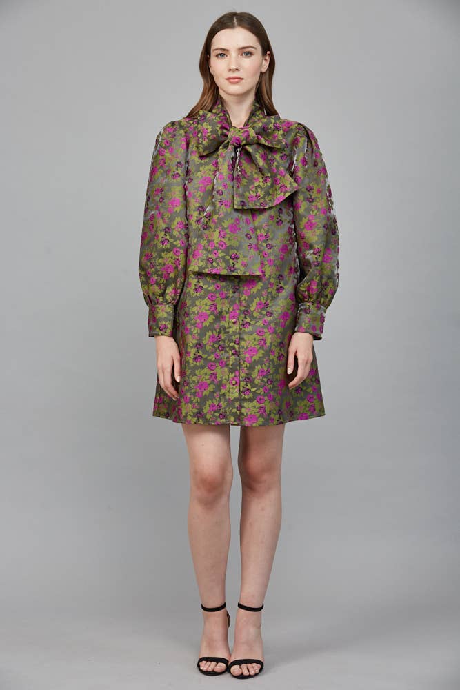 Twirl into elegance with Glam Agenda Jacquard Dress in moss green, where delicate floral jacquard patterns dance across the fabric. The sweet bow tie detail at the neckline adds a playful touch of sophistication, making it perfect for casual parties, brunch dates, or any occasion calling for a dash of whimsy. The flattering A-line silhouette ensures comfort and style in one delightful package.