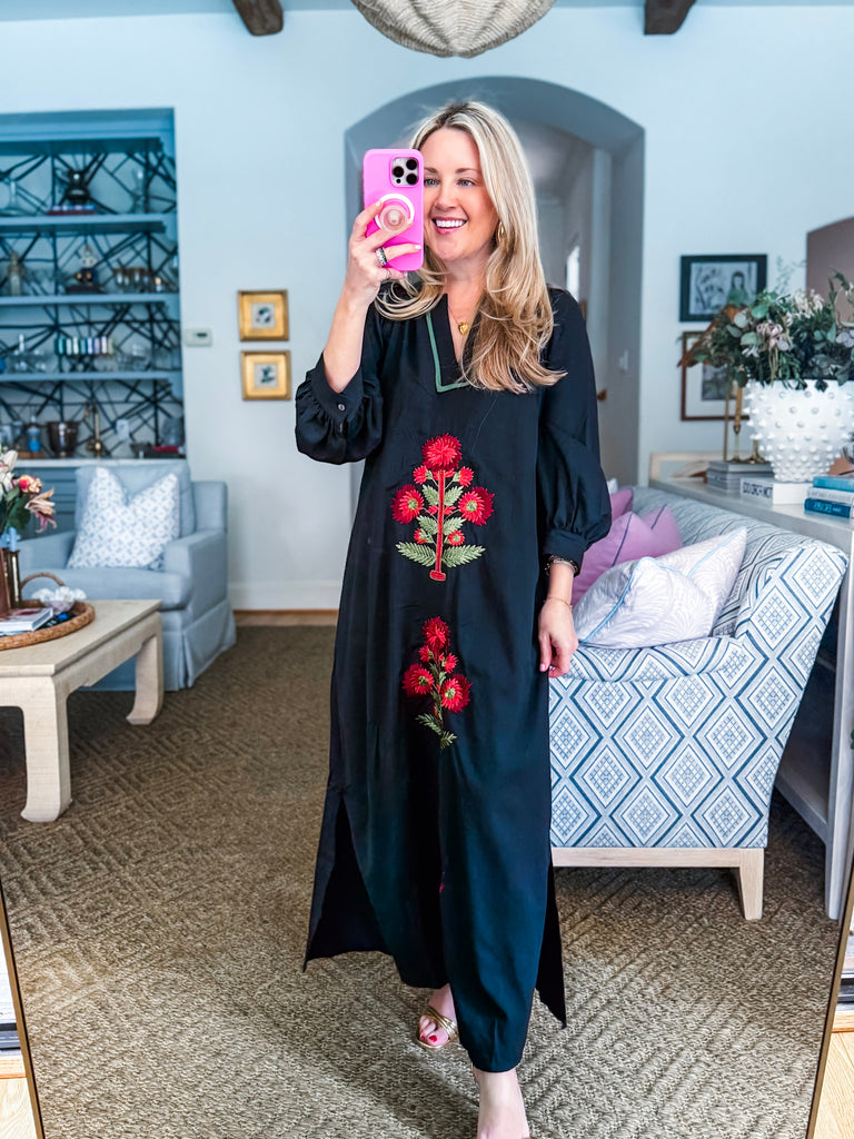 The Sunflower Fields Embroidered Maxi Dress in black is giving effortless boho beauty! With its delicate floral embroidery, flowy sleeves, and flattering V-neck, this dress is perfect for brunch dates, casual parties, or weekend getaways. The side slits add just the right touch of flirt and freedom to move. Lightweight and lined, it’s your go-to for looking put together without trying too hard.