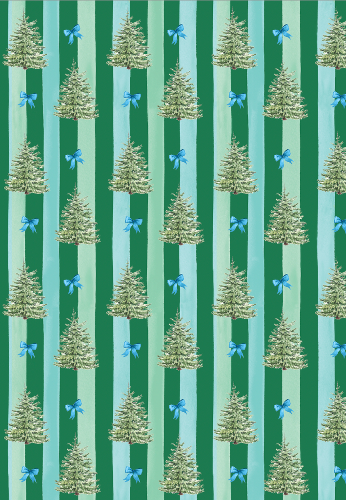 Delight your gift recipient with our beautiful green striped wrapping paper. So cute for Christmas wrapping! DETAILS • Roll of 3 beautifully luxe paper sheets • 20" x 29" sheets • Packaged rolled in a clear sleeve with sticker • Made in the USA • Original watercolor trees and bows striped illustration by Cami Monet