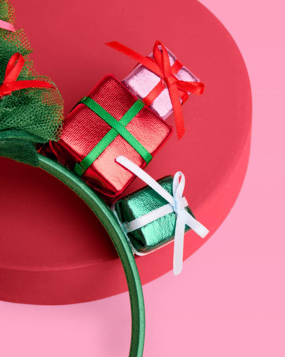 Bring the holiday cheer with our Christmas Tree Headband — a playful green tulle tree topped with pink and red satin bows. Perfect for cookie swaps, office parties, and cozy movie nights. Slip it on and instantly become the main character of the season!