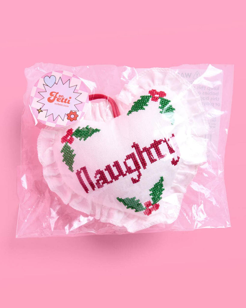 Add some cheeky charm to your tree with the Naughty or Nice Cross Stitch Ornament! This double-sided heart-shaped ornament with a ruffled border is ready to hang and instantly turns up the holiday fun. Whether you’re feeling sweet or a little mischievous, it’s the perfect playful touch for your Christmas decor or a great stocking stuffer. Bring on the eggnog, the laughter, and the festive vibes!