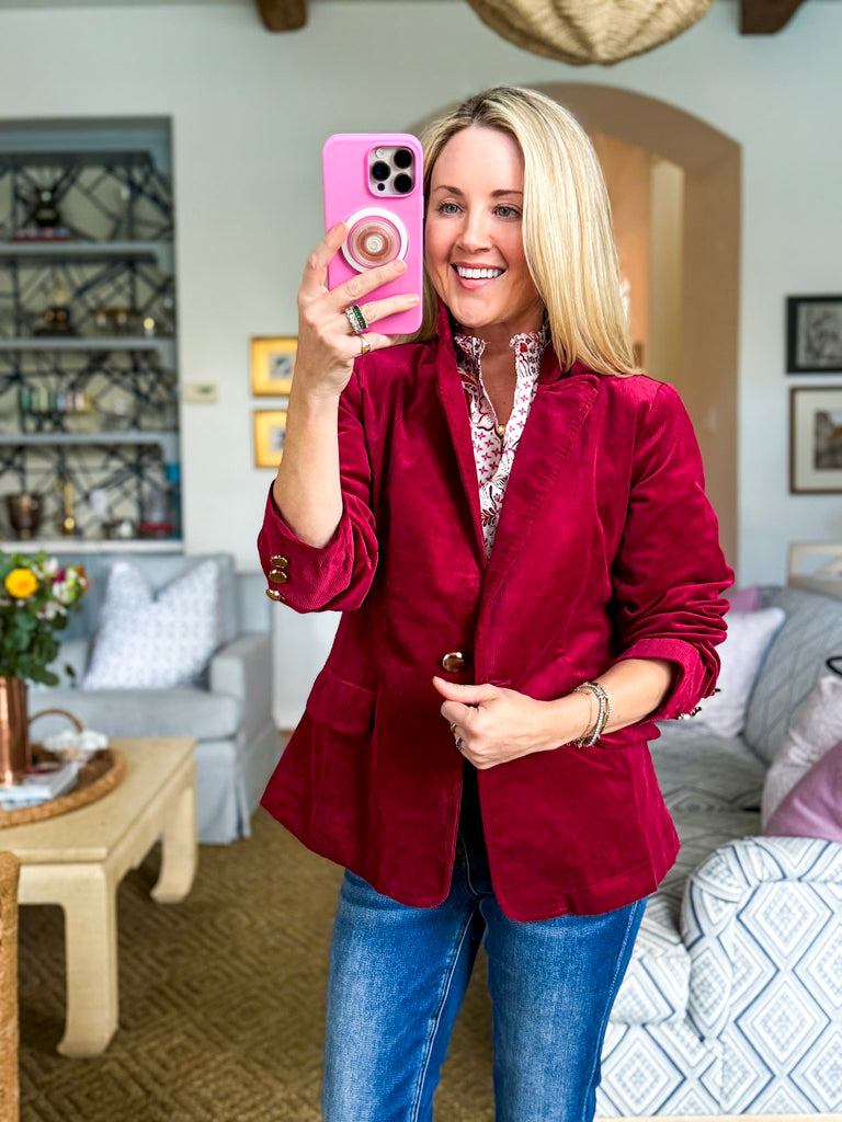 Features: Gold Button, Trimmed, Corduroy Blazer