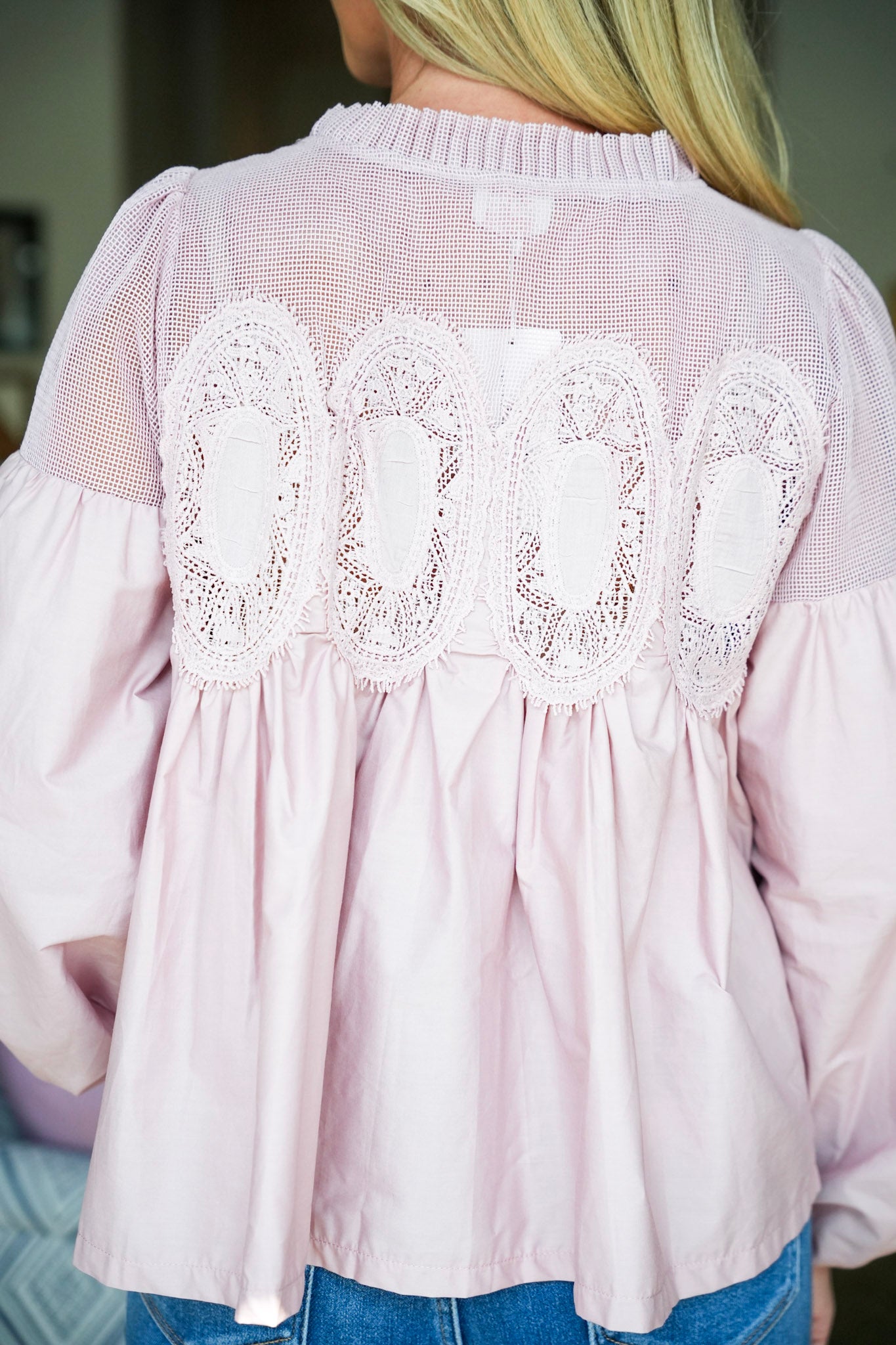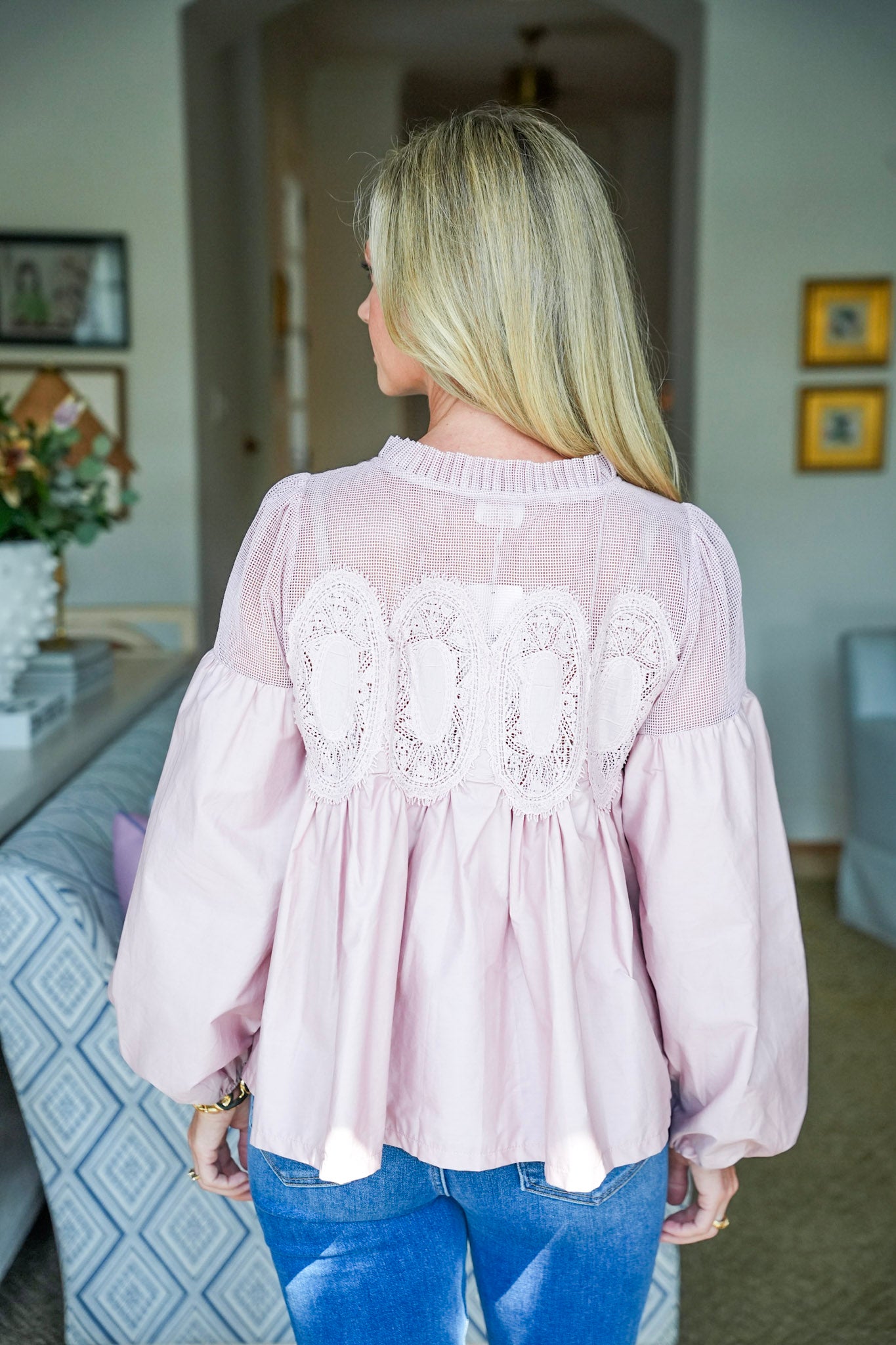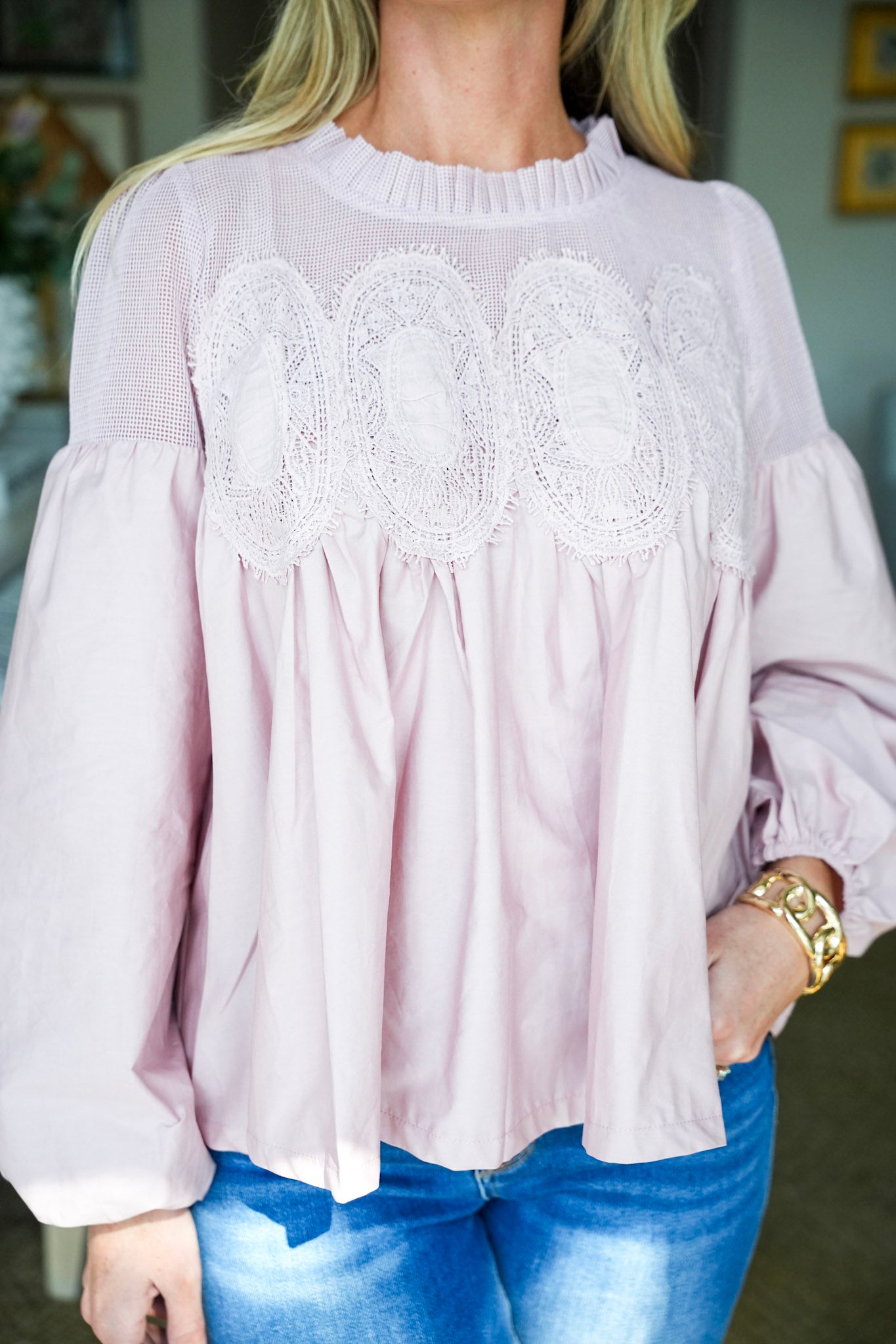 The Orchard Picnic Lace Top in mauve is pure charm with its delicate lace appliqué and mixed media design that feels both timeless and fresh. With long sleeves and airy detail, it’s the perfect pick for lunch dates, weekend outings, or even a casual office day. Pair it with jeans for a laid back vibe or a skirt to dress it up. Effortless style that makes every day feel a little more special.