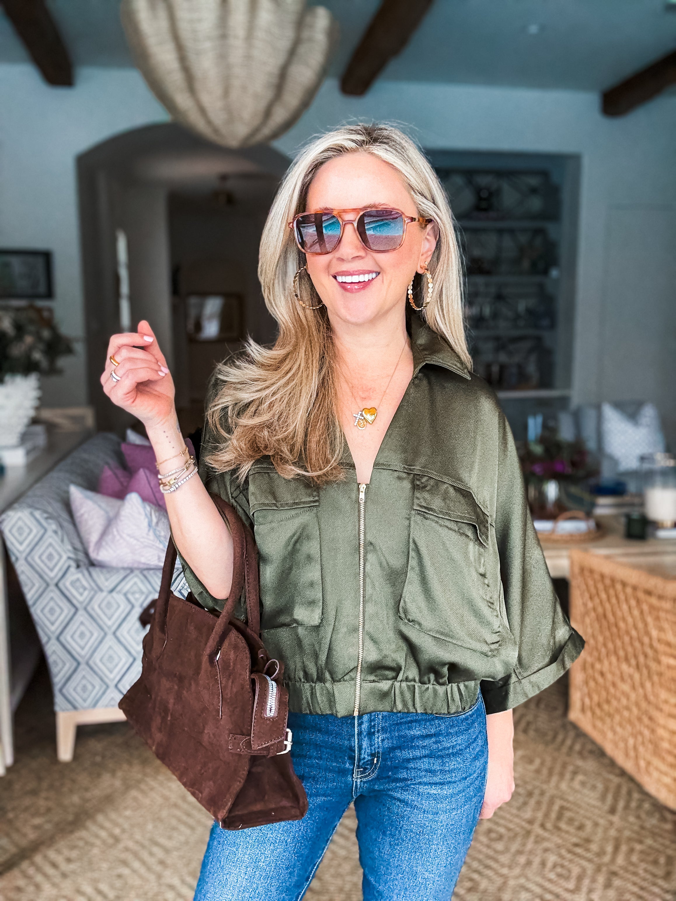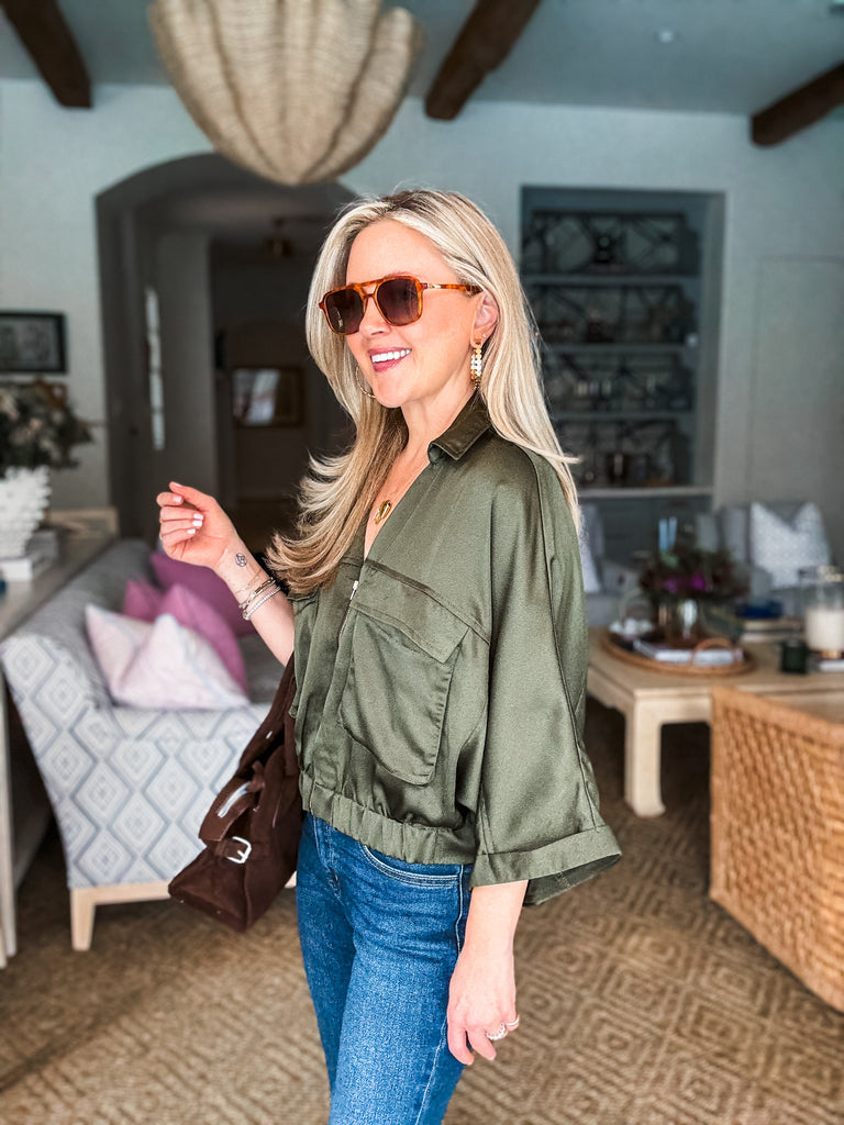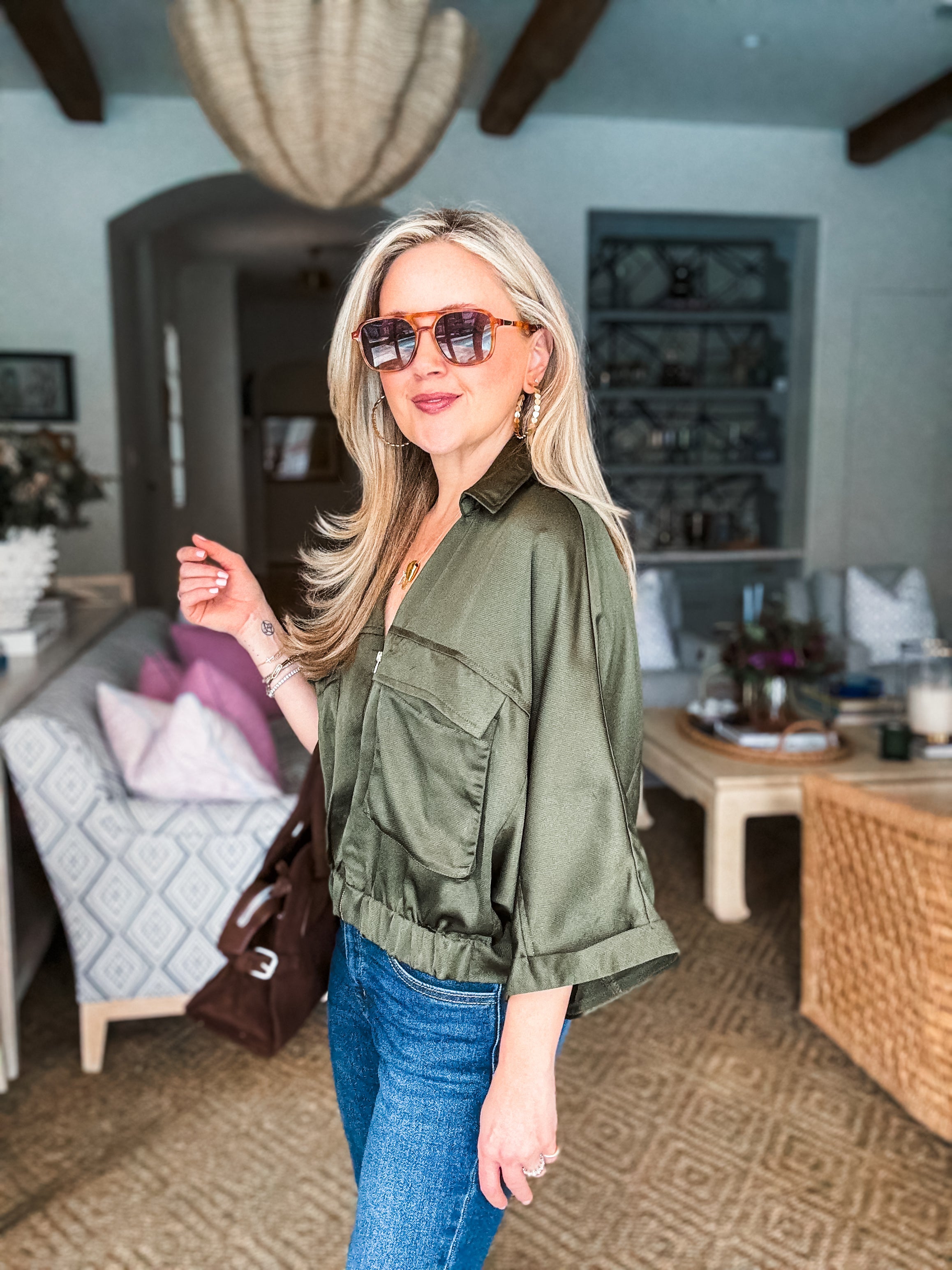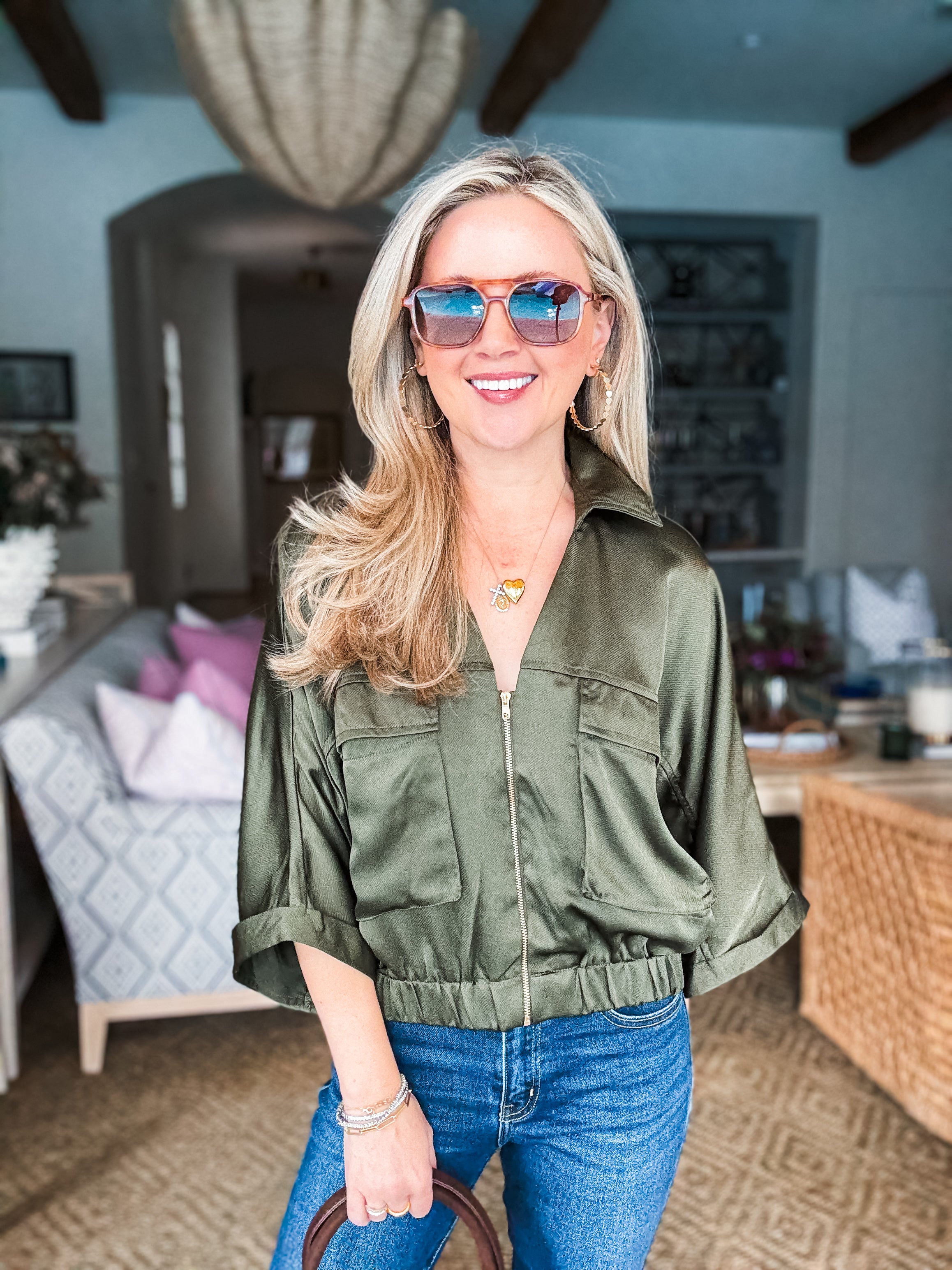 The City Sights Zipup Top in olive is made for women who love easy style with a little edge. The deep V neckline and front zipper add just the right amount of detail, while the relaxed sleeves keep it comfy all day. Toss it on for travel days, weekend getaways, or casual meetups. It’s that effortless look that always feels right.