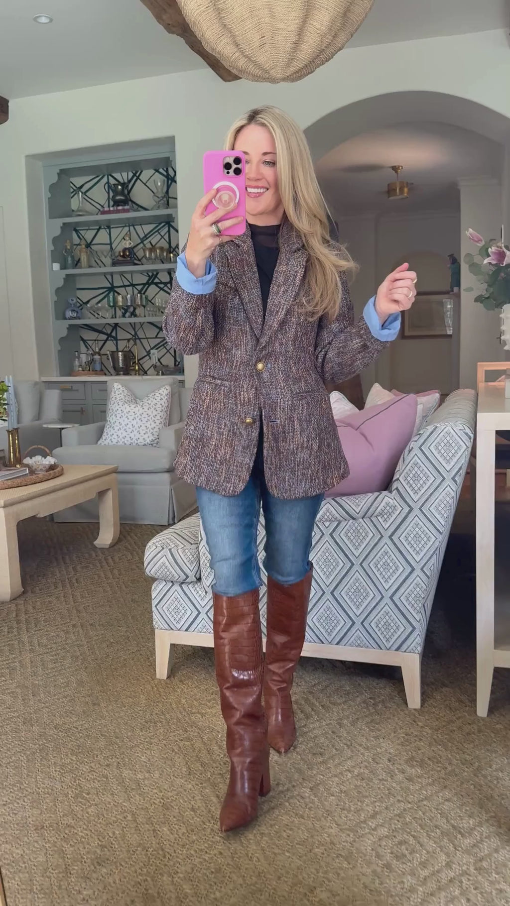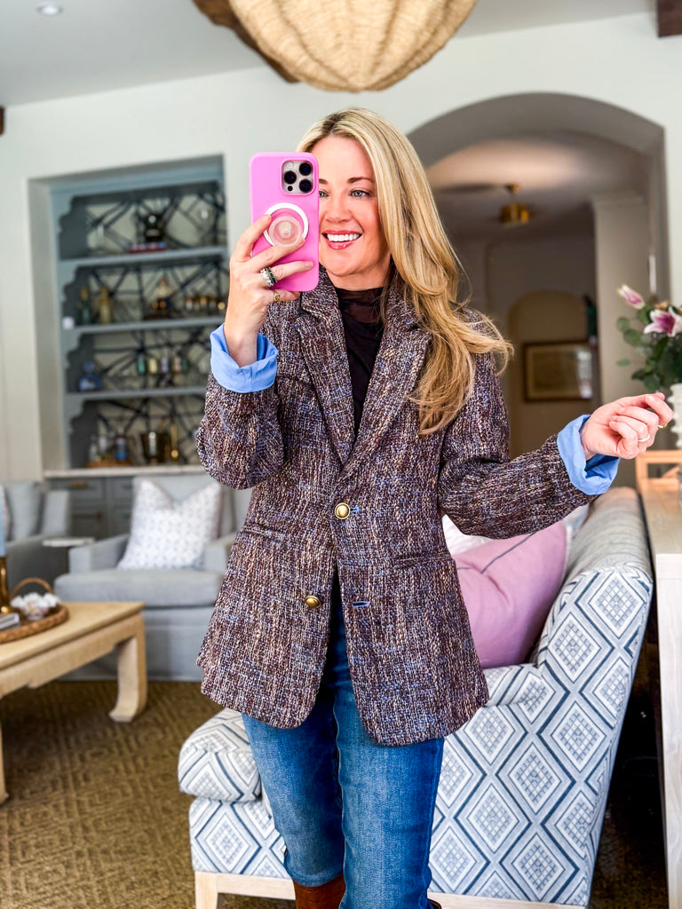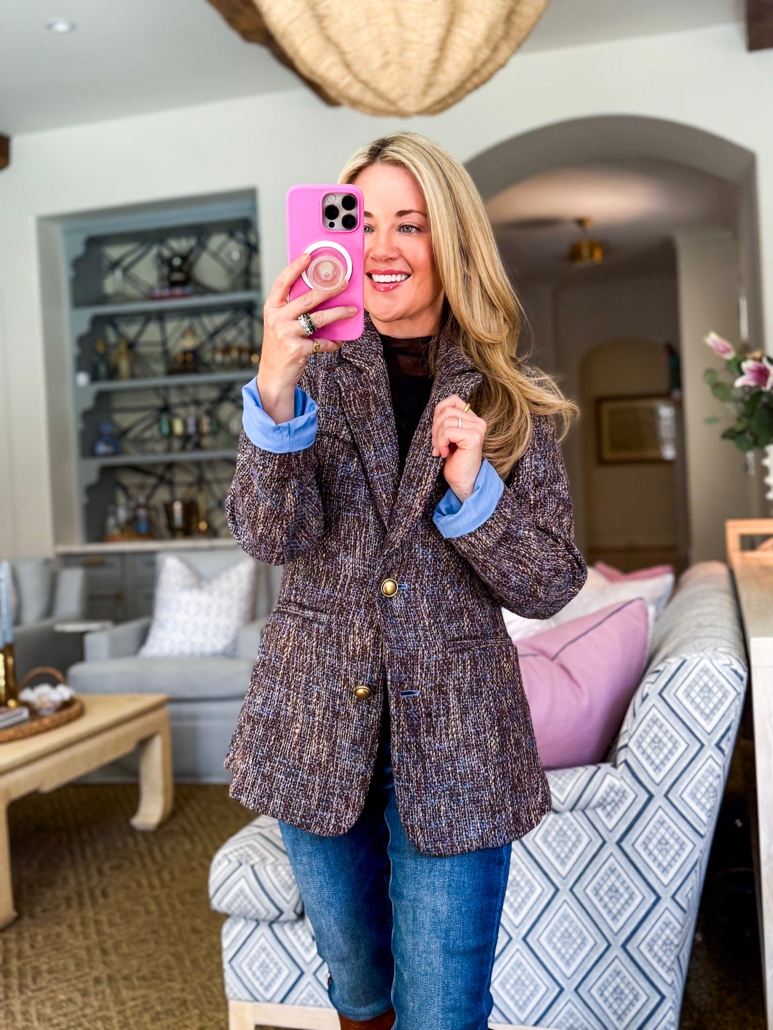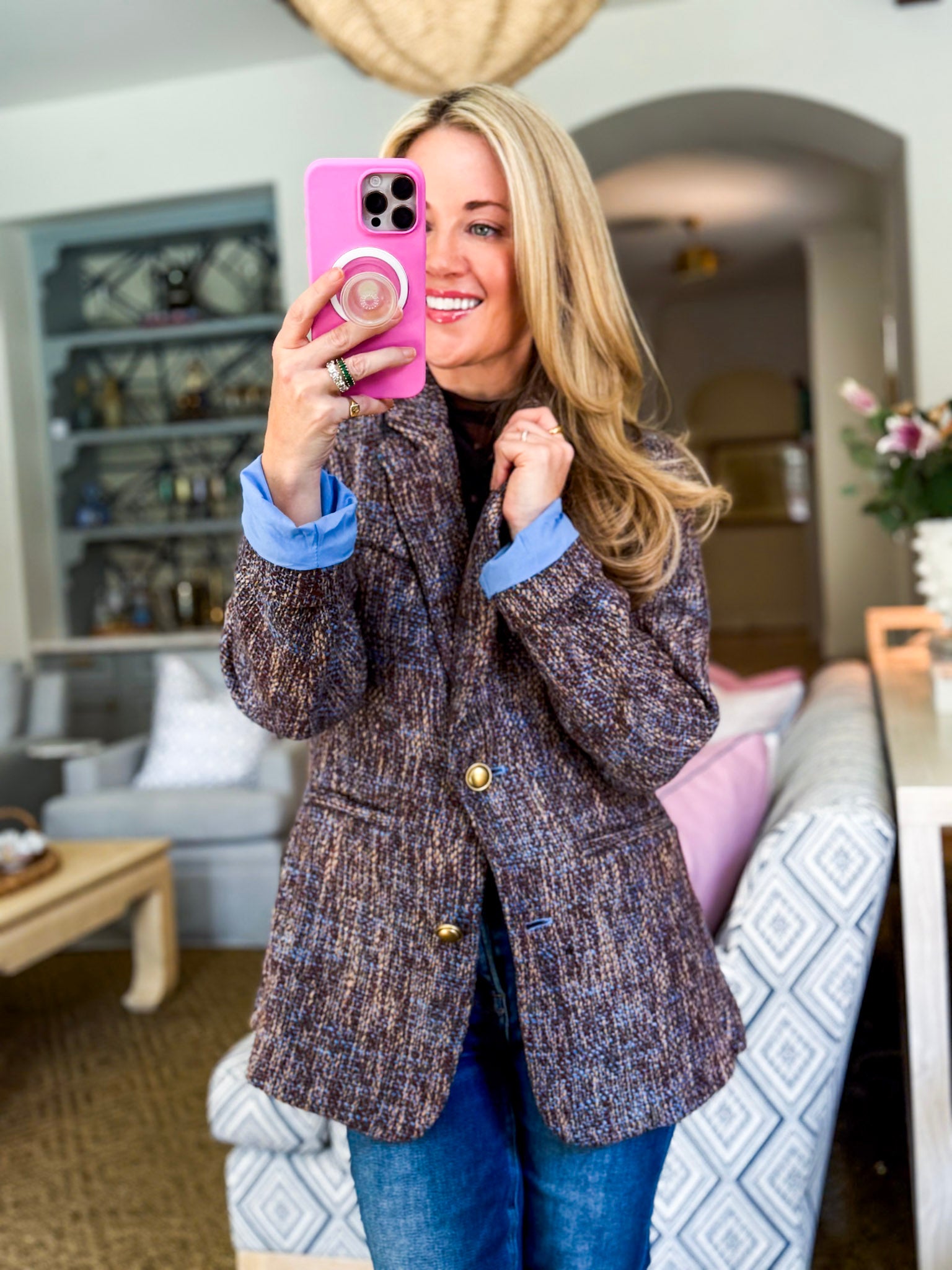 Take your outfit up a notch with the Timeless Tweed Oversized Blazer in brown. Its tailored shape, subtle plaid accents, and medium weight fabric strike the perfect balance between structured and easygoing. Layer it over a blouse for the office or a tee for a weekend coffee run. This blazer is the definition of effortless chic.