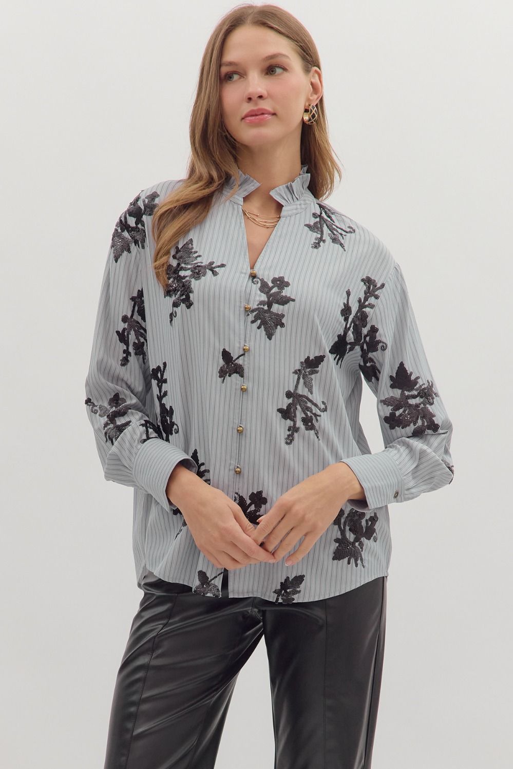 Features: Striped long sleeve top featuring floral applique embroidery and ruffled band collar. Button closure at front. Buttoned cuffs. Unlined. Woven. Non-sheer. Lightweight.