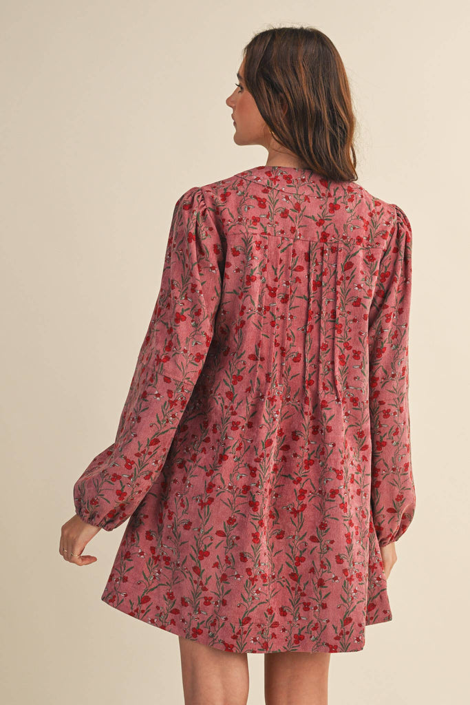 Features: Floral corduroy mini dress,  V neckline with tying closure, Pin tuck detail on front and back,  Long puff sleeves with elastic cuffs, Shift silhouette, Pockets