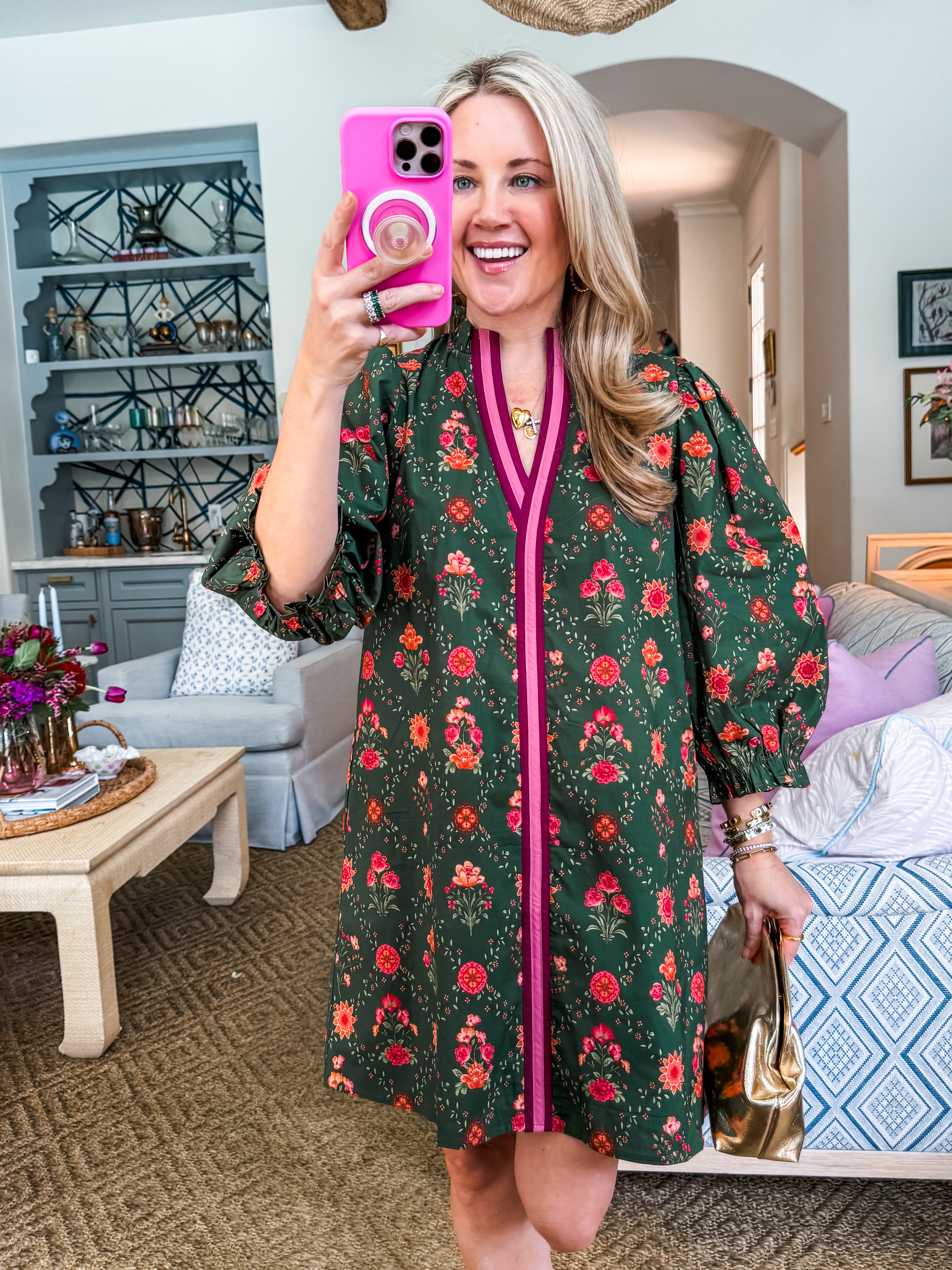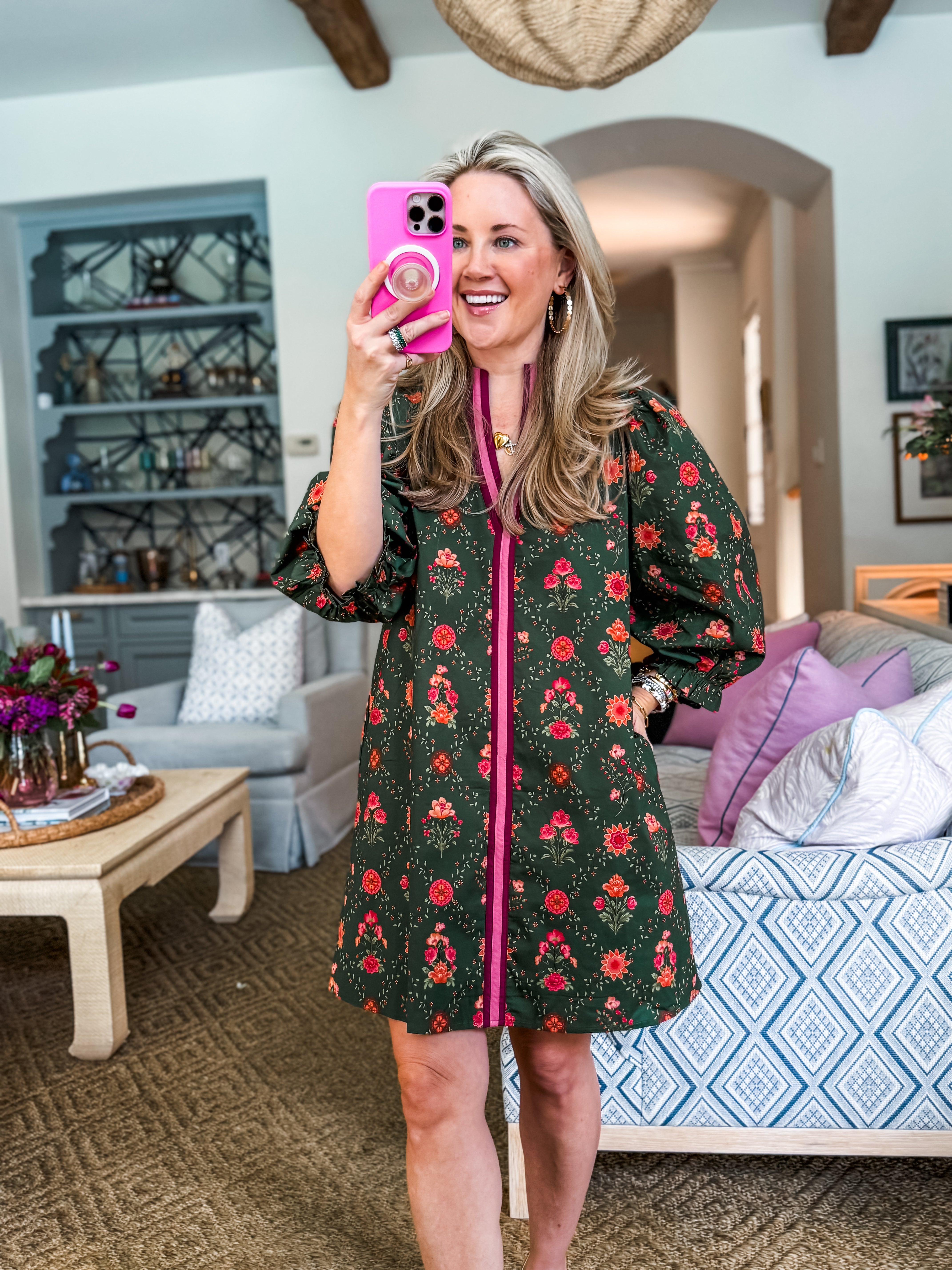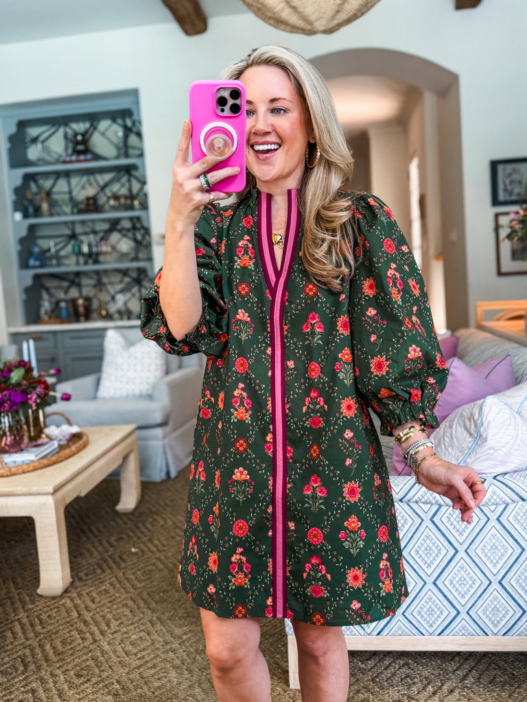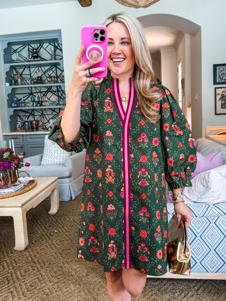 Floral Escape Mini Dress in Olive features a floral print with puffed 3/4 sleeves and a ruffled band collar. The V-neck is highlighted with a contrasting binding trim for added detail. It includes convenient side pockets and is fully lined for comfort. Made from lightweight woven fabric, the dress is non-sheer and perfect for everyday wear.