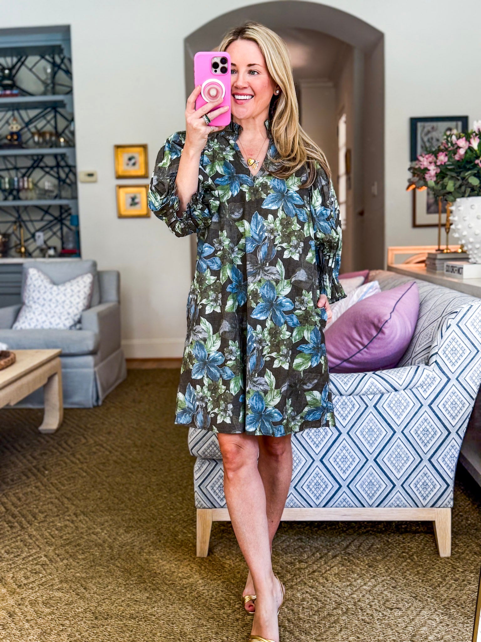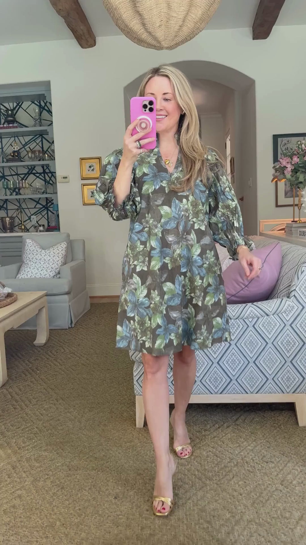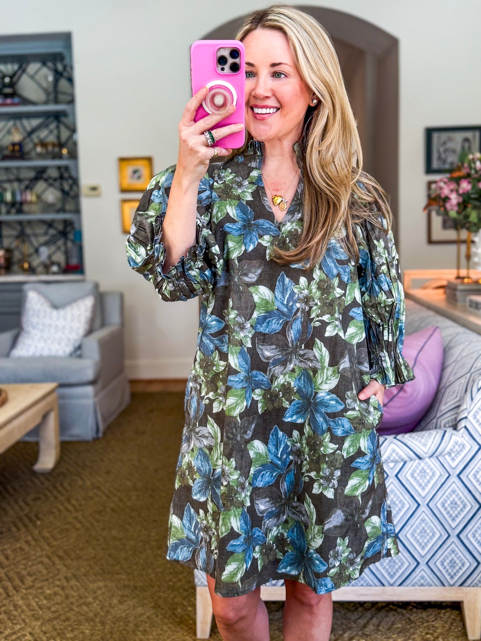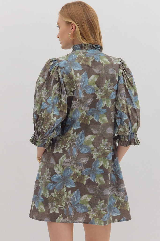Features: Botanical print elbow-length puff sleeve mini dress featuring pleated cuffs and ruffled accent neck band collar V-neck. Side pockets. Lined. Woven. Non-sheer. Lightweight.