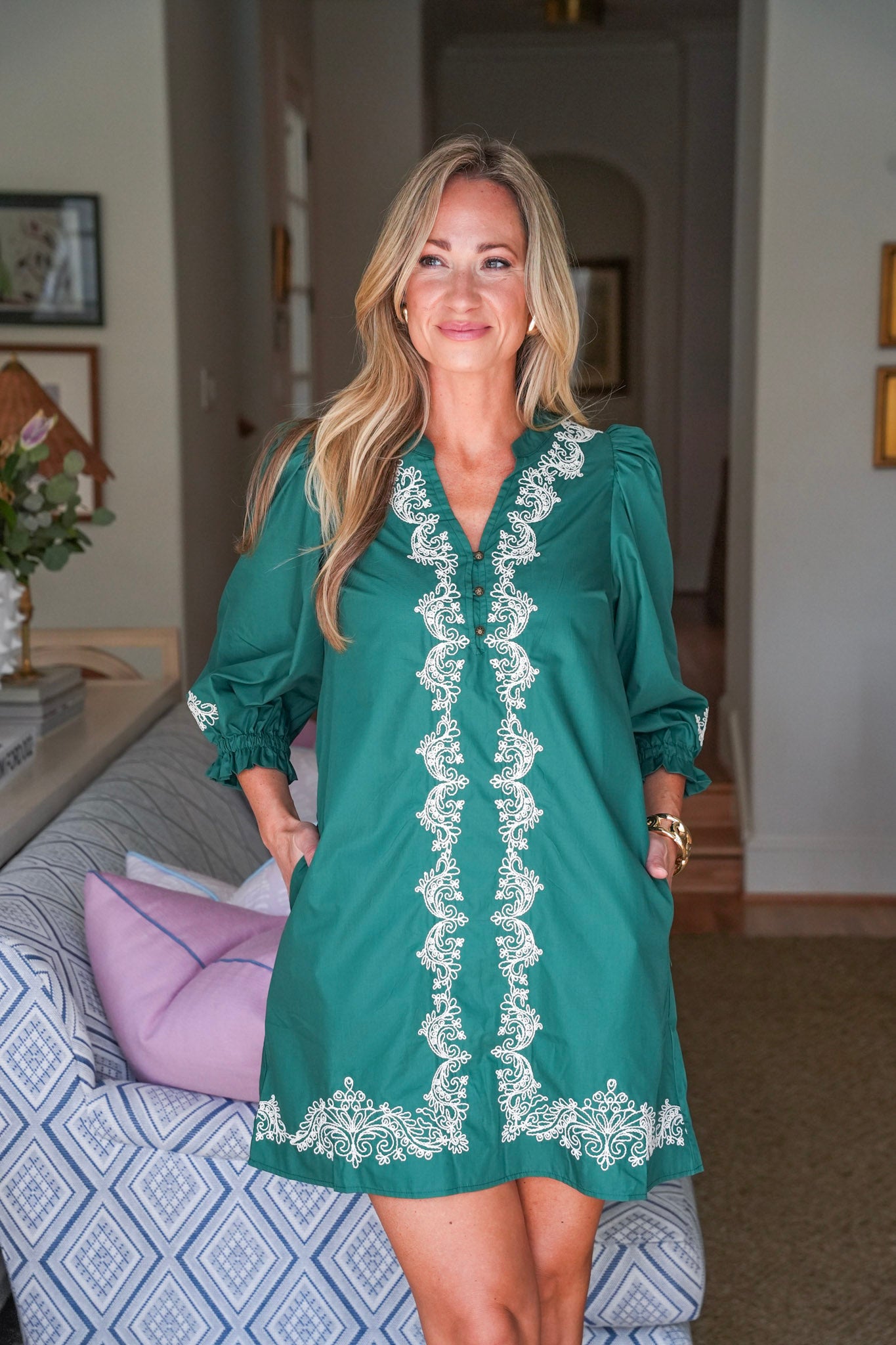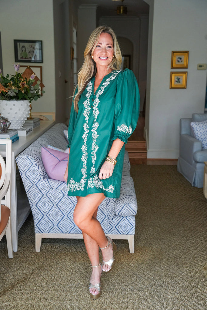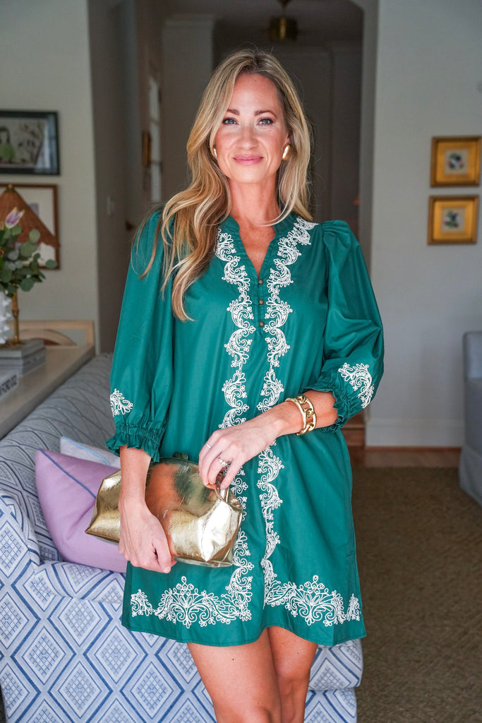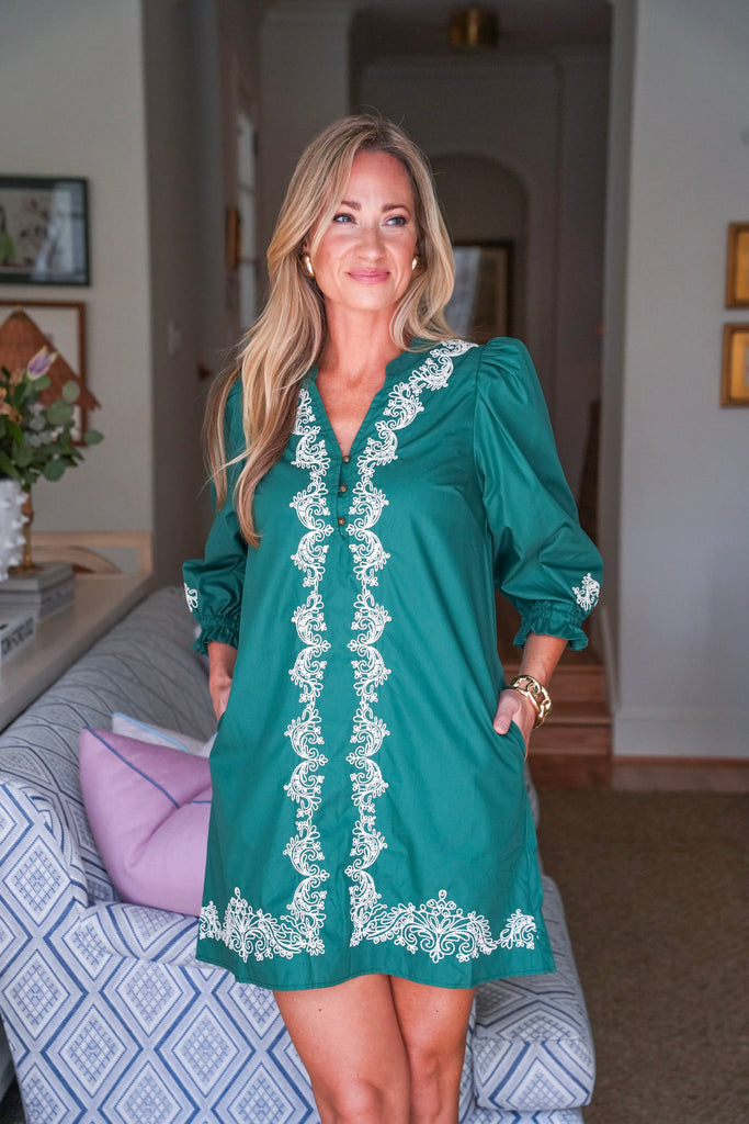 The Harmony Lane Mini Dress in green brings easy elegance to your everyday look. Embroidered detailing adds a touch of artistry, while the v-neck and 3/4 sleeves keep it flattering and fuss-free. Side pockets make it functional, and the lightweight woven fabric keeps it breezy. Perfect for Sunday brunch, running errands, or casual get-togethers.