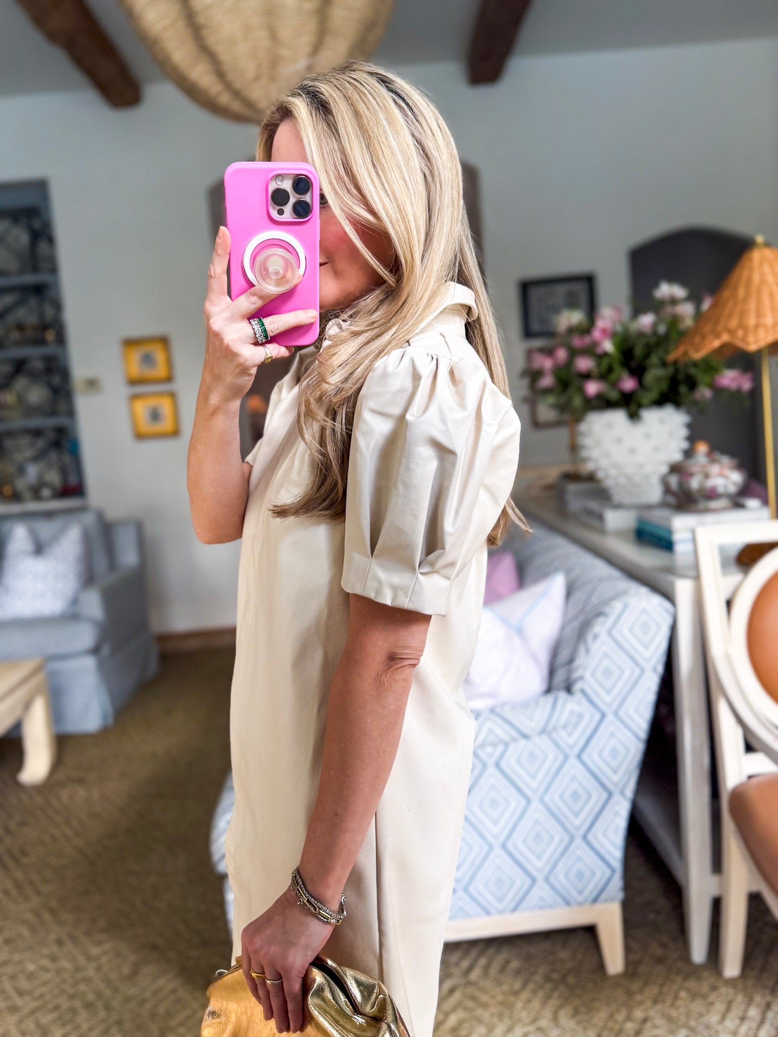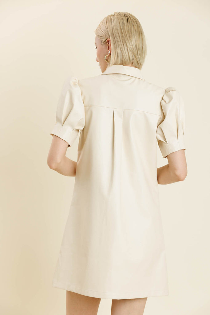 Meet your new statement piece: the Making Moves Mini Dress in ivory. With buttery soft vegan leather, a structured shirt collar, and playful puff sleeves, it’s a mix of edgy and polished. The ruched neckline flatters while keeping things chic. Perfect for cocktails, events, or that stylish dinner you’ve been waiting for.