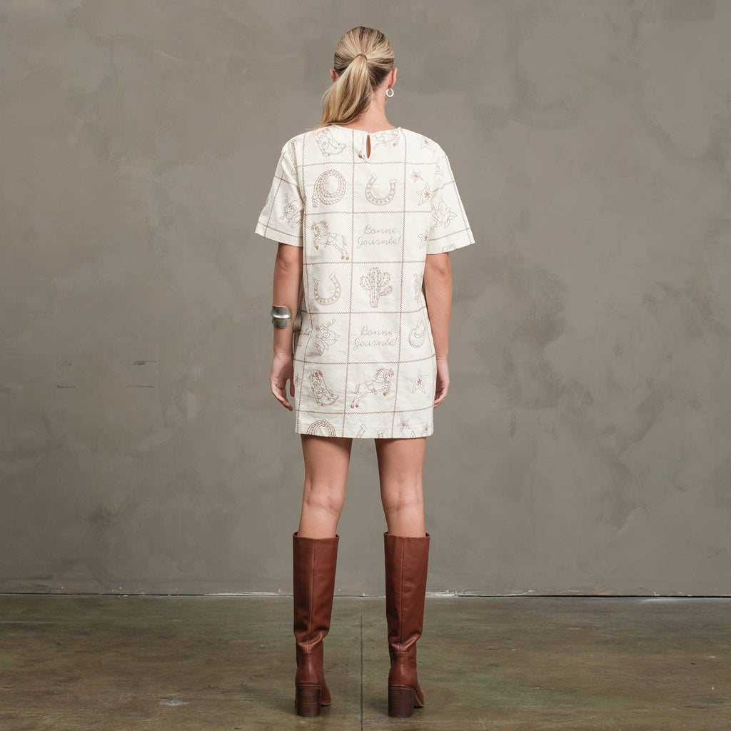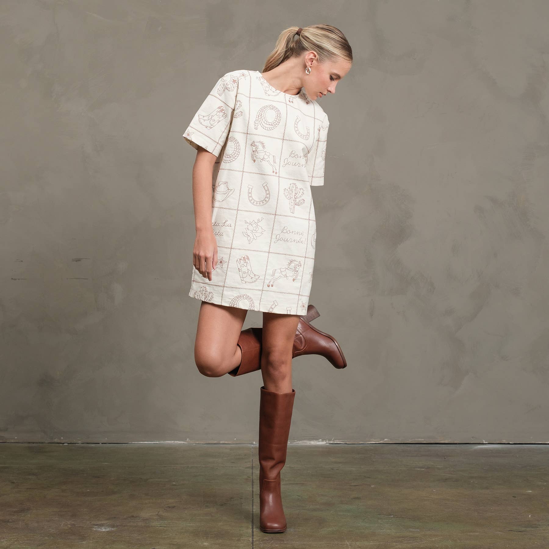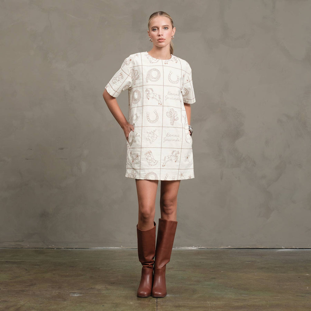 The Western Girl Embroidered Mini Dress in taupe brings playful charm with its custom Western sketch motifs. Made from soft cotton fabric with a relaxed crew neckline and handy side pockets, it’s as comfy as it is chic. Perfect for weekend brunches, casual Fridays at work, or strolls around town. This is the dress you’ll keep reaching for when effortless style is calling.
