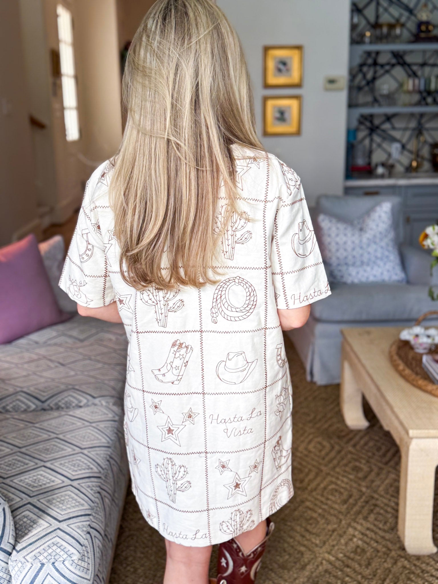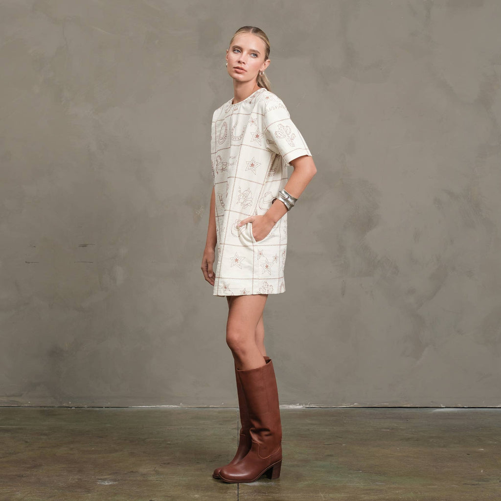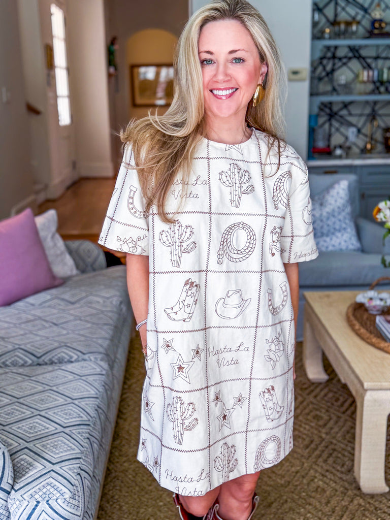 The Western Girl Embroidered Mini Dress in taupe brings playful charm with its custom Western sketch motifs. Made from soft cotton fabric with a relaxed crew neckline and handy side pockets, it’s as comfy as it is chic. Perfect for weekend brunches, casual Fridays at work, or strolls around town. This is the dress you’ll keep reaching for when effortless style is calling.