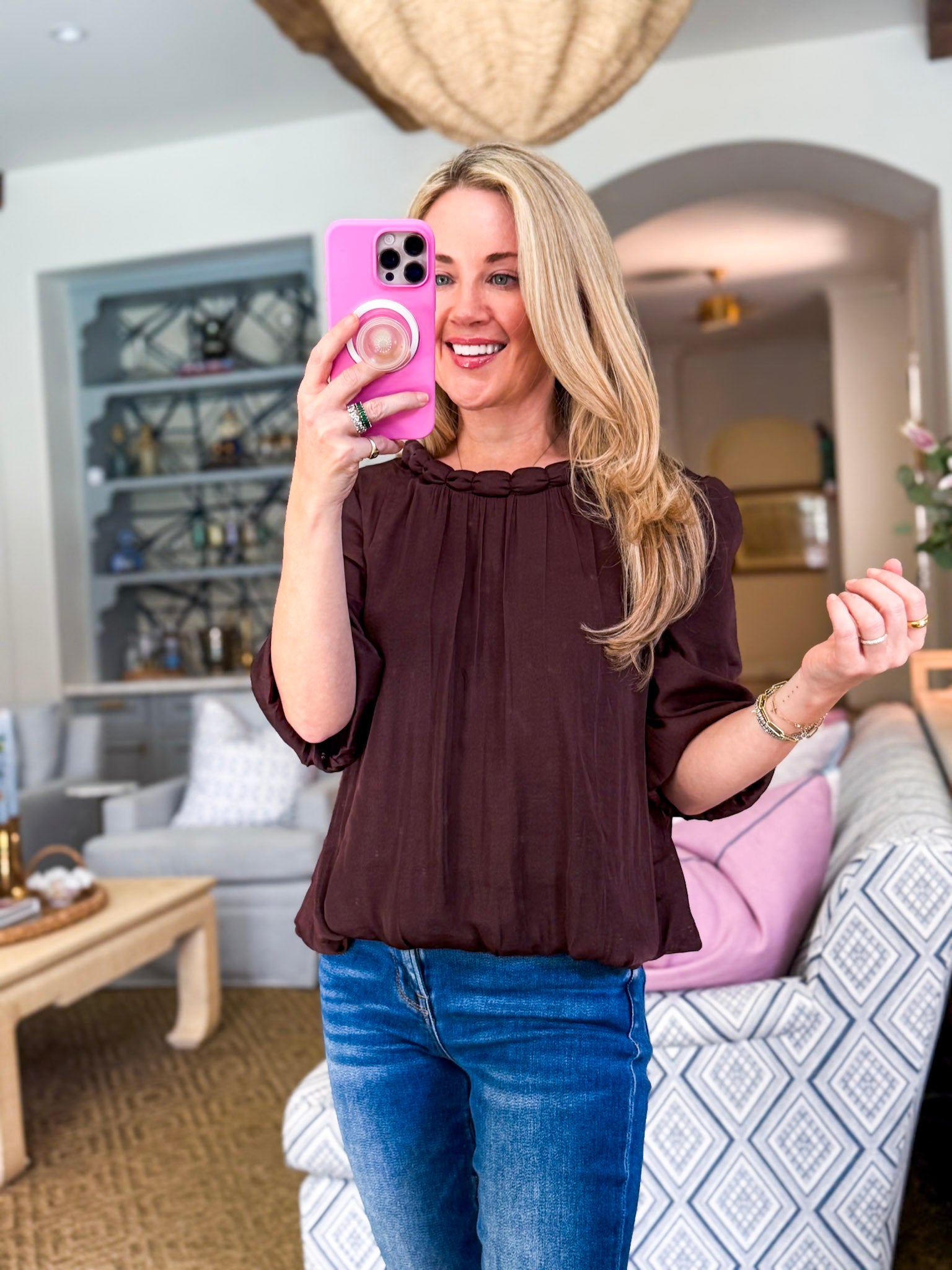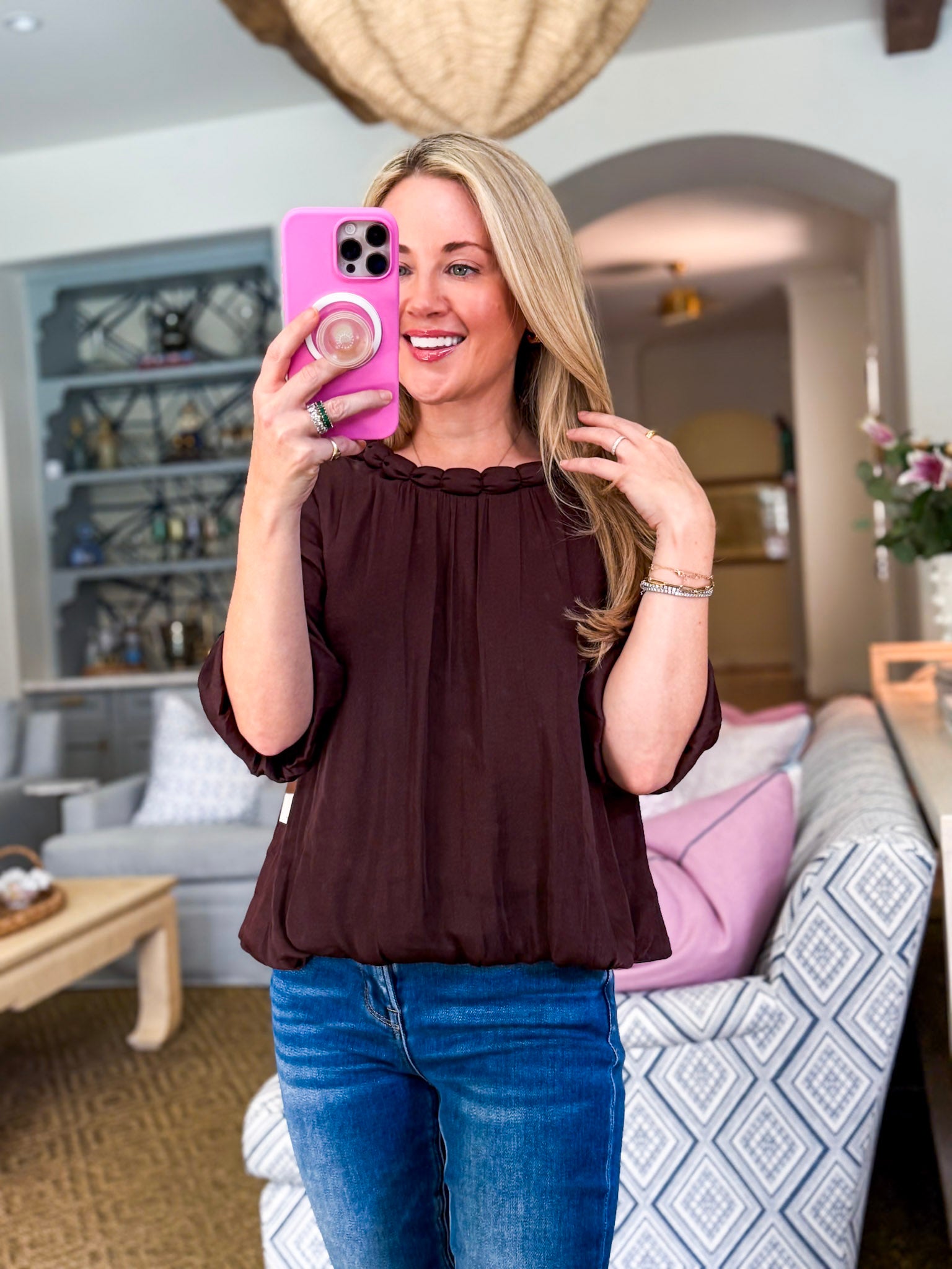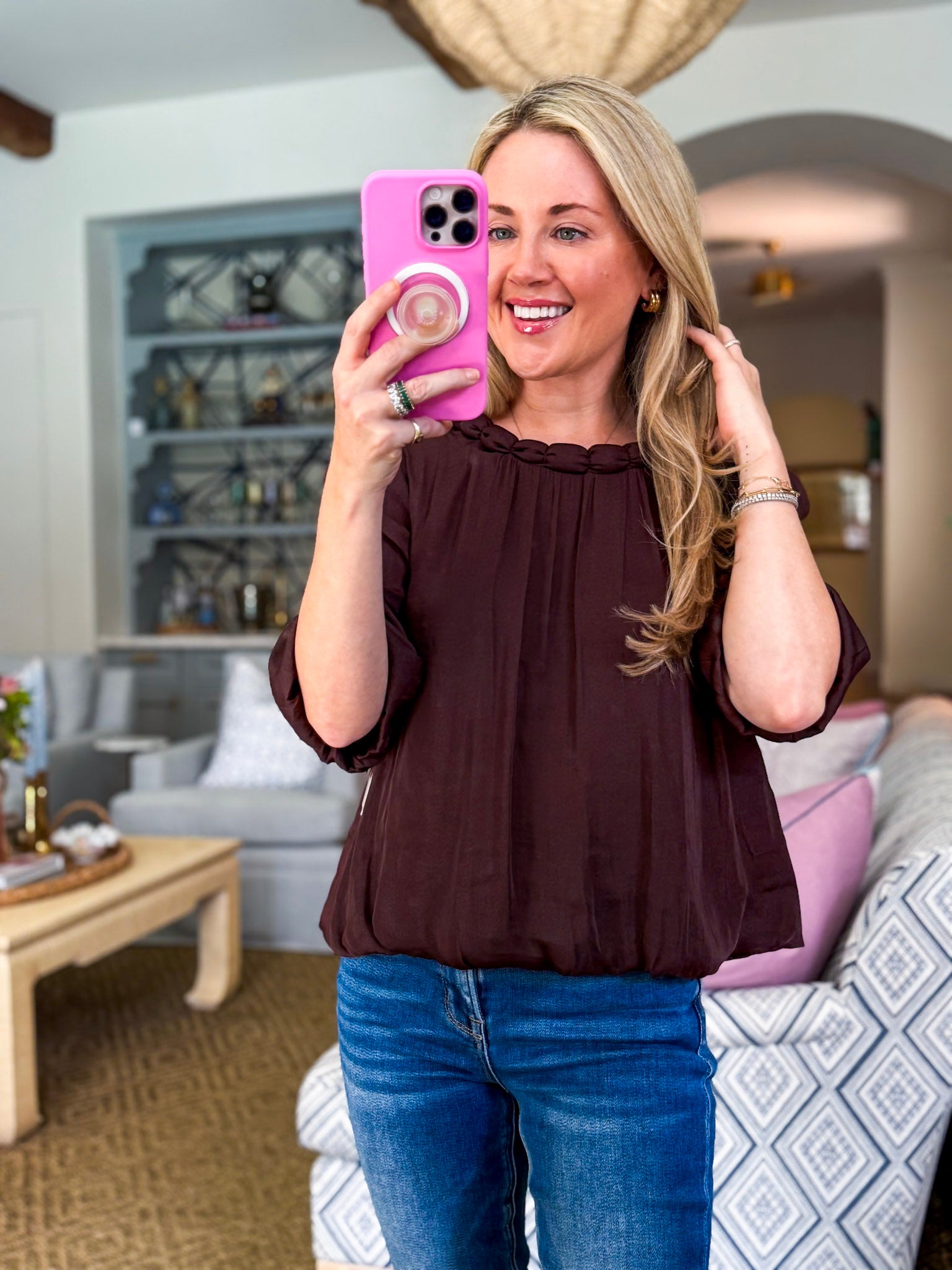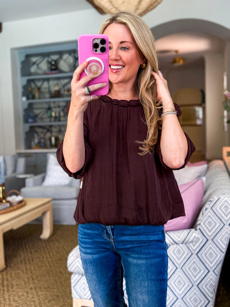 The City Mornings Top in chocolate is your answer to looking polished on even the busiest days. Crafted in a lightweight woven fabric with full lining, it gives a smooth, easy drape. The chic neckline detail and half bubble sleeves add subtle personality to your look. Style it with tailored pieces for meetings or with denim for relaxed evenings out.