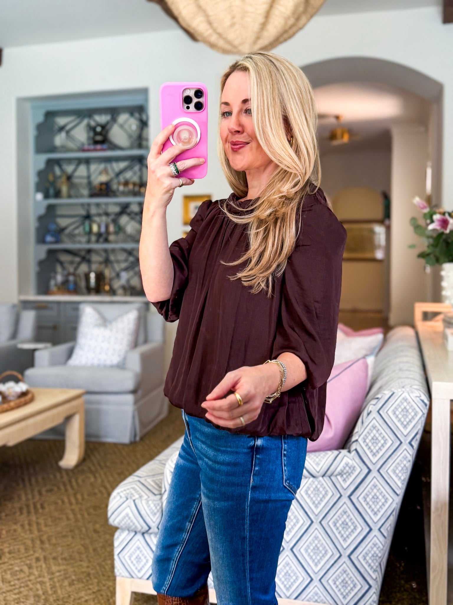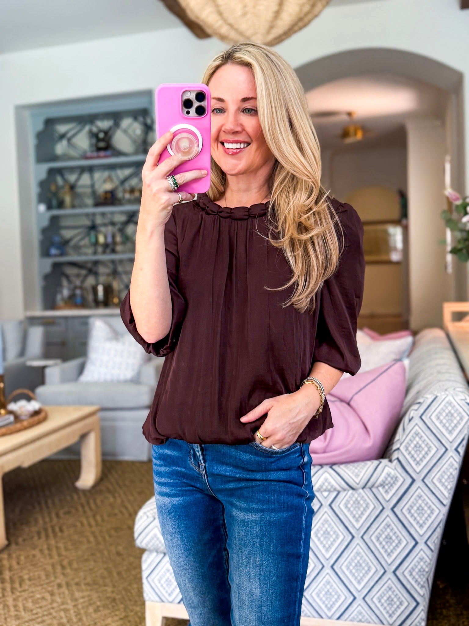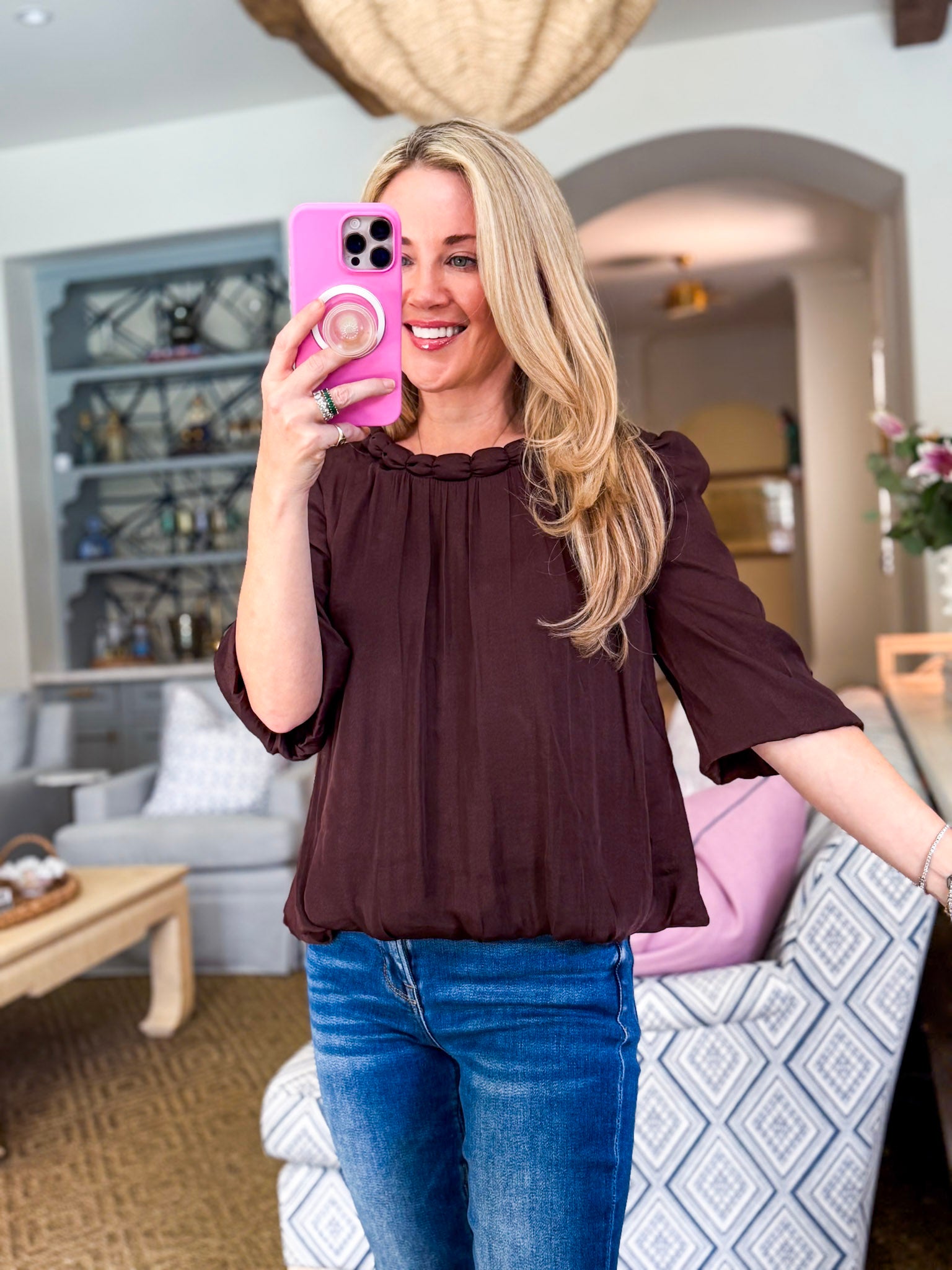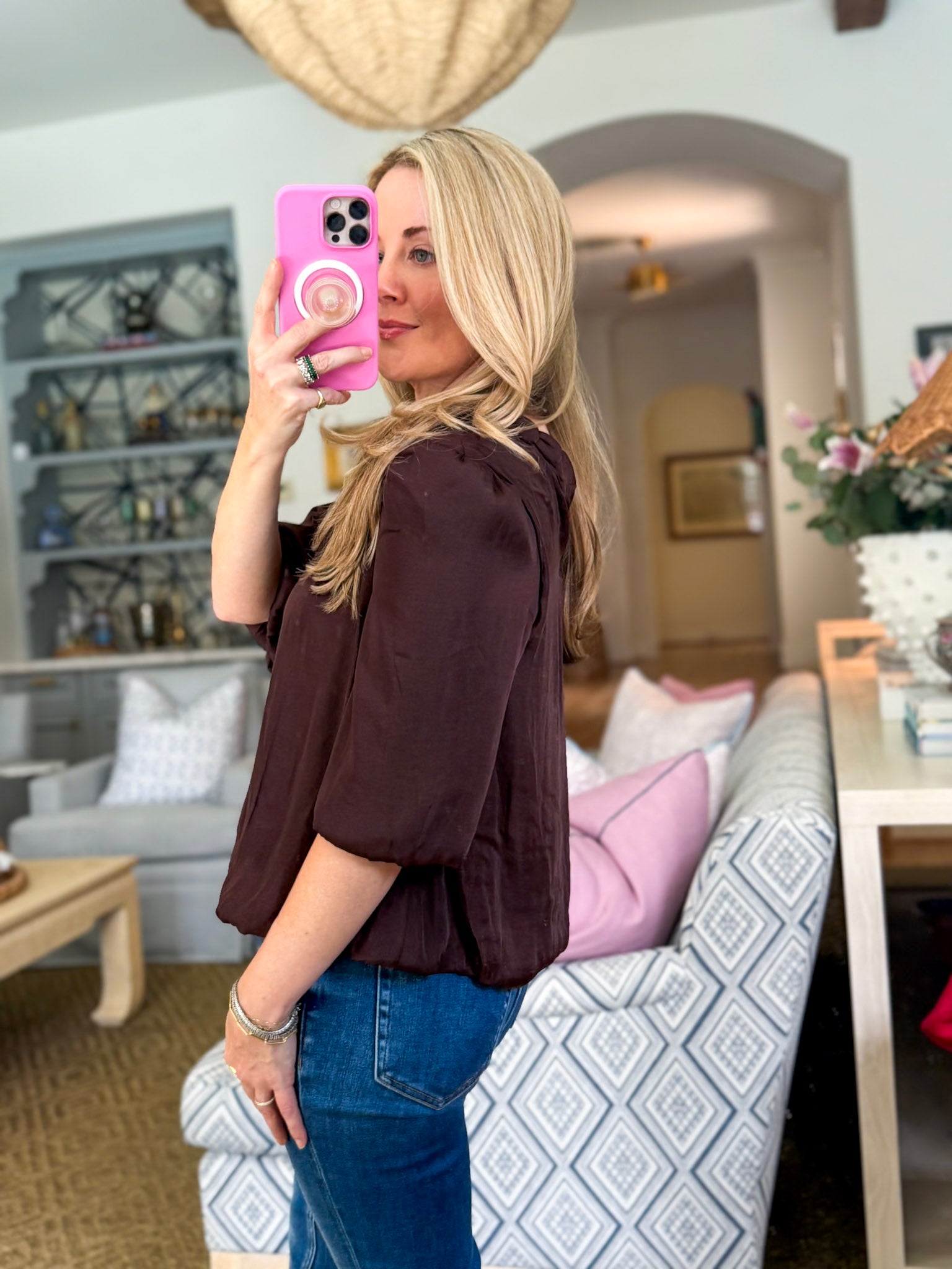 The City Mornings Top in chocolate is your answer to looking polished on even the busiest days. Crafted in a lightweight woven fabric with full lining, it gives a smooth, easy drape. The chic neckline detail and half bubble sleeves add subtle personality to your look. Style it with tailored pieces for meetings or with denim for relaxed evenings out.