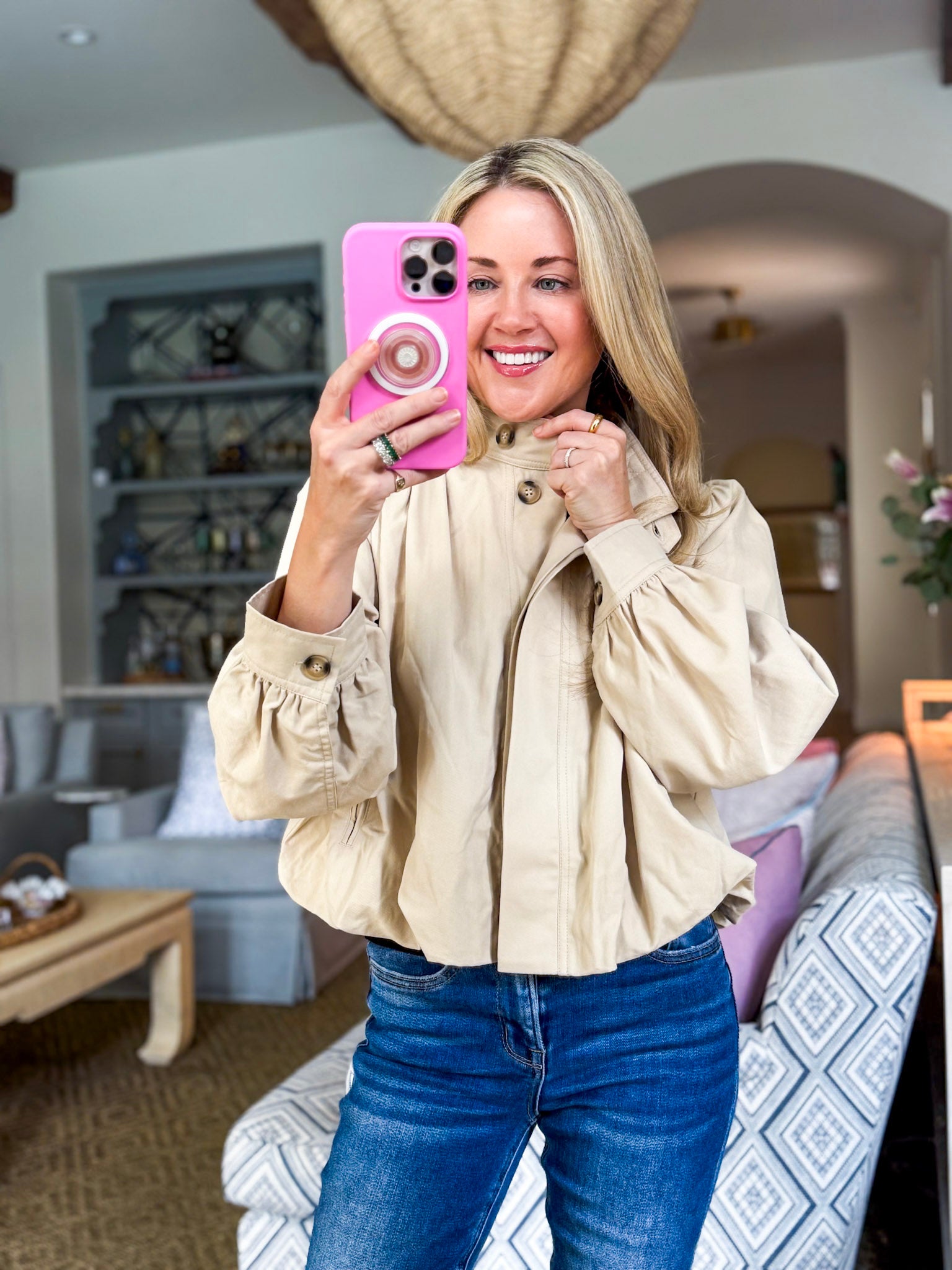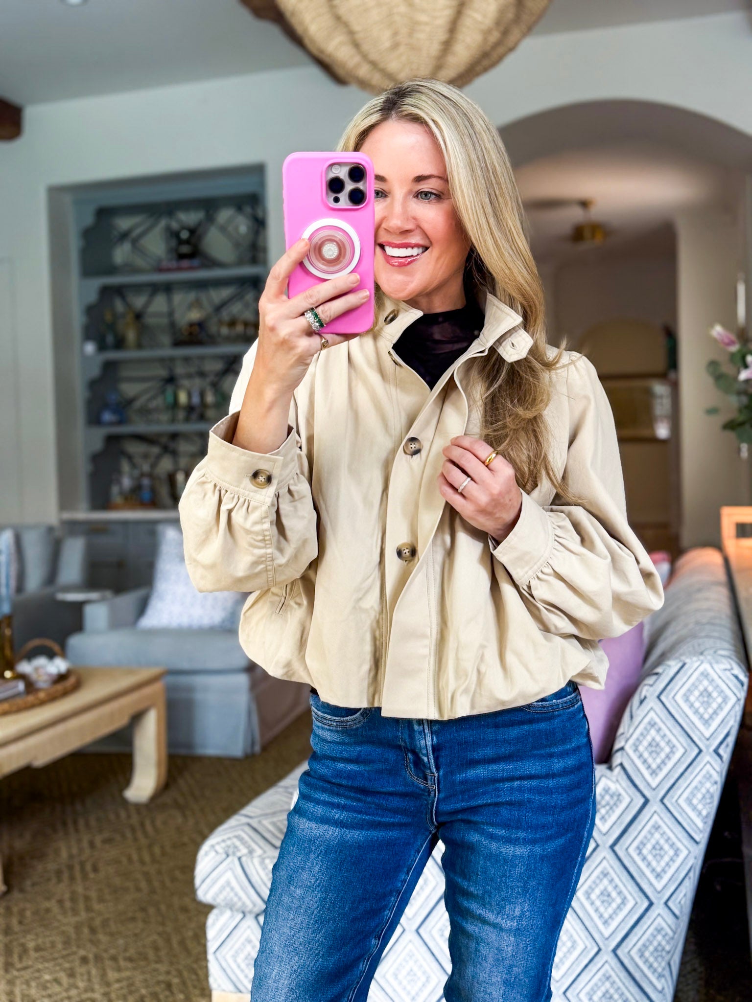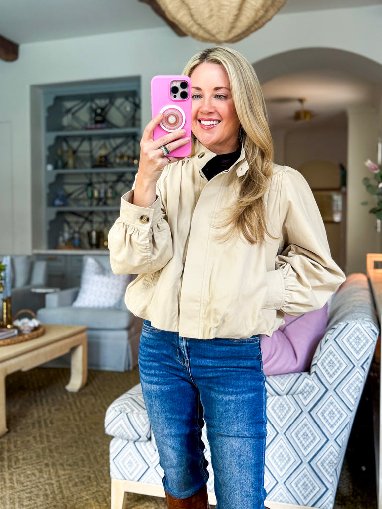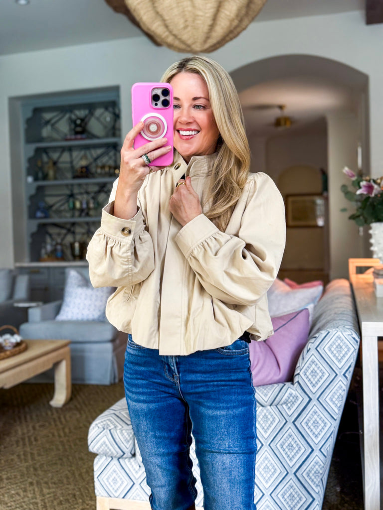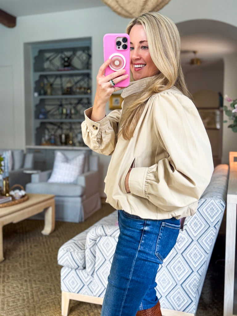 City Stroll Short Trench Coat in tan features a high neck and unique pleated detailing at the shoulders and cuffs, adding volume and structure to the silhouette. Puff sleeves enhance the dramatic yet feminine look, while the button down front offers versatile styling options.