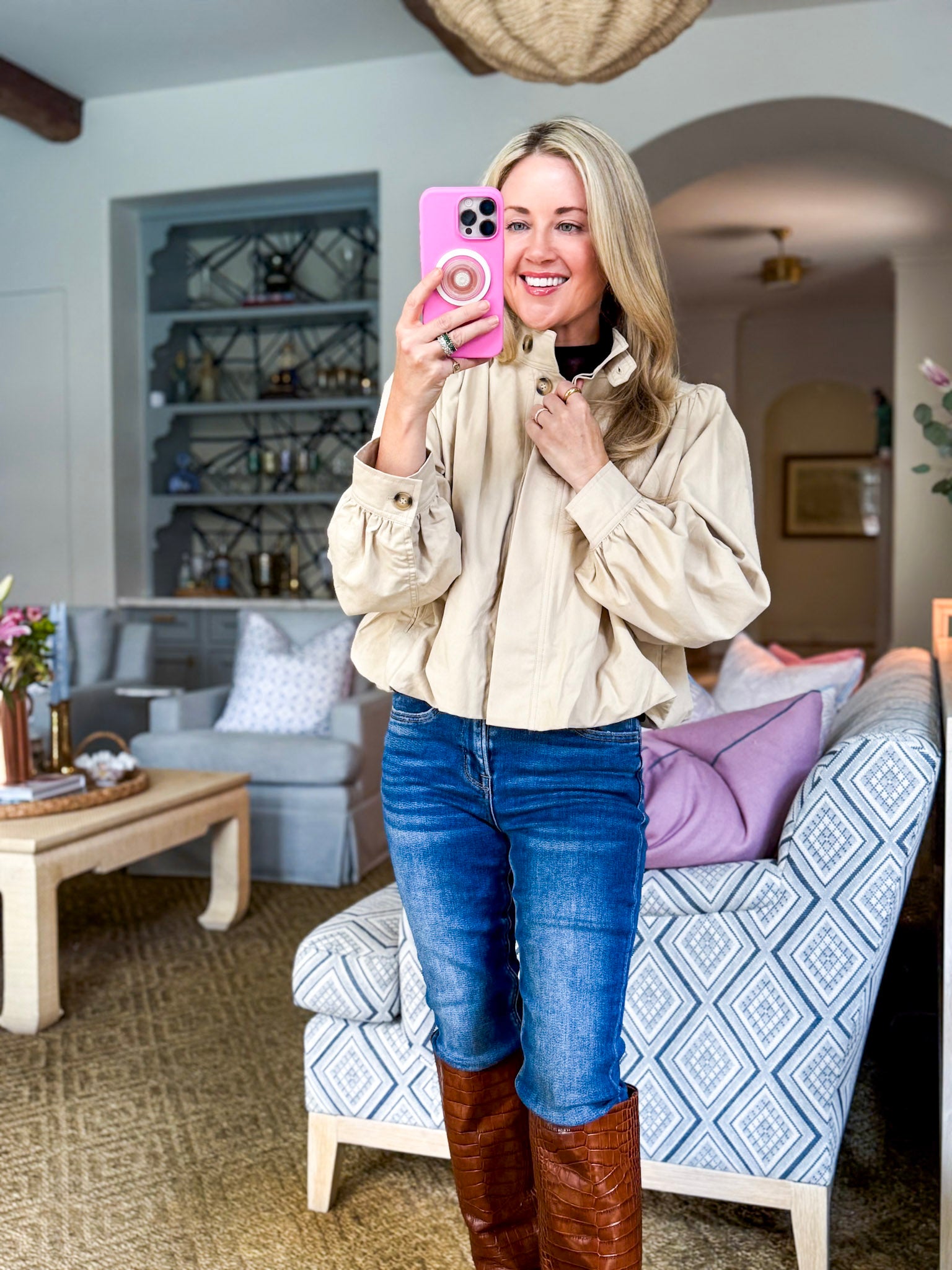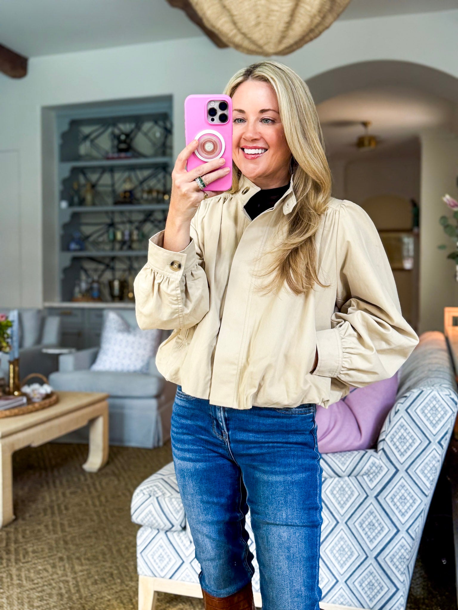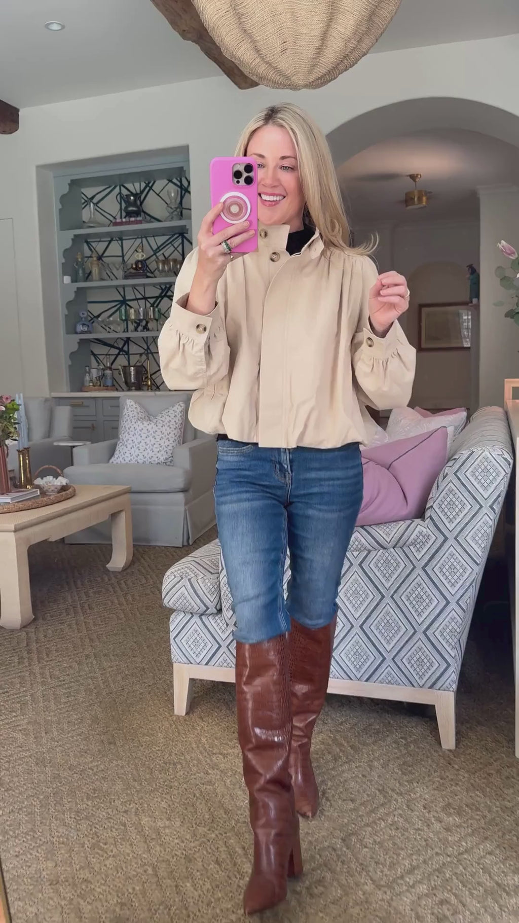 City Stroll Short Trench Coat in tan features a high neck and unique pleated detailing at the shoulders and cuffs, adding volume and structure to the silhouette. Puff sleeves enhance the dramatic yet feminine look, while the button down front offers versatile styling options.