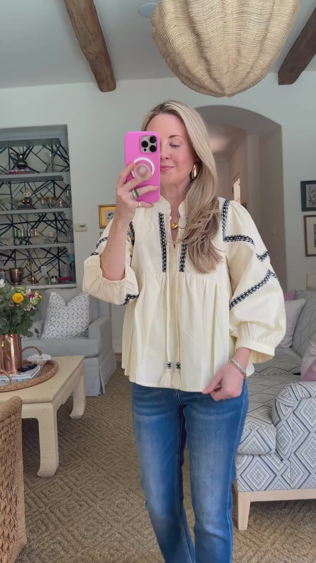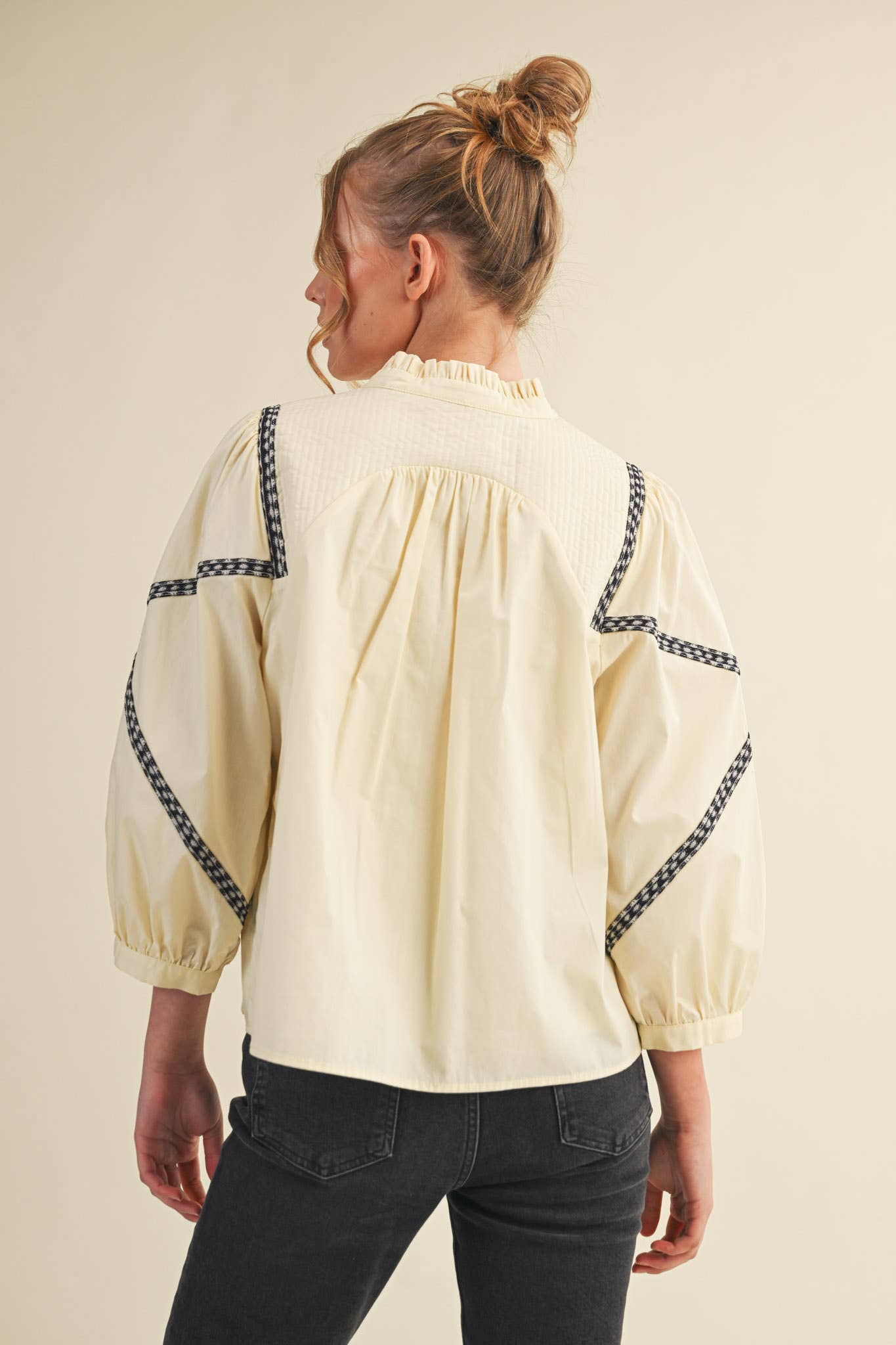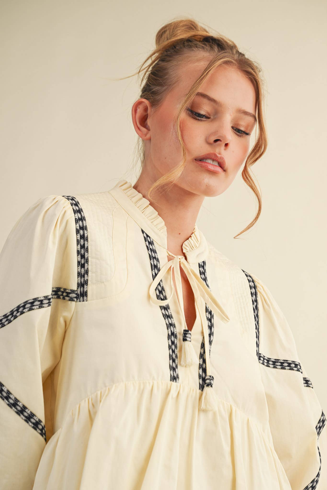 Features: Embroidery trim babydoll blouse, Ruffled neckline with notched V, Tying tassel detail, Seam detail on shoulders and back yoke, 3/4 length puff sleeves, Relaxed babydoll bodice, Embroidery trim detail on neckline and sleeves, Lined