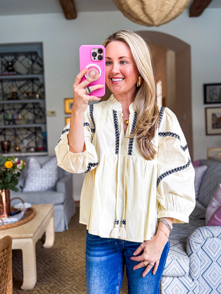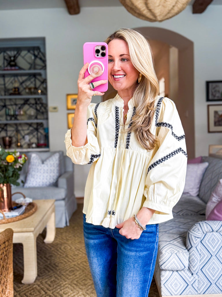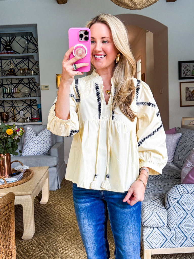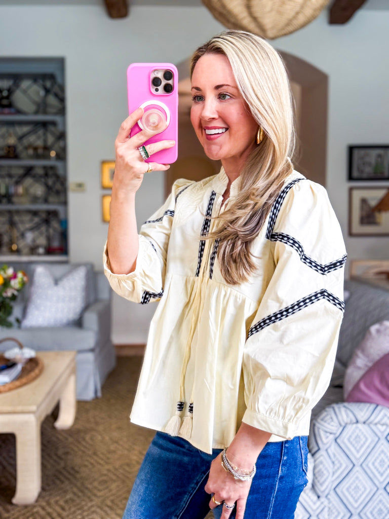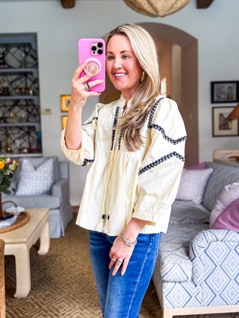 The Marfa Bound Embroidered Top in egg shell is the perfect mix of boho and chic. With its ruffled neckline, tassel ties, and pretty embroidery, this blouse gives you that effortless, free-spirited vibe. The relaxed babydoll fit keeps it comfy, while the puff sleeves add a touch of charm. Wear it to brunch, casual Fridays, or weekend strolls and feel instantly put together.