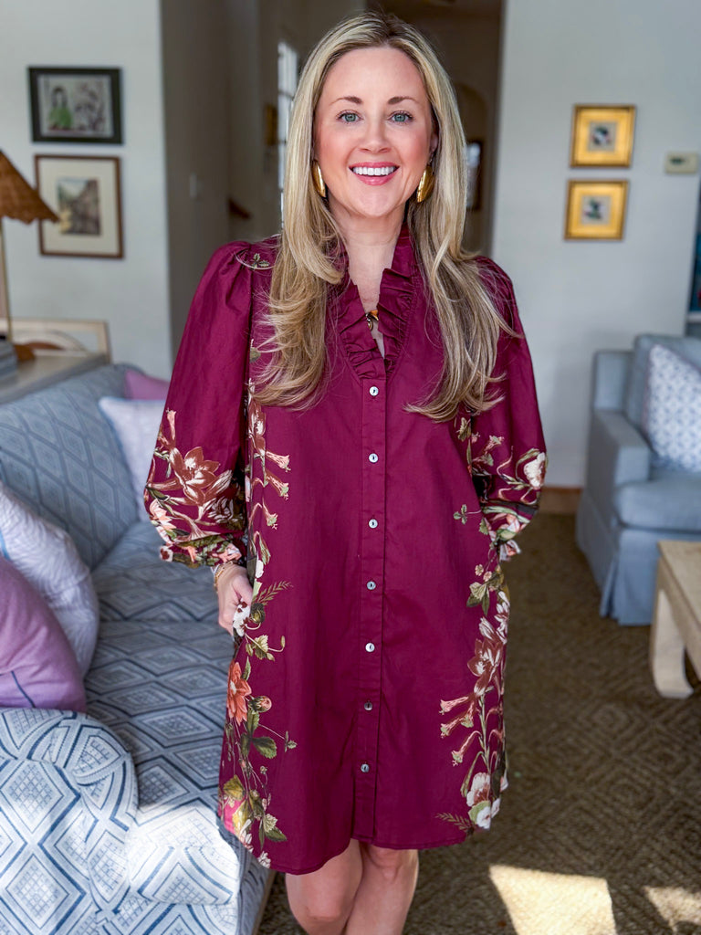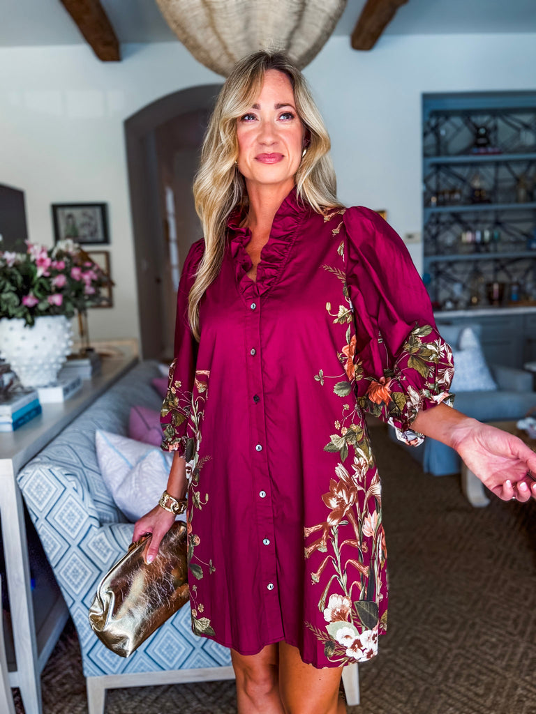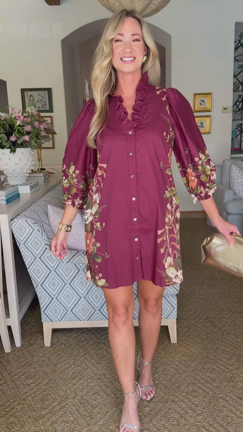 Feminine and flirty, the Crimson Petal Mini Dress in burgundy is a closet must have for the season. Its botanical print and ruffle detail give it a sweet yet polished vibe that works for everything from garden strolls to weekend getaways. Lightweight and lined, it’s perfect for all-day wear. Add simple jewelry and let the dress do the talking.