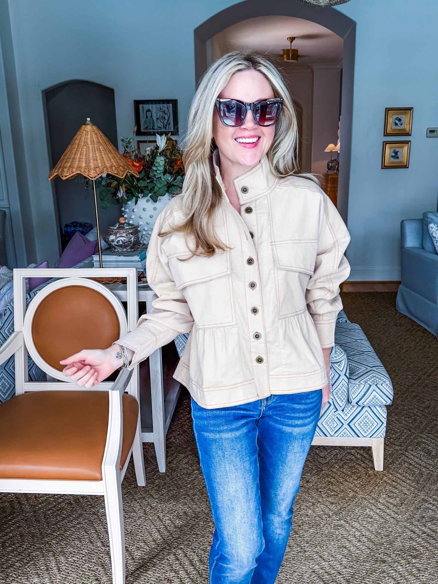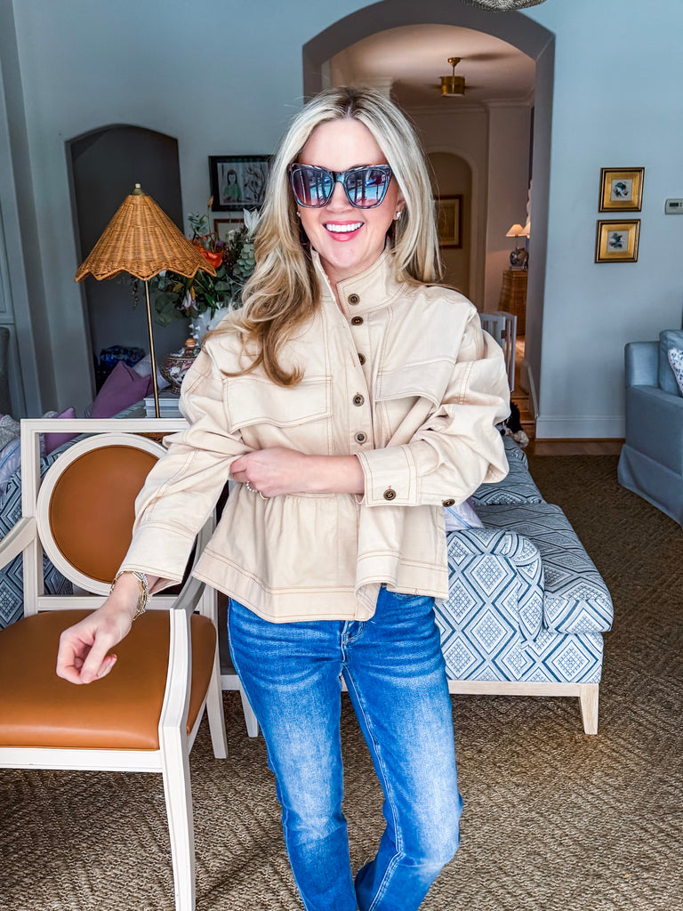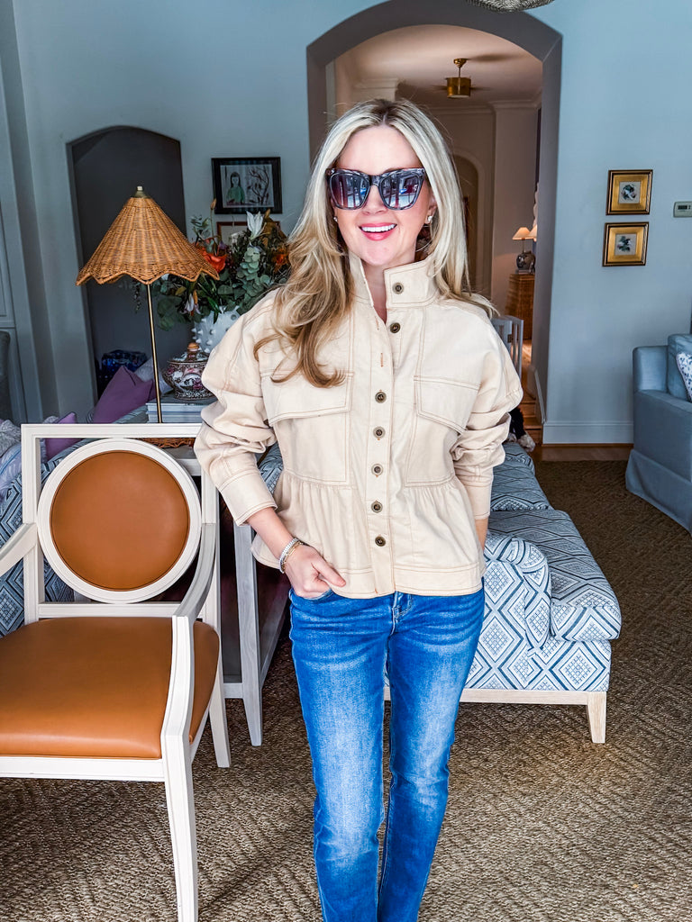Cute in Corduroy Babydoll Jacket in stone is your new go-to layer! Featuring a charming mock neck and eye-catching stitching details, it's the perfect blend of cozy and cute. The classic button-up design makes it easy to style over anything in your wardrobe. Whether you're dressing up or keeping it casual, this playful piece adds instant personality to any outfit.
