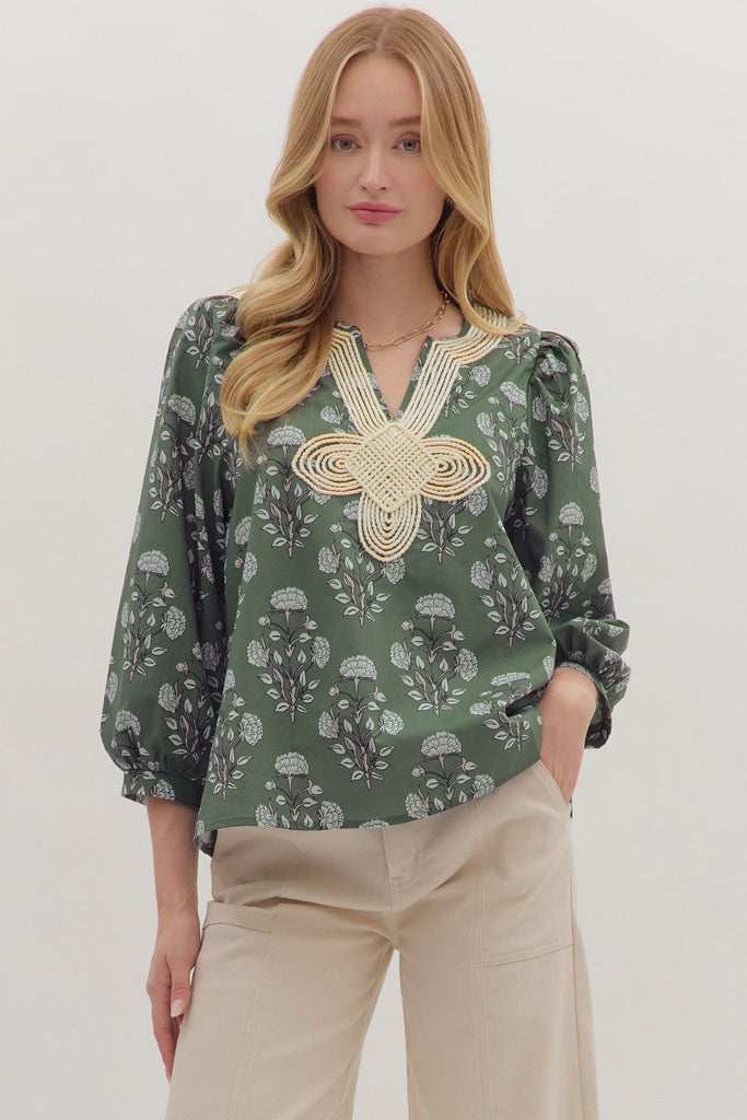 Features: Floral print long puff sleeve top featuring contrast embroidered knot trim V-neck. Unlined. Woven. Non-sheer. Lightweight.