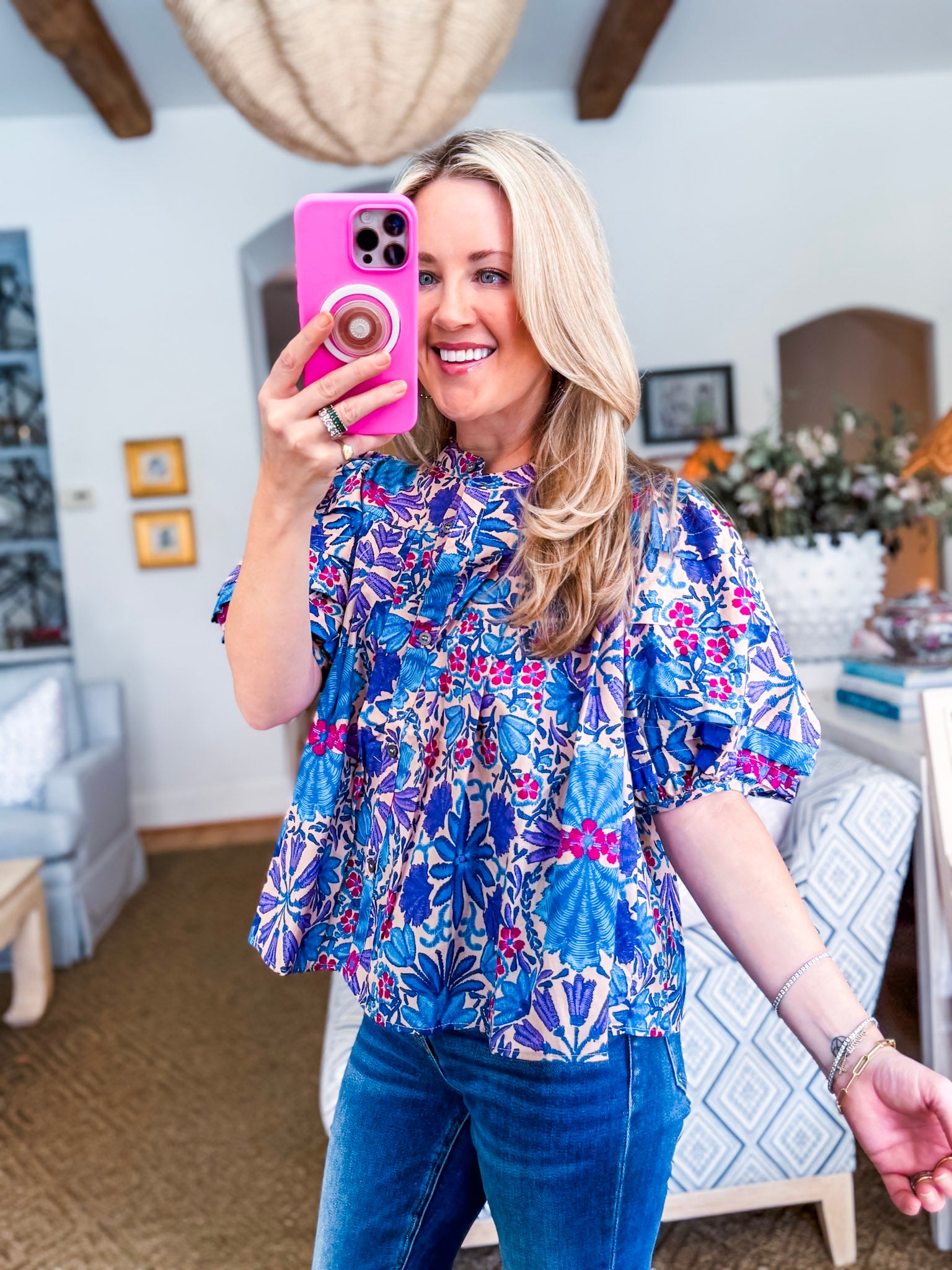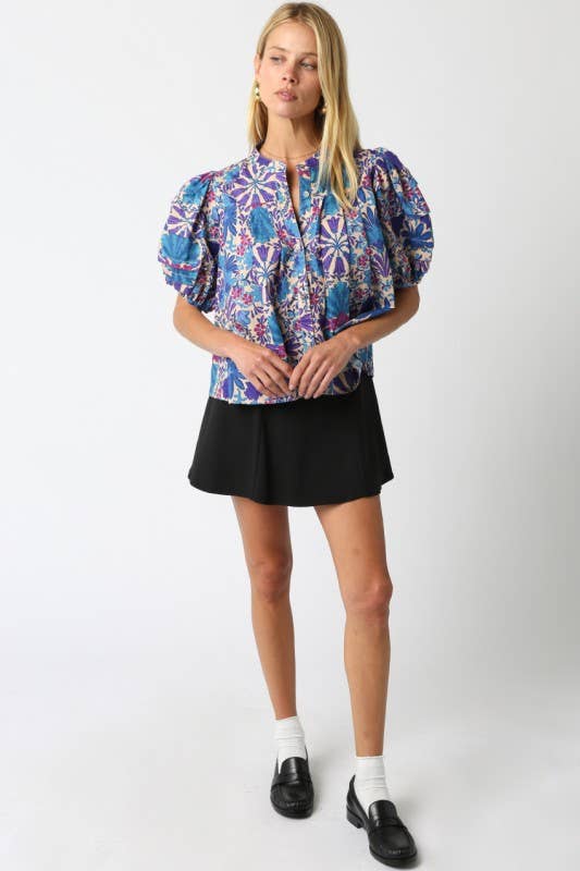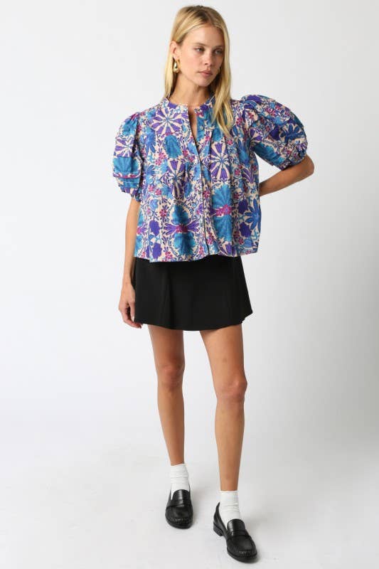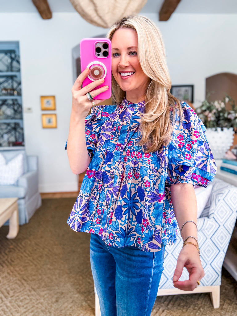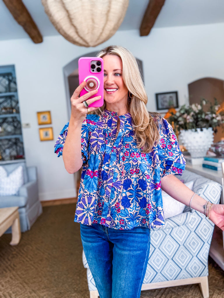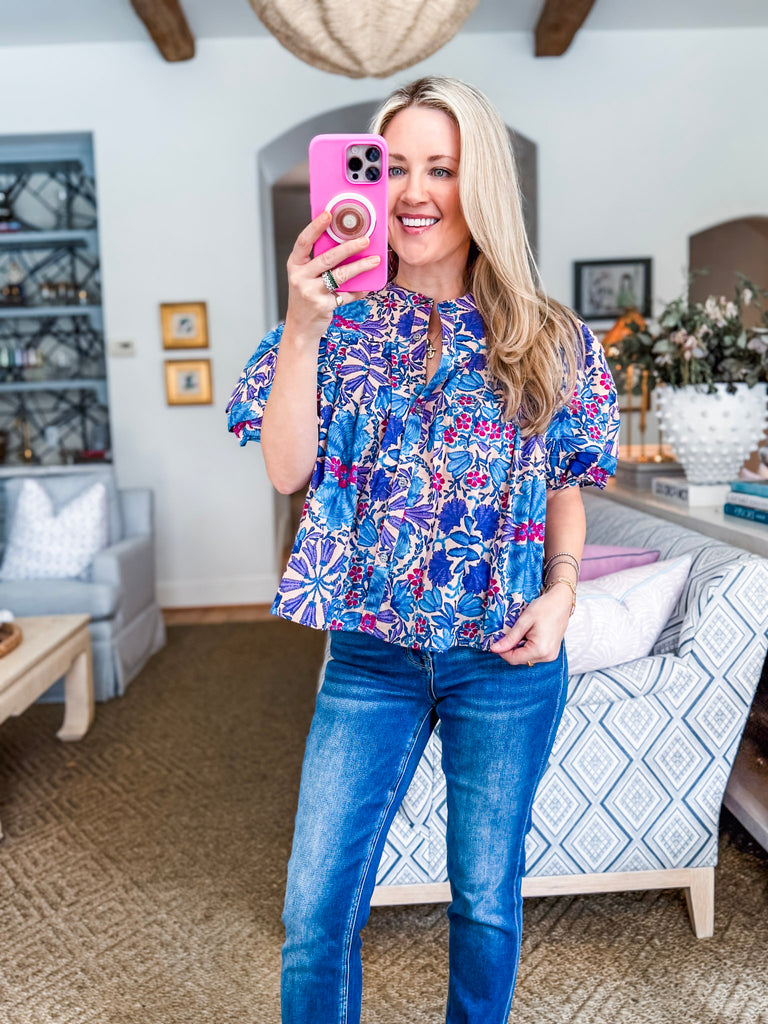 The Parker Poise Floral Top in cream and purple brings effortless charm with its bubble sleeves and dainty button-down detail. The soft woven fabric gives that polished yet comfy feel you’ll love from brunch to office days. Pair it with jeans for an easy weekend look or tuck it into slacks for something more refined. It’s that perfect mix of feminine and fun!