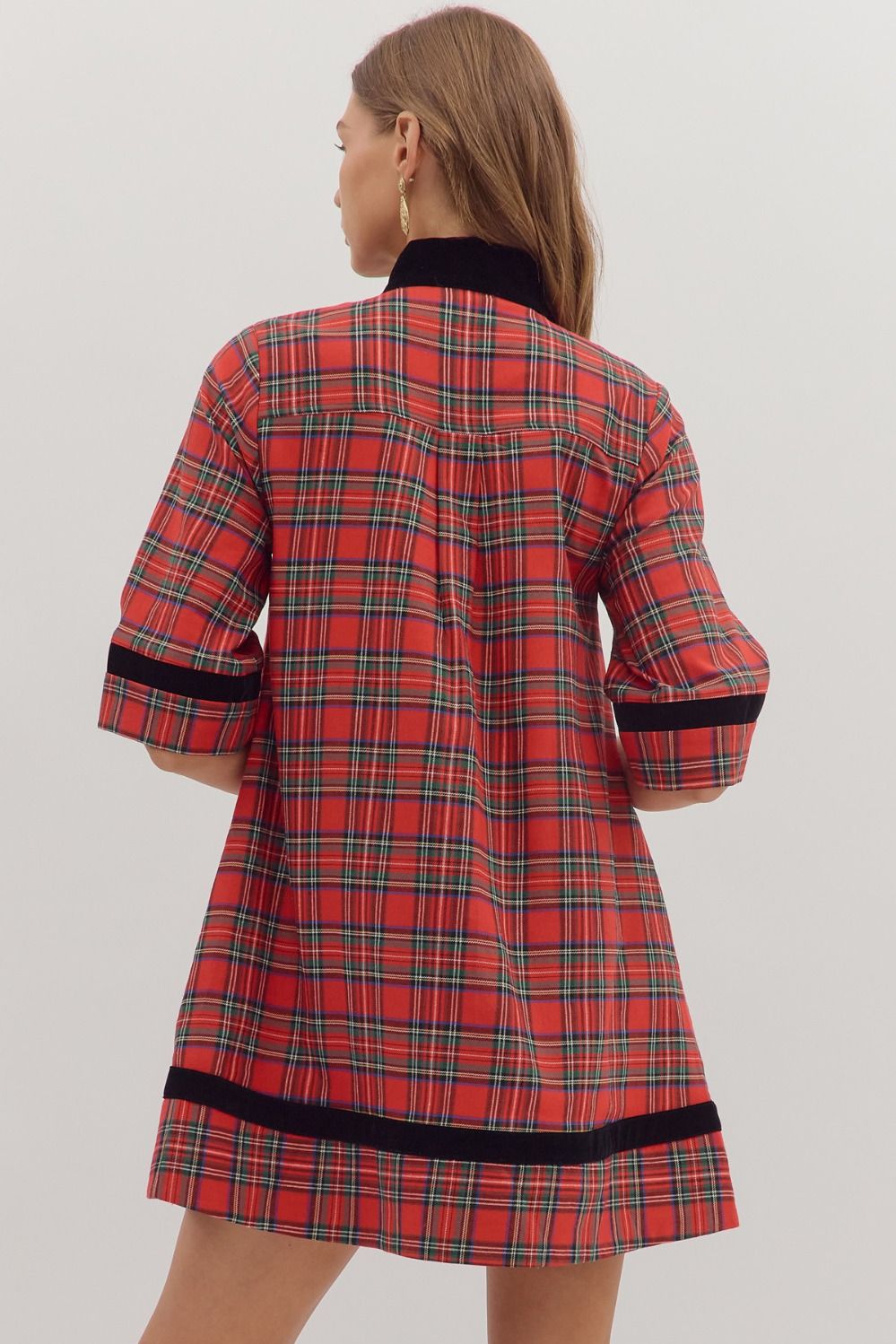 Holiday Cheer Plaid Mini Dress in red brings holiday style with its charming 3/4 sleeves and split neckline finished in contrasting velvet trim. Practical side pockets keep your essentials close, while the fully lined interior ensures comfort and coverage. Made from lightweight woven fabric that's never sheer, it's the perfect go-to piece for seasonal celebrations and gatherings.