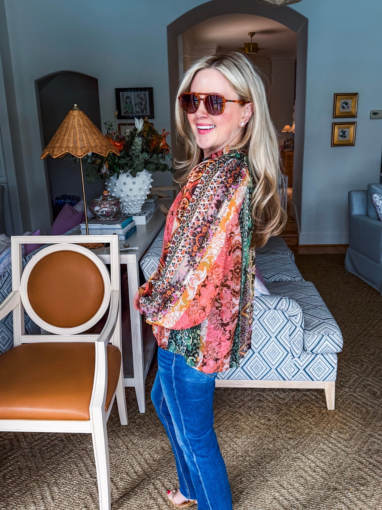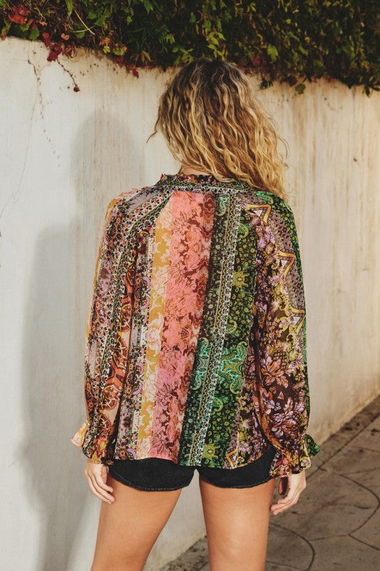 Let your energy flow with Serene Energy Boho Floral Top in multi that is perfect for the free-spirited fashionista. With a front button closure, playful flounce sleeves, and a whimsical ruffled collar with a slim tie at the neckline, this top is sure to bring some serene vibes to your wardrobe. Unlined and semi sheer
