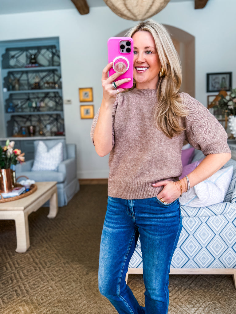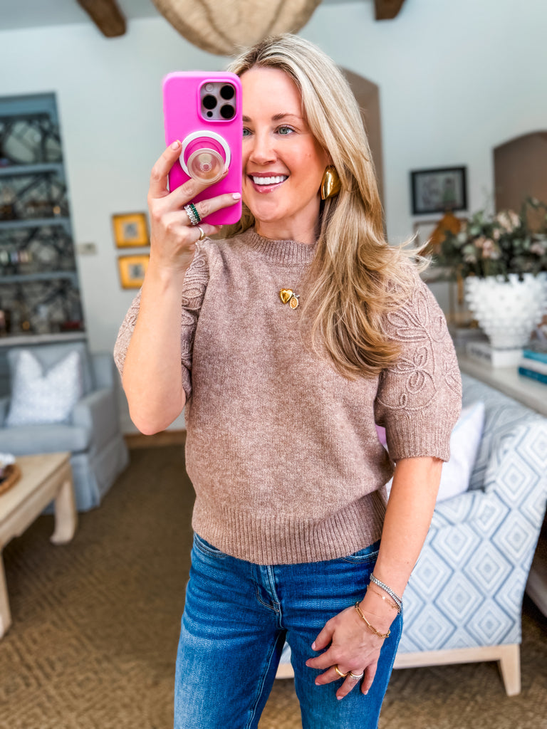 Simple yet striking, the Soft Details Knit Sweater in mocha is made for women who love style with ease. The puff sleeves and tonal embroidery give this top just the right amount of personality. Pair it with jeans for everyday errands or tuck it into a skirt for date night. Medium weight and non-sheer, it’s perfect for year-round wear.