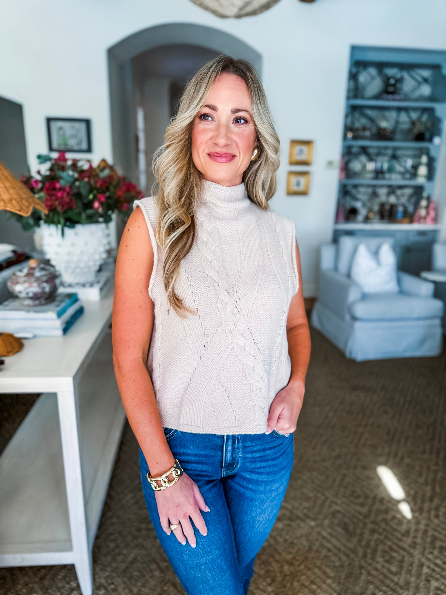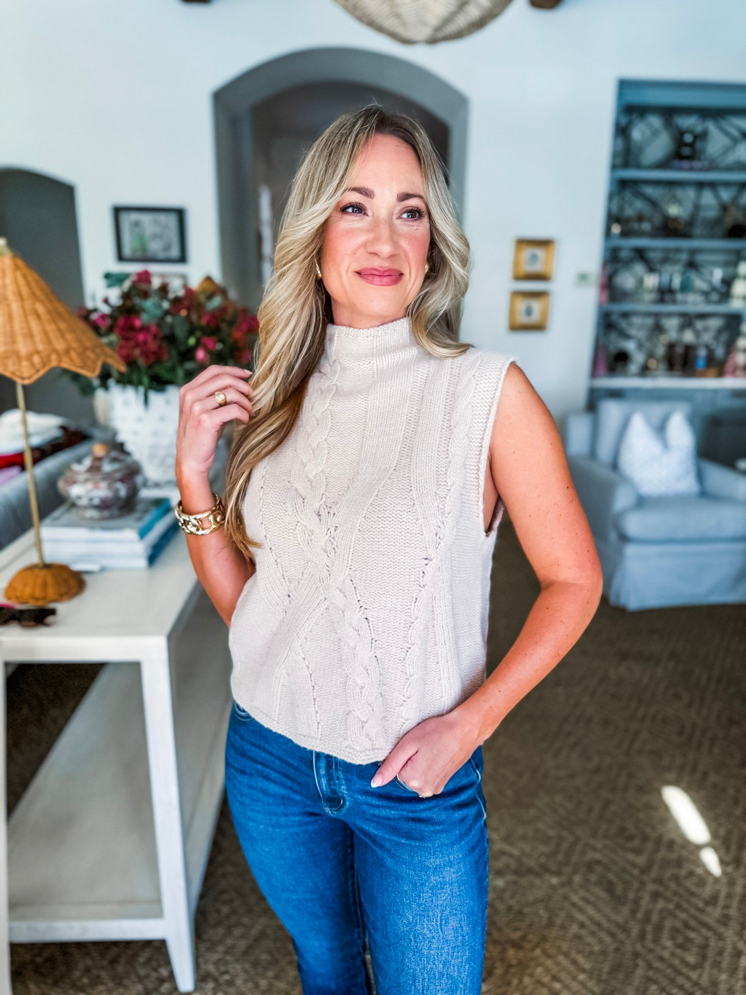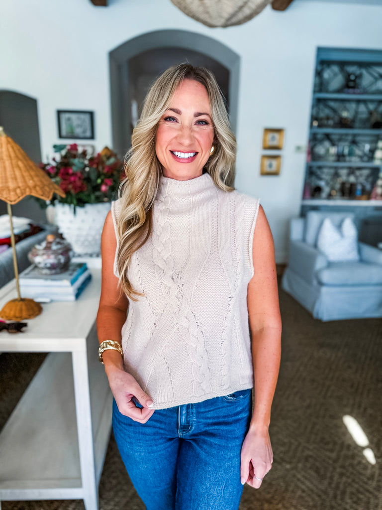 Meet your new style obsession — the Cult Classic Mock Neck Sweater in oatmeal! This sleeveless knit beauty shows off a timeless cable texture that’s as chic as it is comfy. Perfect for layering under blazers or wearing solo with denim vibe. From coffee runs to casual Fridays, this one’s a keeper.
