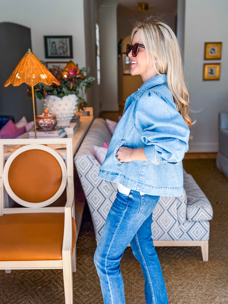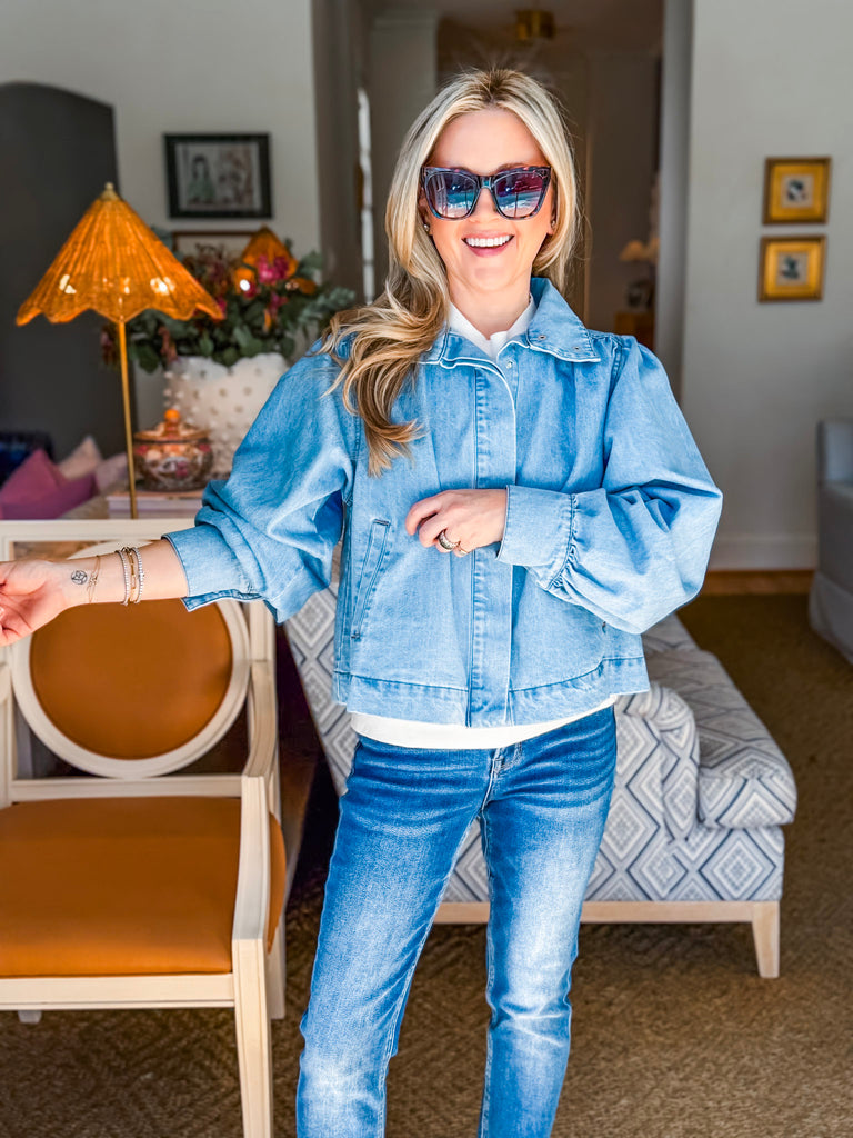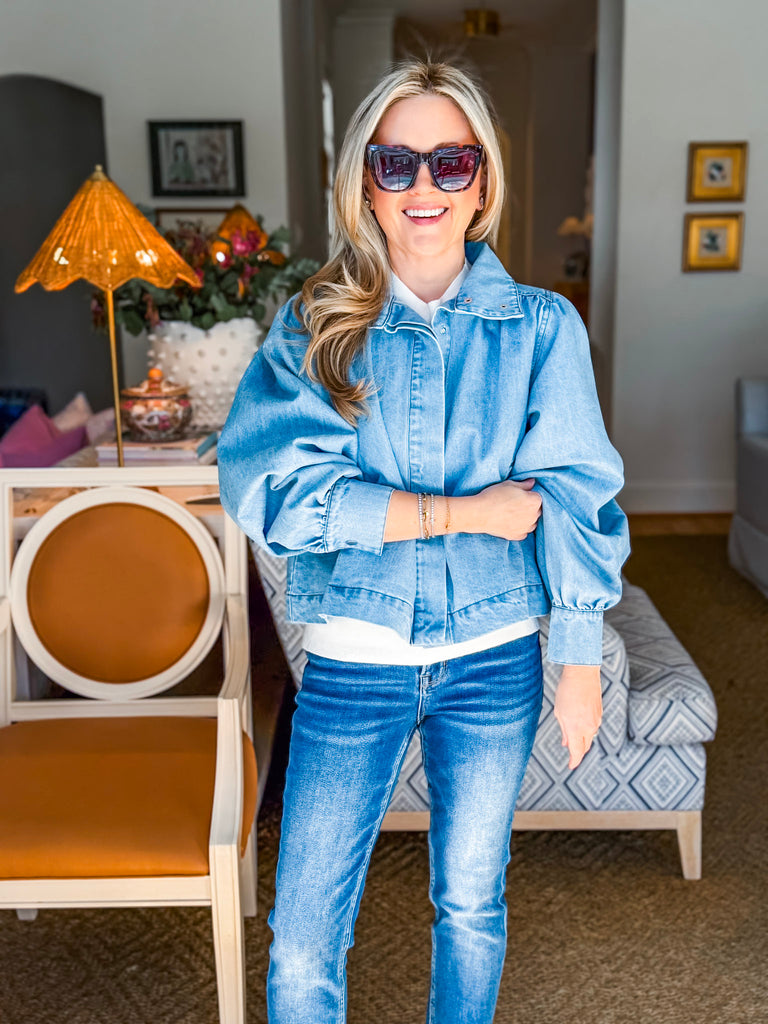 This isn't your average denim jacket! Deep Thinking Denim Jacket is a statement piece that means business (and fun). The high collar with snap buttons gives you serious attitude, while gathered puff sleeves add a touch of drama and dimension. The back yoke shirring creates that coveted soft, voluminous look that feels as good as it looks. Practical side welt pockets keep your essentials close. Perfect for anyone ready to turn heads and spark conversations.