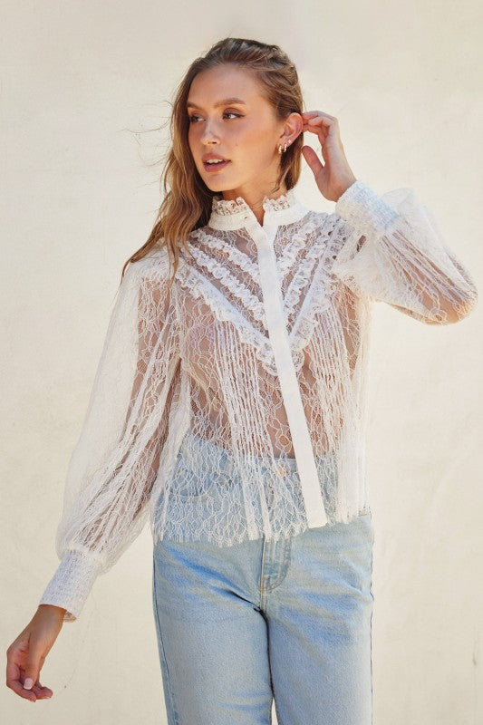 Features: Frilly Lace Structured Shoulder Blouse. Sheer. Not lined. Camisole sold separately.
