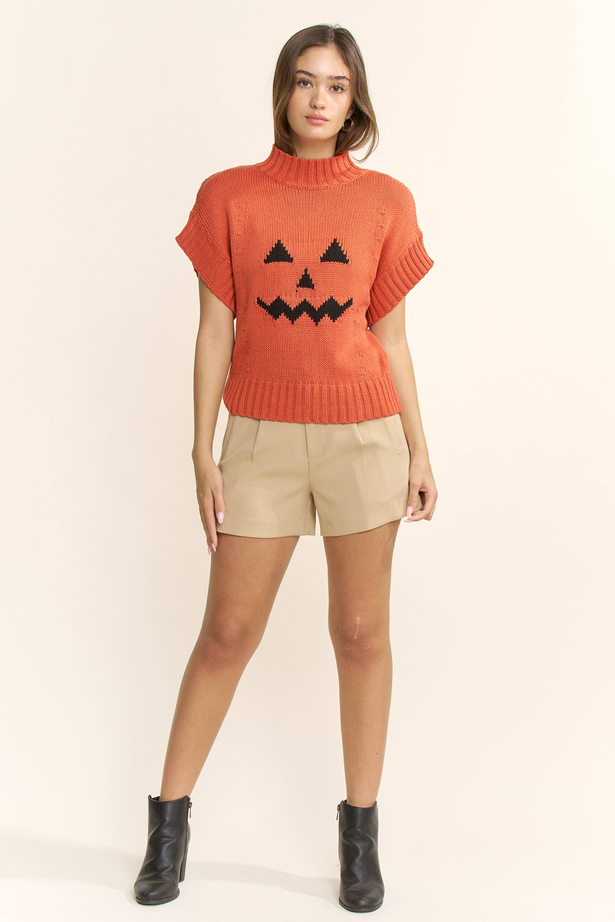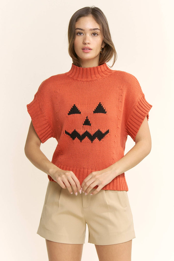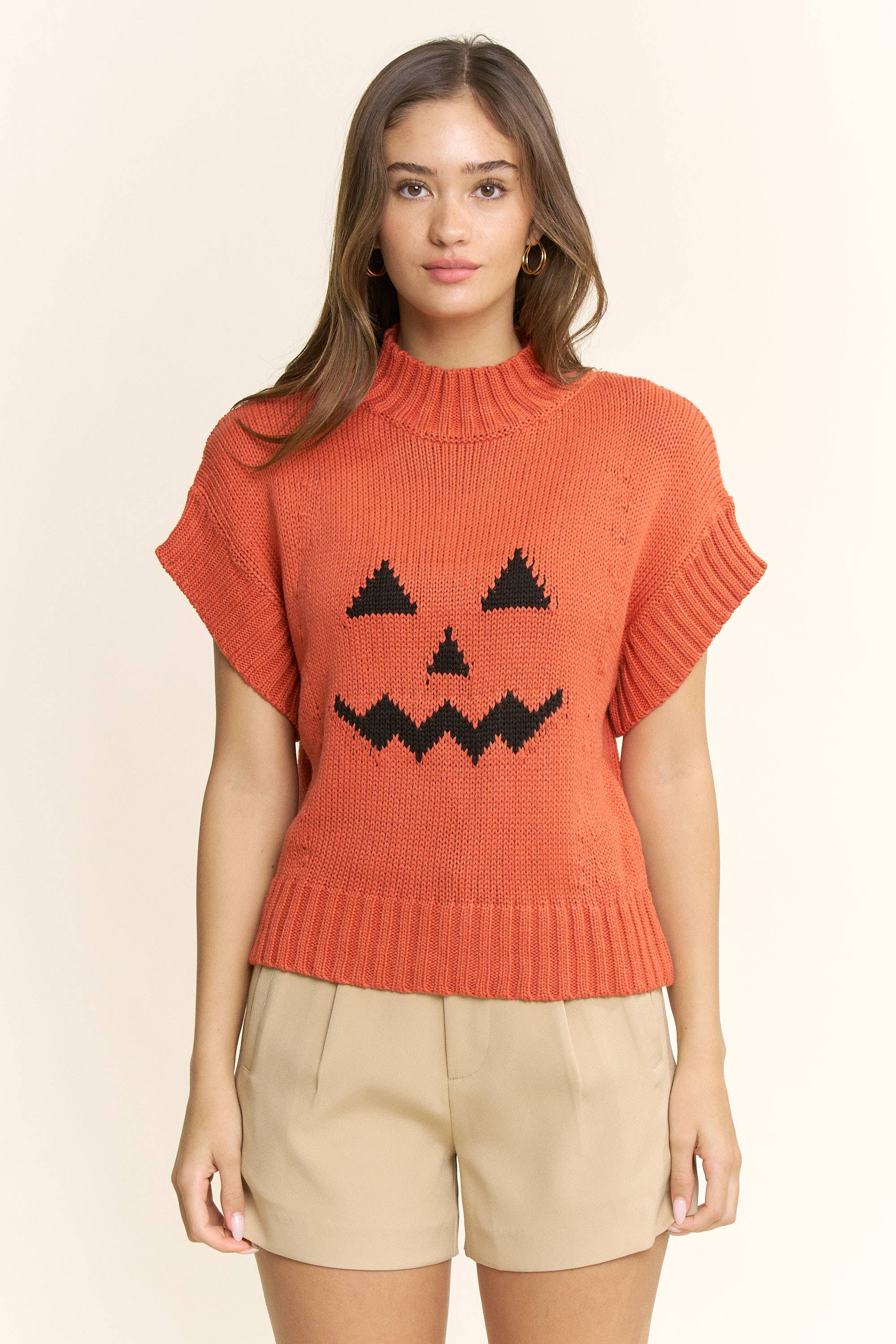 Get into the Halloween spirit with our Halloween Jack O Lantern Sweater in rust! This sleeveless knit vest is a fun and festive way to celebrate the spooky season. Made from a soft cotton acrylic blend, it’s perfect for layering when the air turns crisp. Style it with boots and a long sleeve top for a playful yet cozy fall outfit!