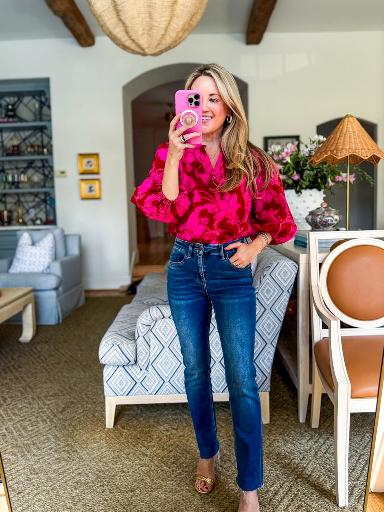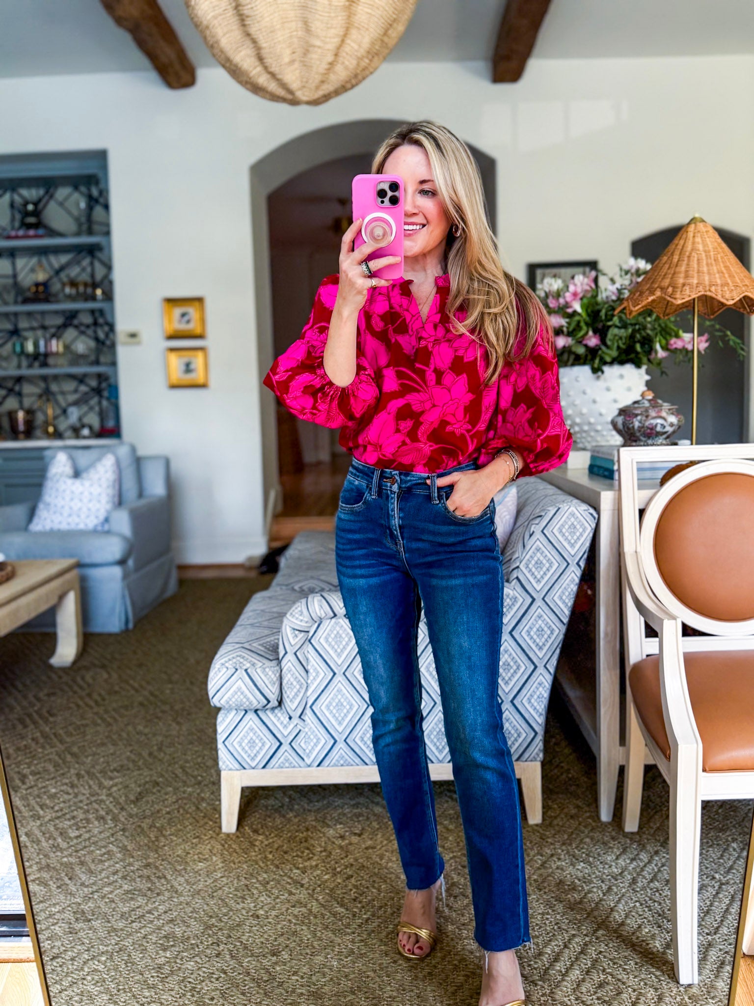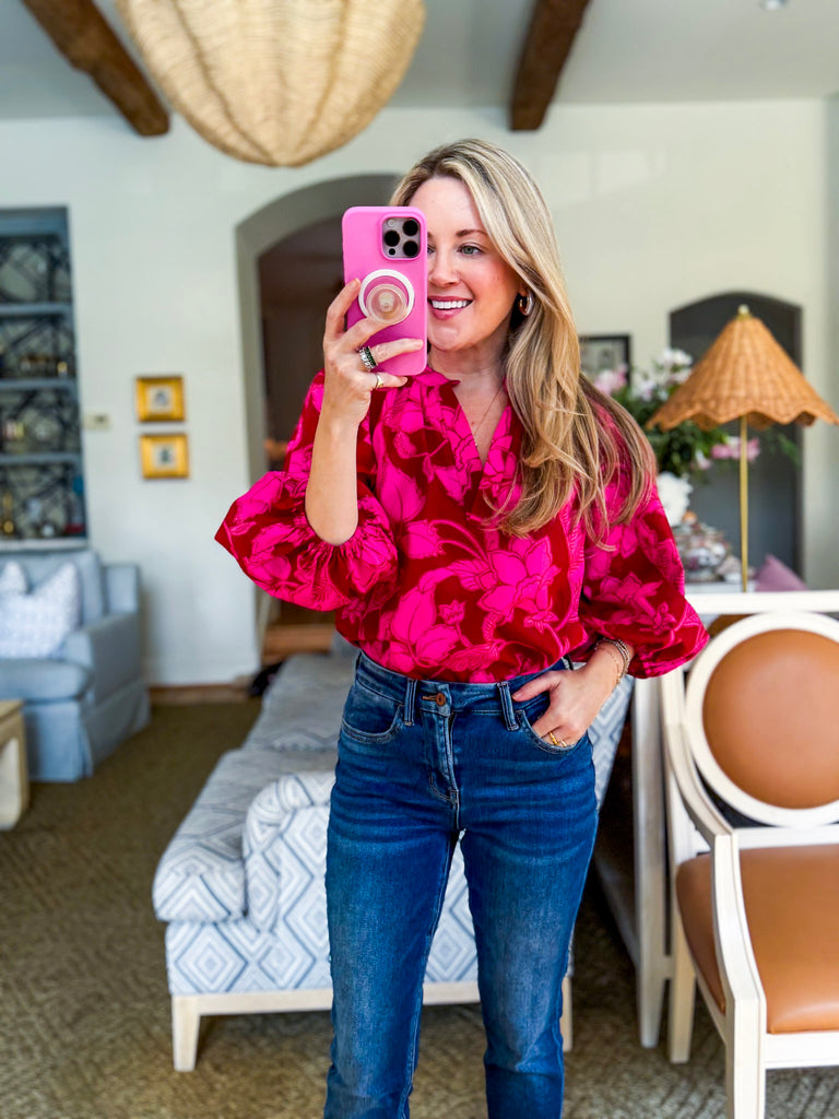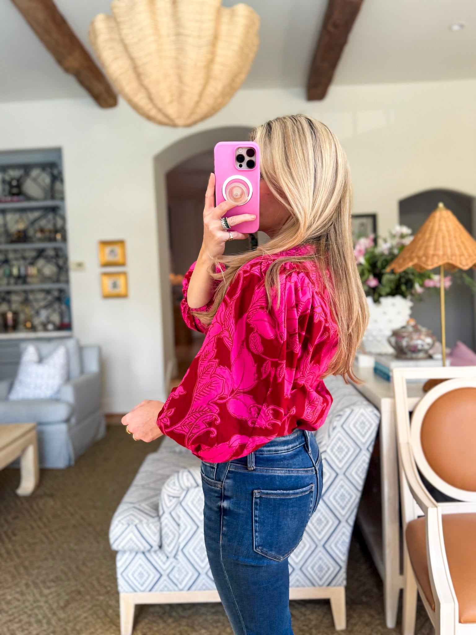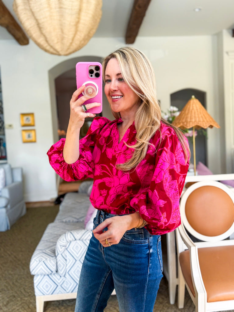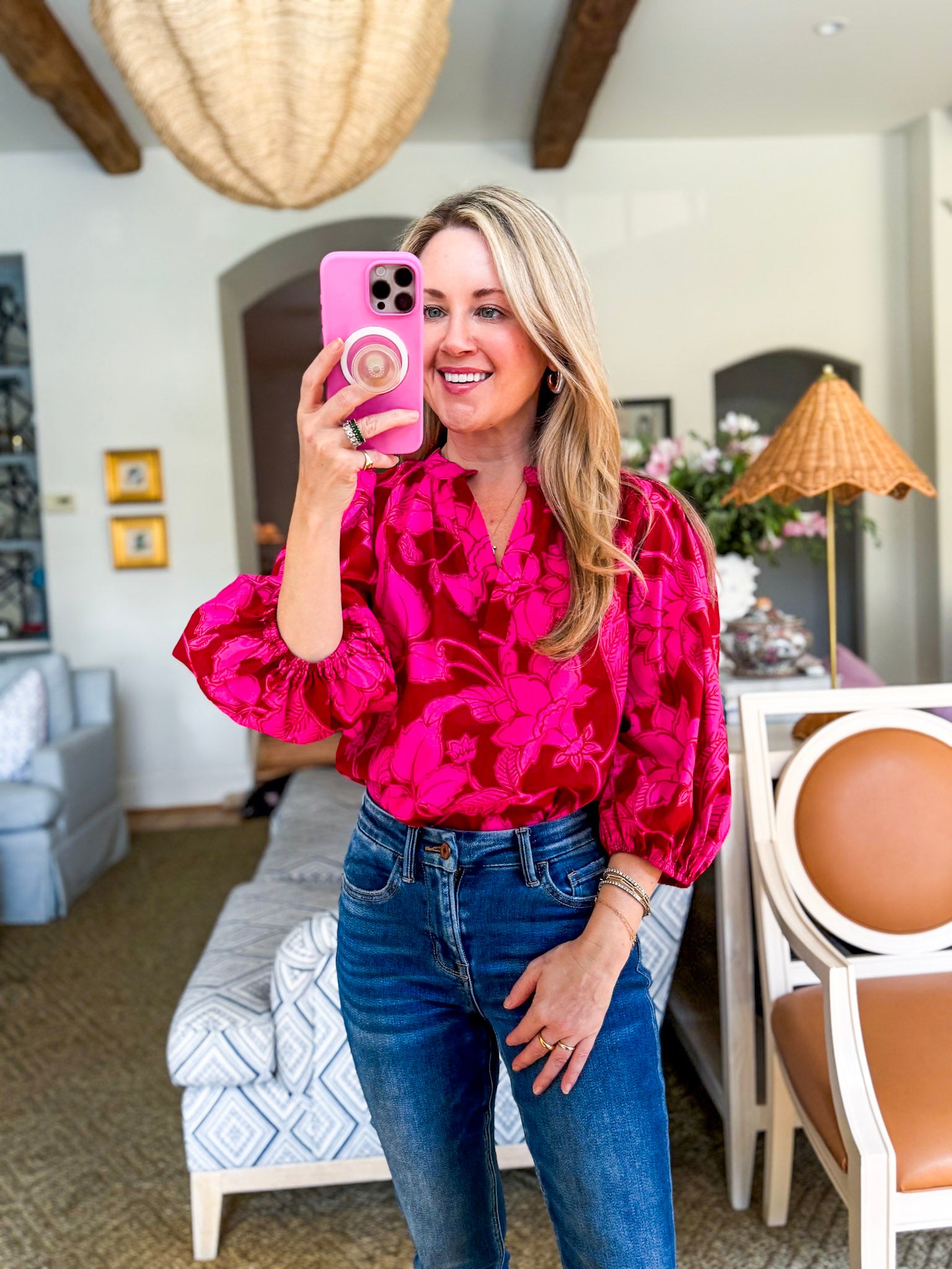 You will want to wear Just Nice Floral Top in burgundy and pink everywhere you go. This vibrant satin blouse features a bold pink floral print on a rich red background. Designed with a split neckline and long gathered sleeves, it offers a relaxed, easy fit that can be dressed up or down.