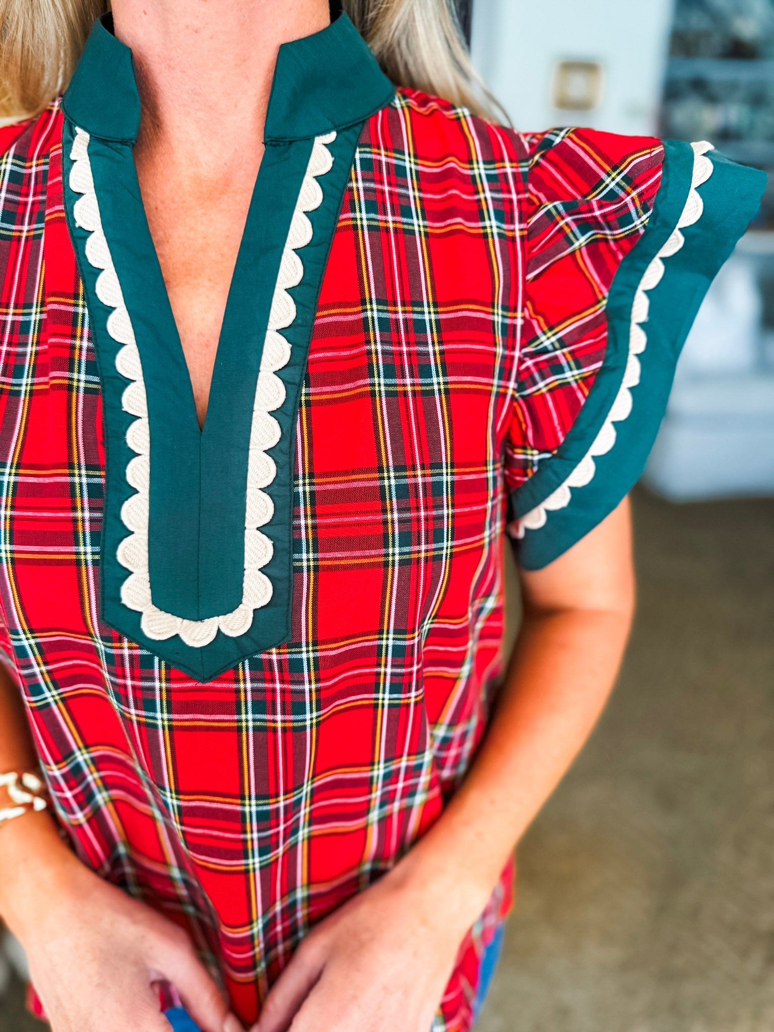 Features: Plaid pattern scallop trim accent flutter sleeve top featuring contrast V-neck caftan-inspired band. Unlined. Lined. Woven. Non-sheer. Lightweight.