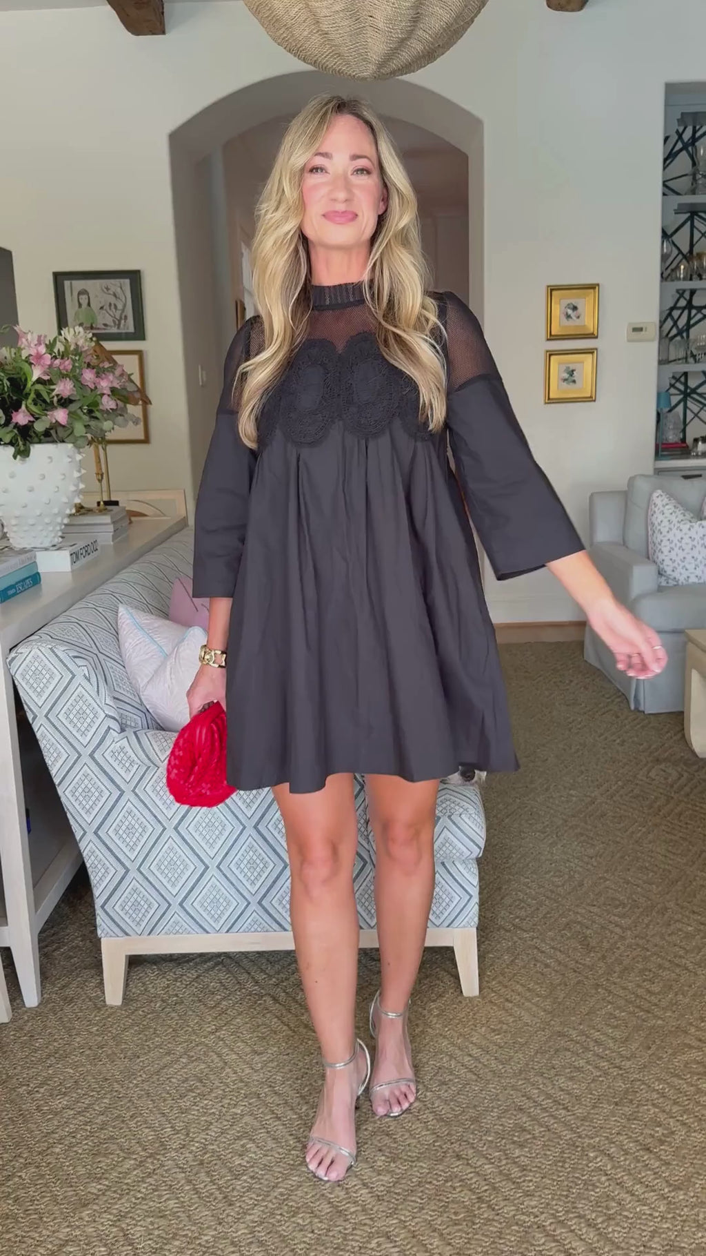 Features: 3/4 sleeves babydoll dress with mesh contrast, crochet lace trim accent, side pockets, button closure back.