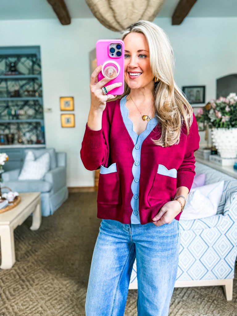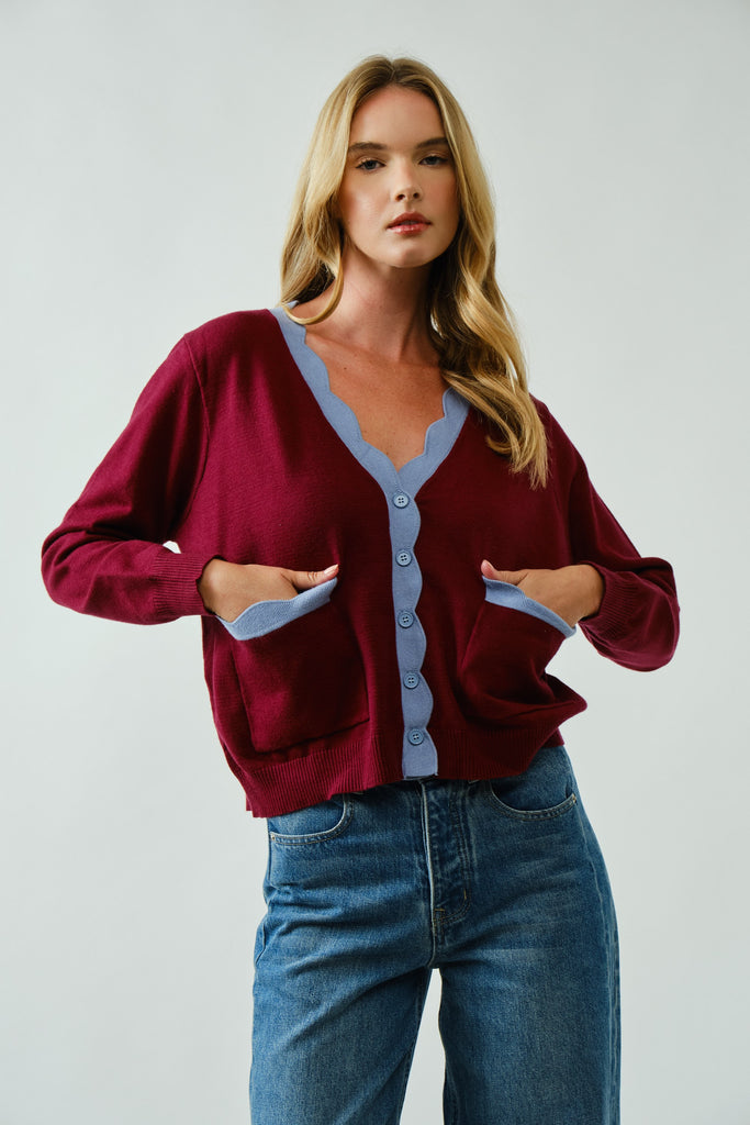 The Best of Both Cardigan in burgundy features a super soft knit that’s as cozy as it is stylish. It’s accented with scalloped edges for a delicate feminine feel, while the contrasting pockets and button placket bring a fresh, modern vibe. Button it up for a neat, put-together look. Made from ultra-soft fabric, it’s perfect for everyday wear with subtle scallop details along the neckline and contrast trim.