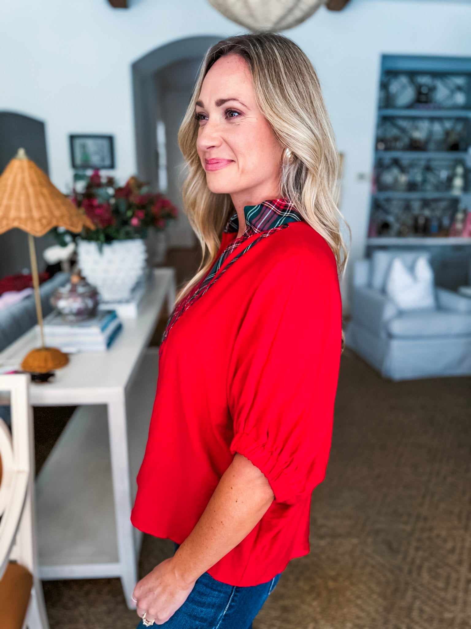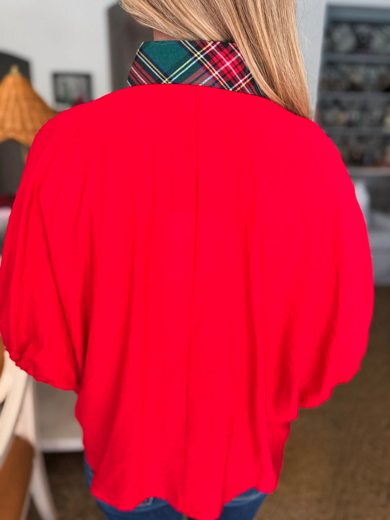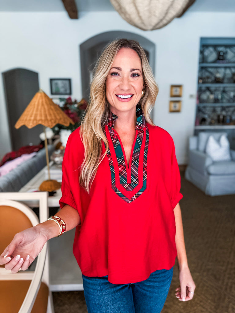 Meet the Tree Time Dolman Top in red—classic comfort meets chic detail. The plaid high V-neck adds a fun touch to this solid short sleeve beauty, making it anything but basic. Pair it with jeans for an everyday look or dress it up with tailored pants for work. Wherever you go, this lightweight top has your back.