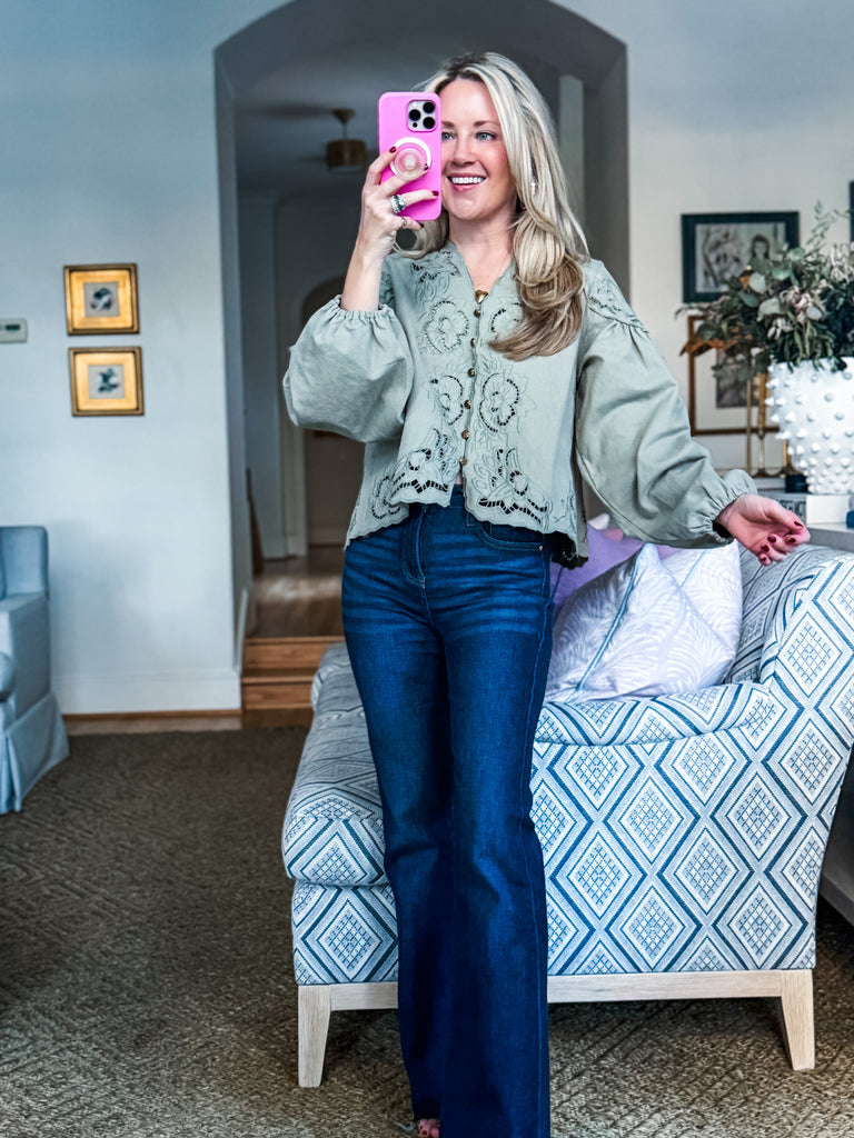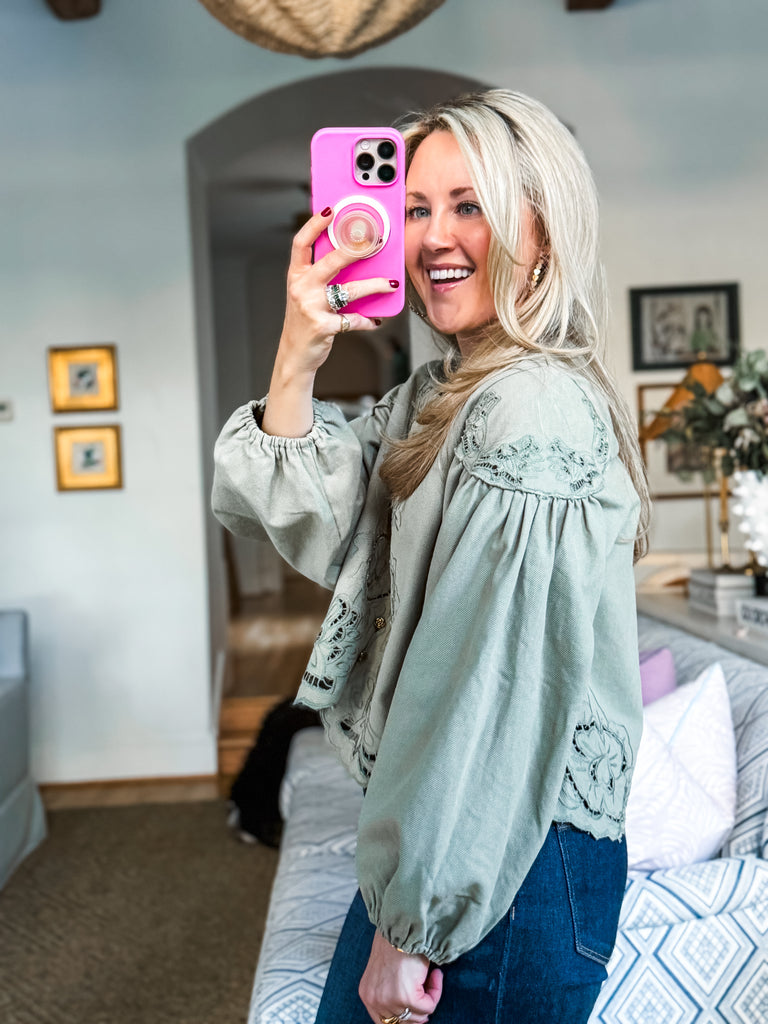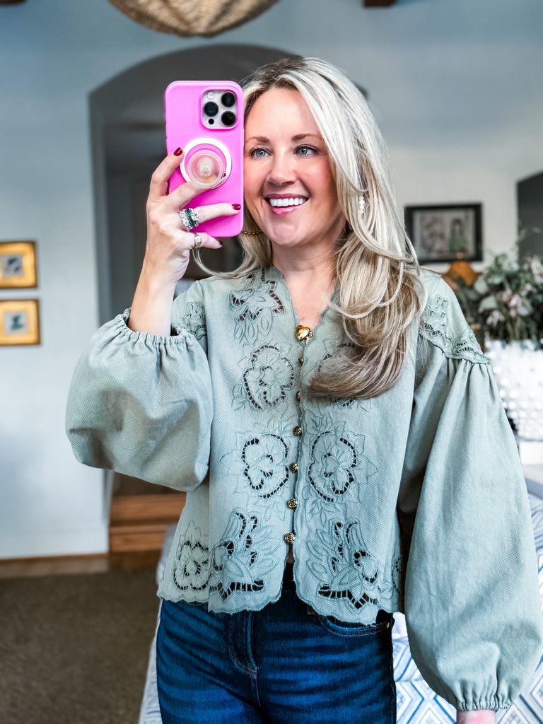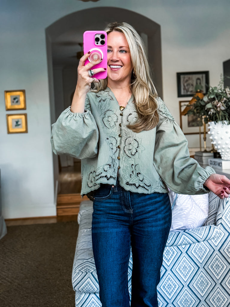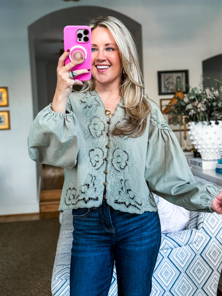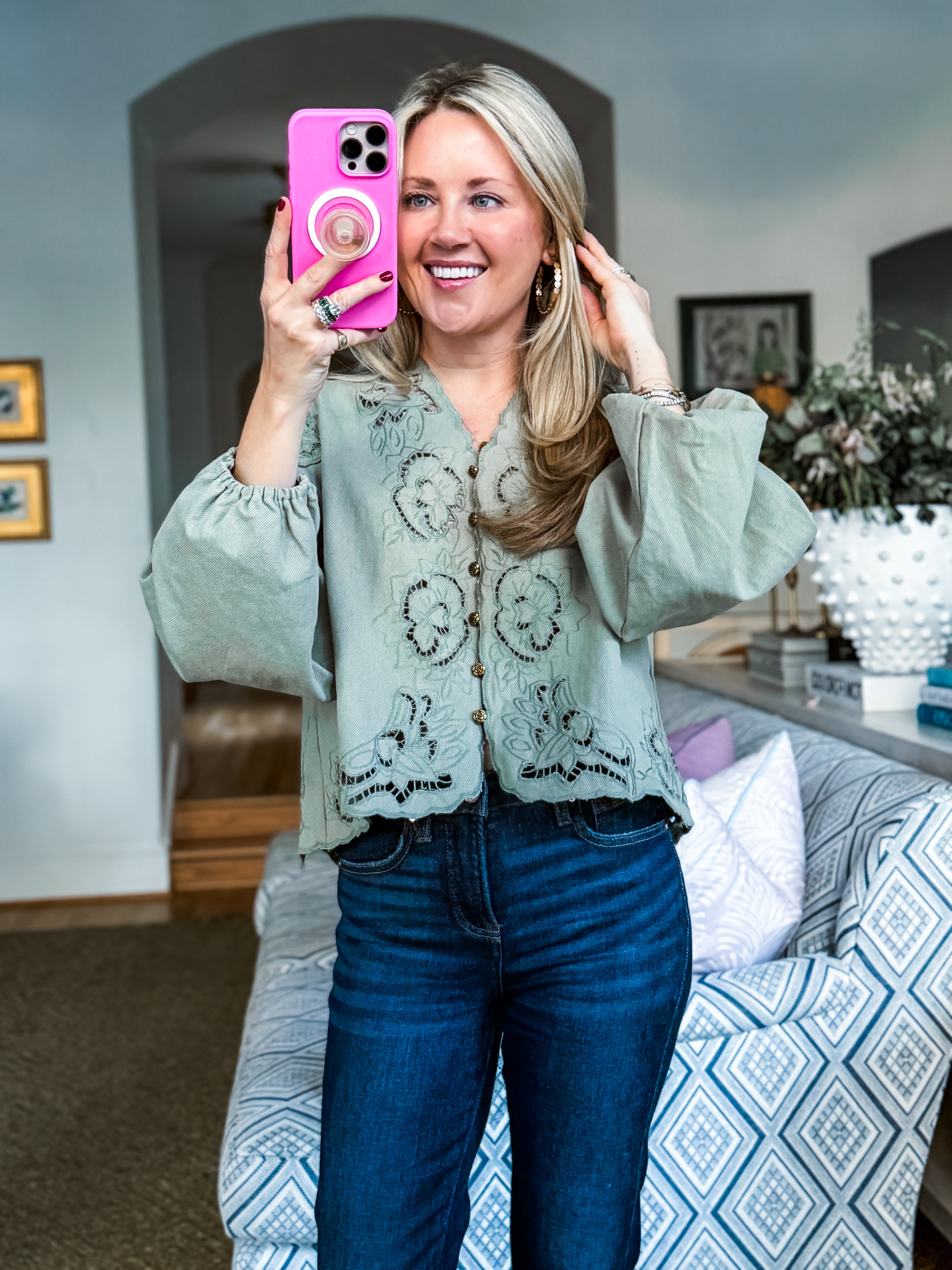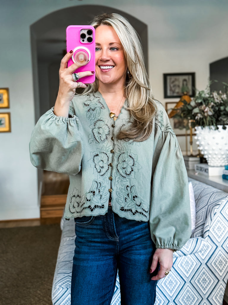Bay Breeze Denim Top in olive features intricate floral embroidery and delicate cutouts, adding a feminine touch to its relaxed silhouette. The V-neckline and button-down front create a classic look, while the balloon sleeves with elastic cuffs provide a trendy and comfortable fit!