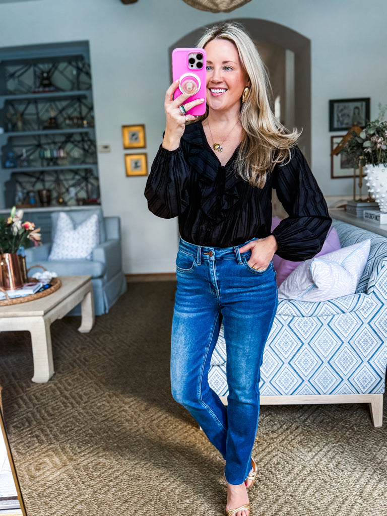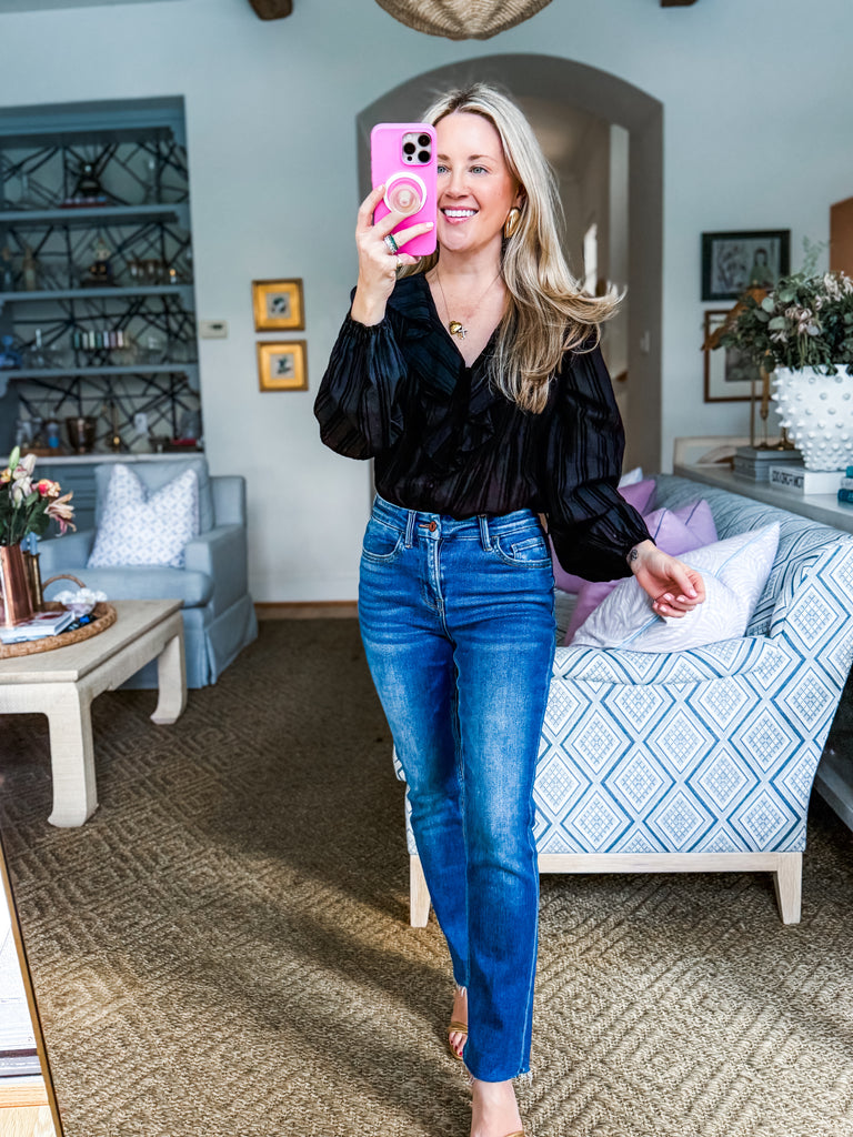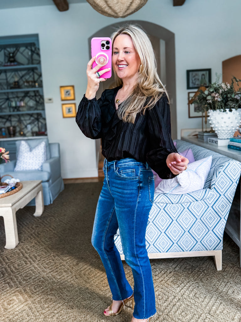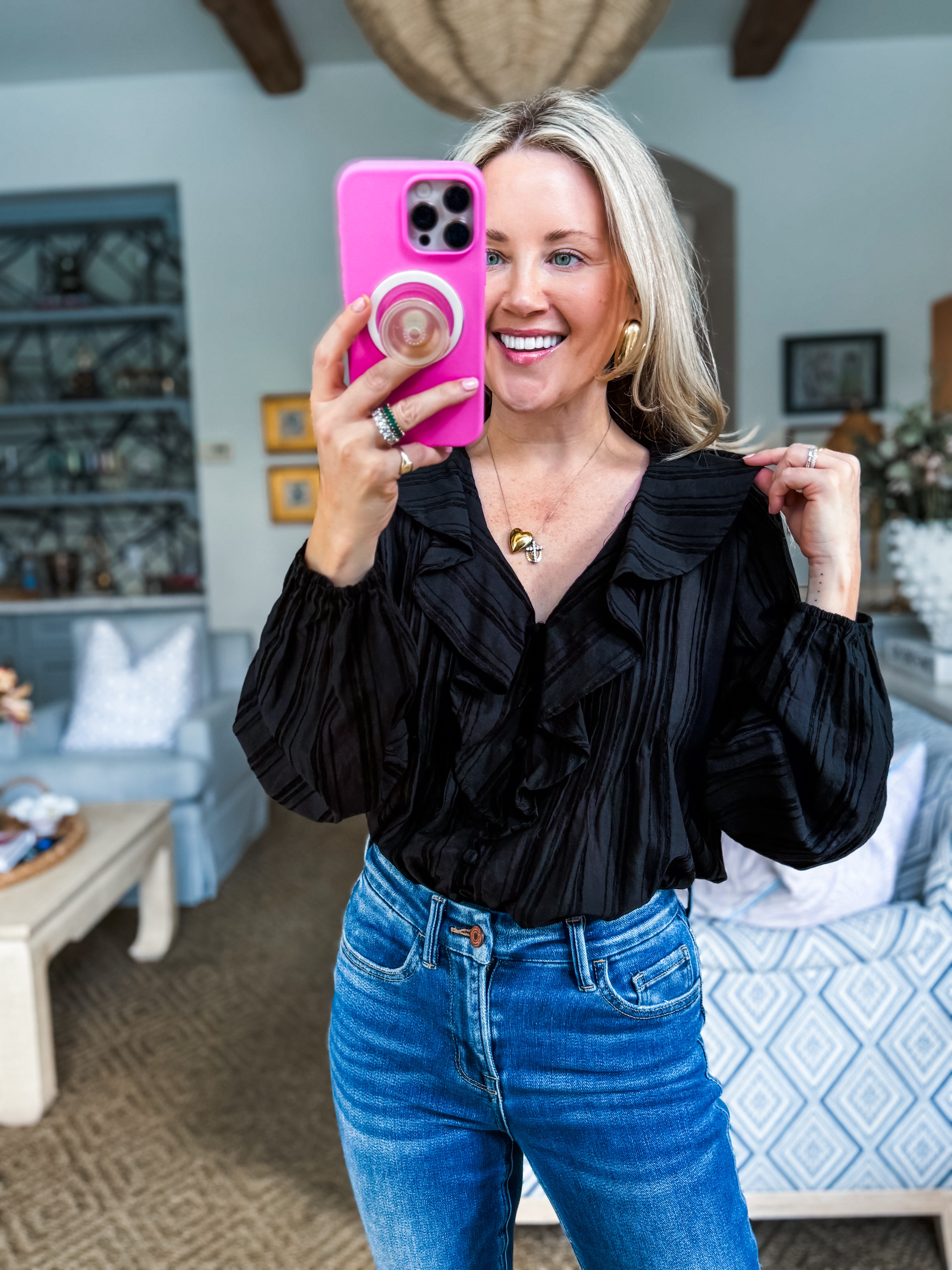 Effortlessly comfy with a touch of charm, the Feeling Light Ruffle Trim Top in black brings texture and elegance to your everyday look. Its soft vertical stripes, flowy ruffles, and gathered cuffs add that romantic flair we love. The flattering V-neckline makes it easy to dress up or down. Lightweight and breathable, it’s the perfect piece to layer from workdays to weekends.