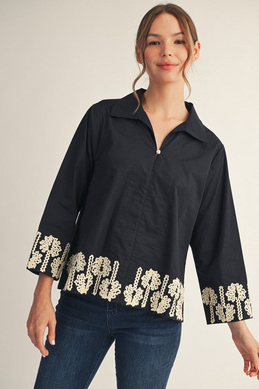 The Poppy Fields Ricrac Trim Top in black is the sweetest way to elevate your everyday look. With its dainty pearl buttons, slit sleeves, and playful floral accents, it’s made for brunch dates or coffee catch-ups. The 3/4 sleeves keep it chic yet comfy for any season. Pair it with denim or dress pants, and you’re set for both work and weekends.