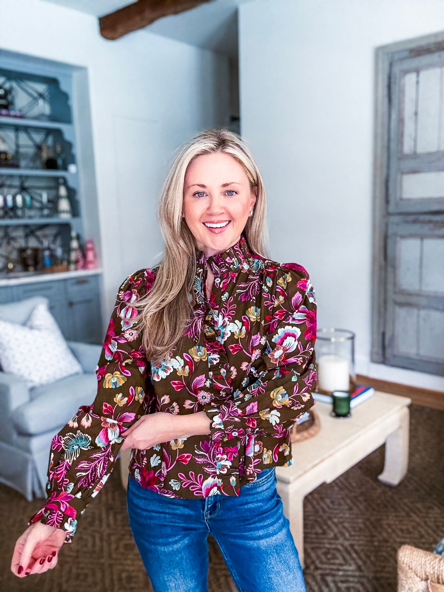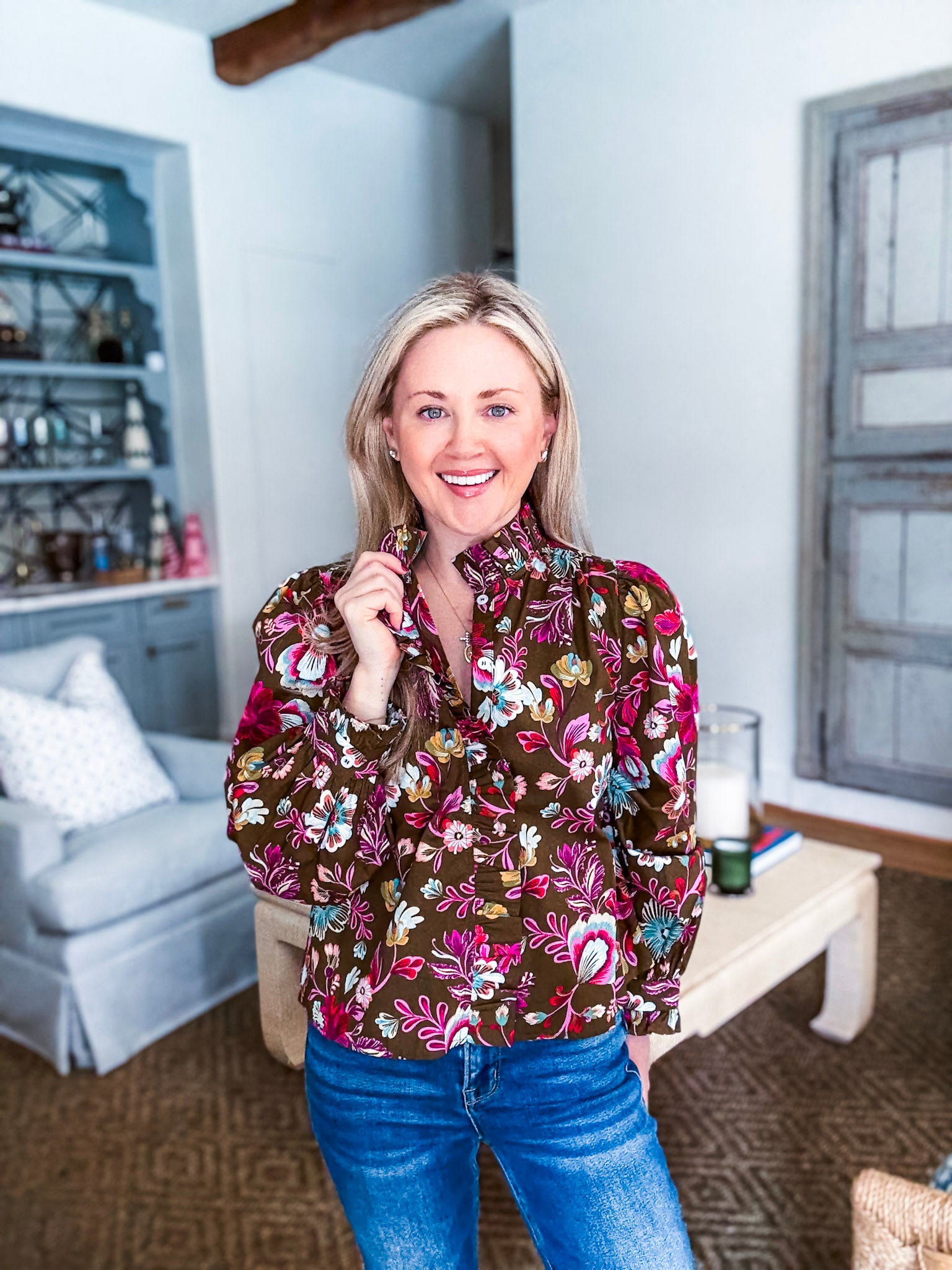 Embrace your inner romantic with Rustic Romance Floral Top in ash olive that's all about the details. The high ruffled neckline and ruffle trimmed placket add instant personality, while relaxed tailoring keeps things effortlessly comfortable. Long puff sleeves with ruffled buttoned cuffs complete the whimsical look. Perfect for anyone who loves a little extra flair with their florals.
