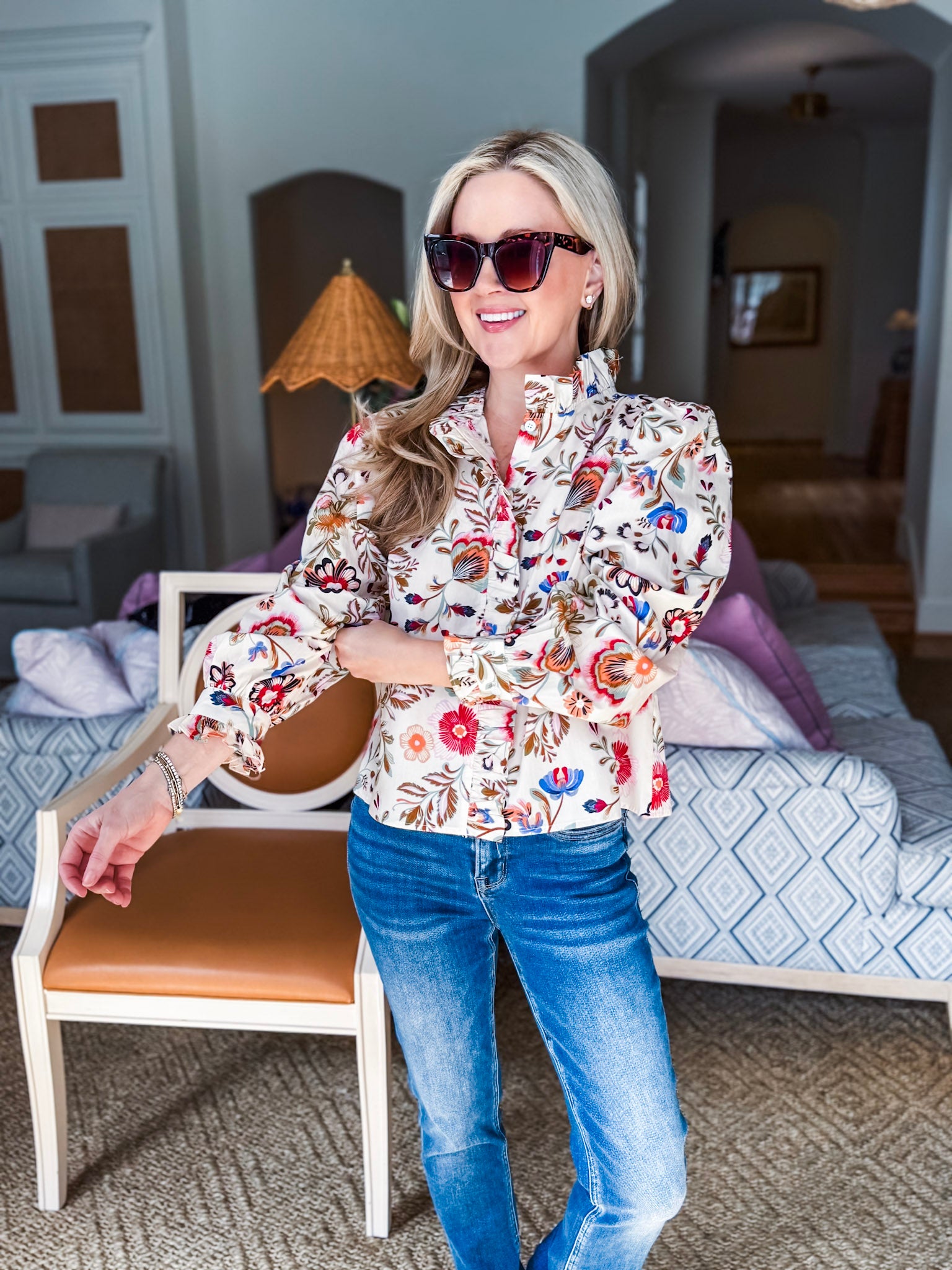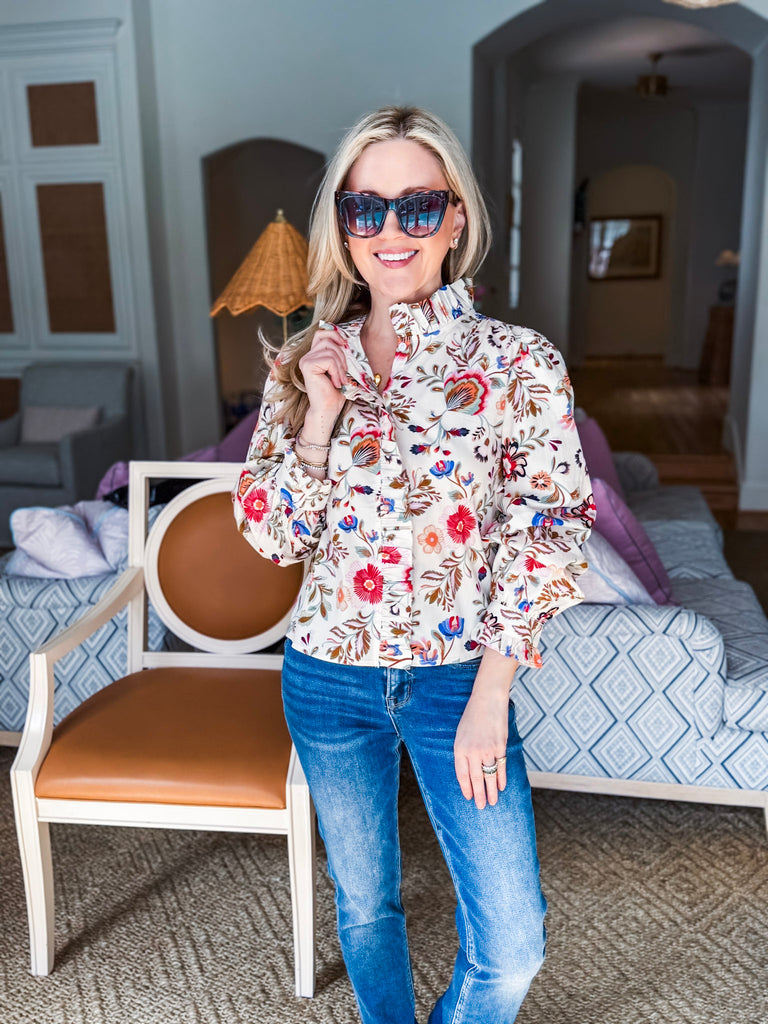 Embrace your inner romantic with Rustic Romance Floral Top in cream that's all about the details. The high ruffled neckline and ruffle trimmed placket add instant personality, while relaxed tailoring keeps things effortlessly comfortable. Long puff sleeves with ruffled buttoned cuffs complete the whimsical look. Perfect for anyone who loves a little extra flair with their florals.