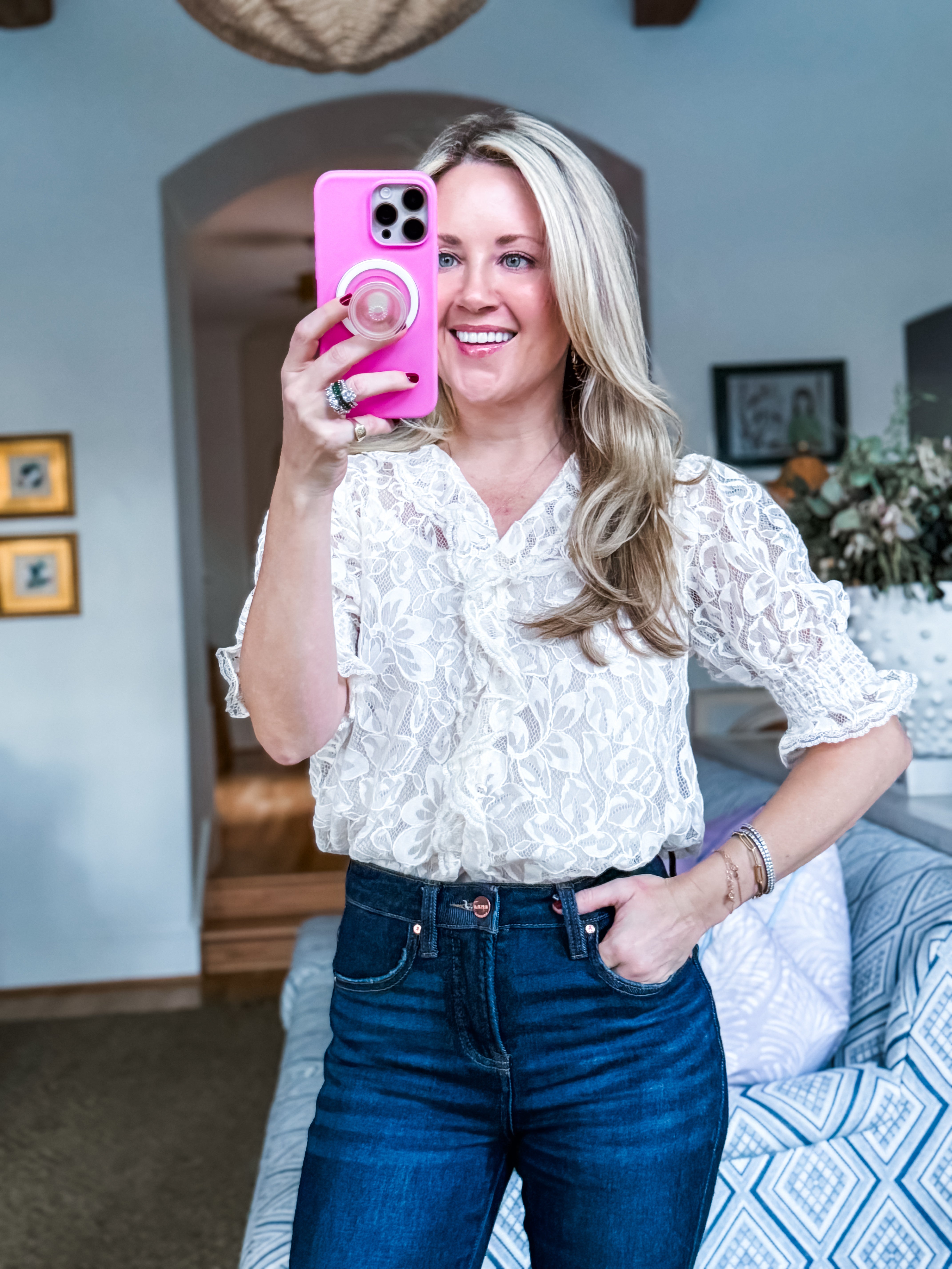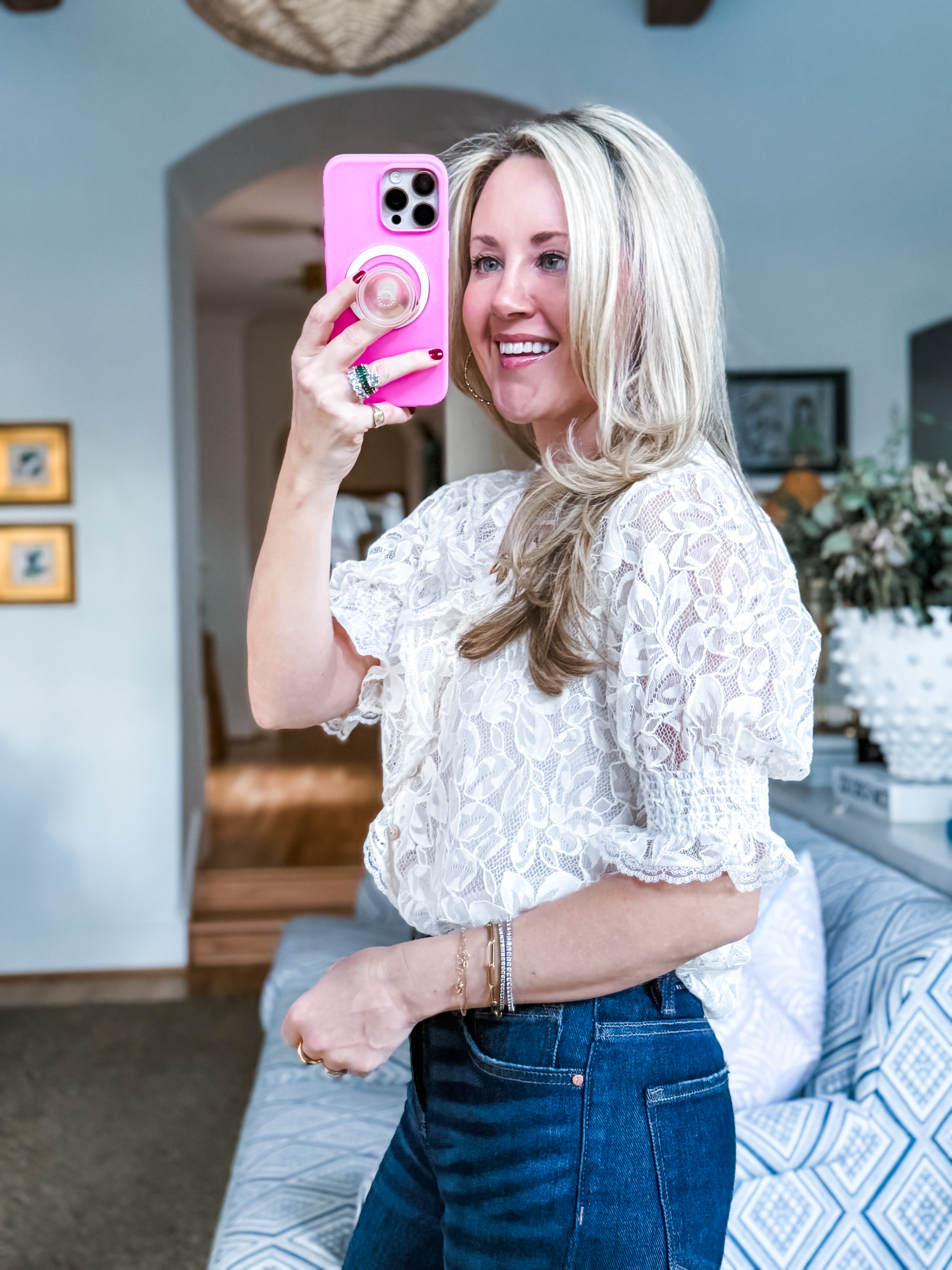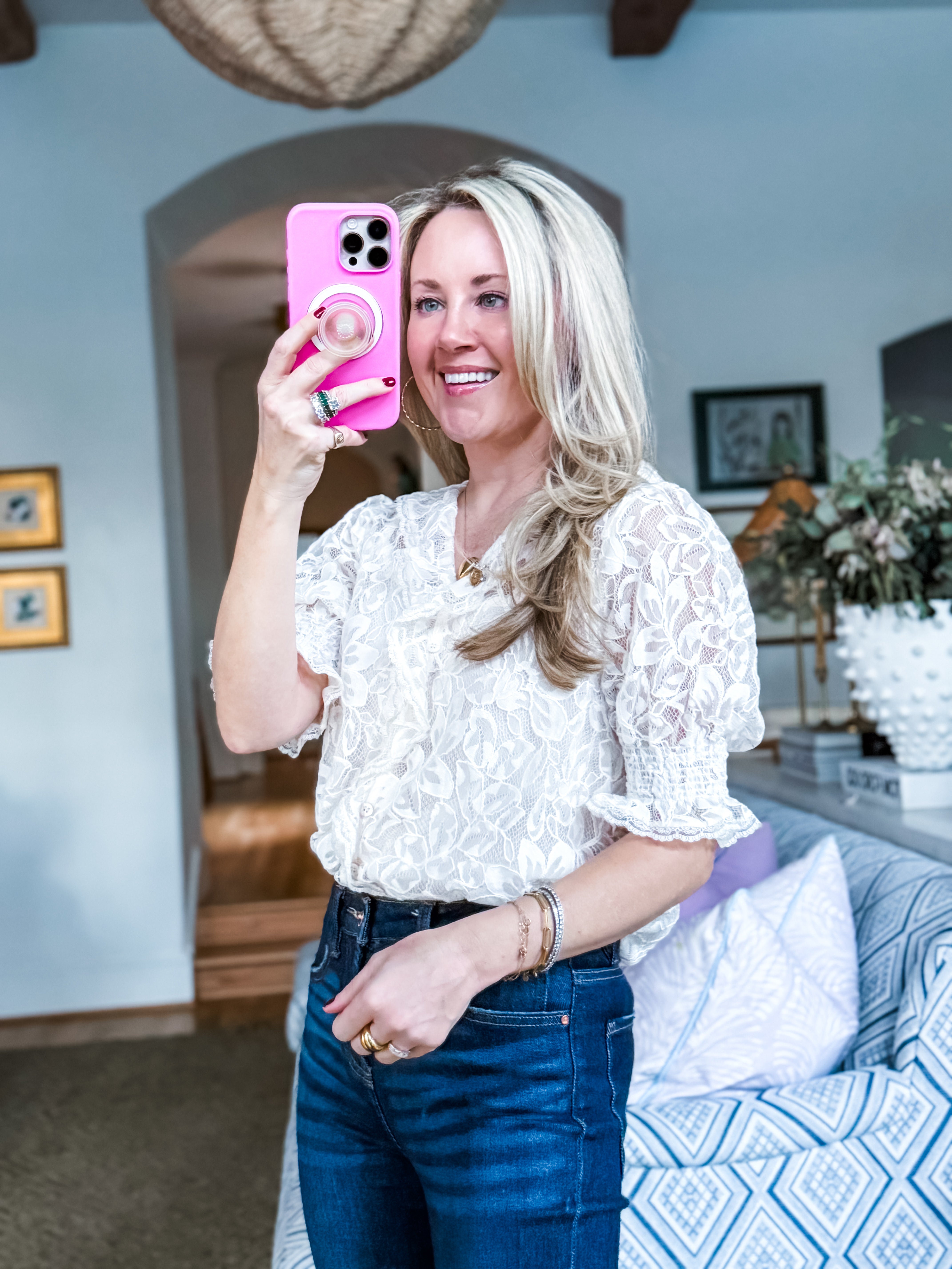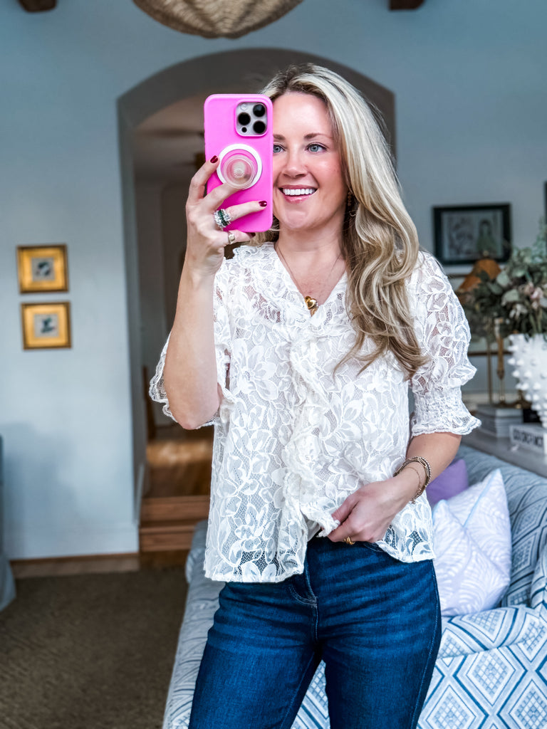 Whimsical Floral Lace Top in cream brings effortless elegance to your wardrobe. The all-over delicate lace features a ruffled front trim and puff half sleeves with smocked cuffs that add a touch of feminine volume. Lightweight and semi-sheer, it's designed for versatility—layer it with camisole for a polished look, or wear it solo over a bralette. Dress it down with jeans for casual chic or pair with a skirt for something more refined. A go-to piece that works for any occasion.