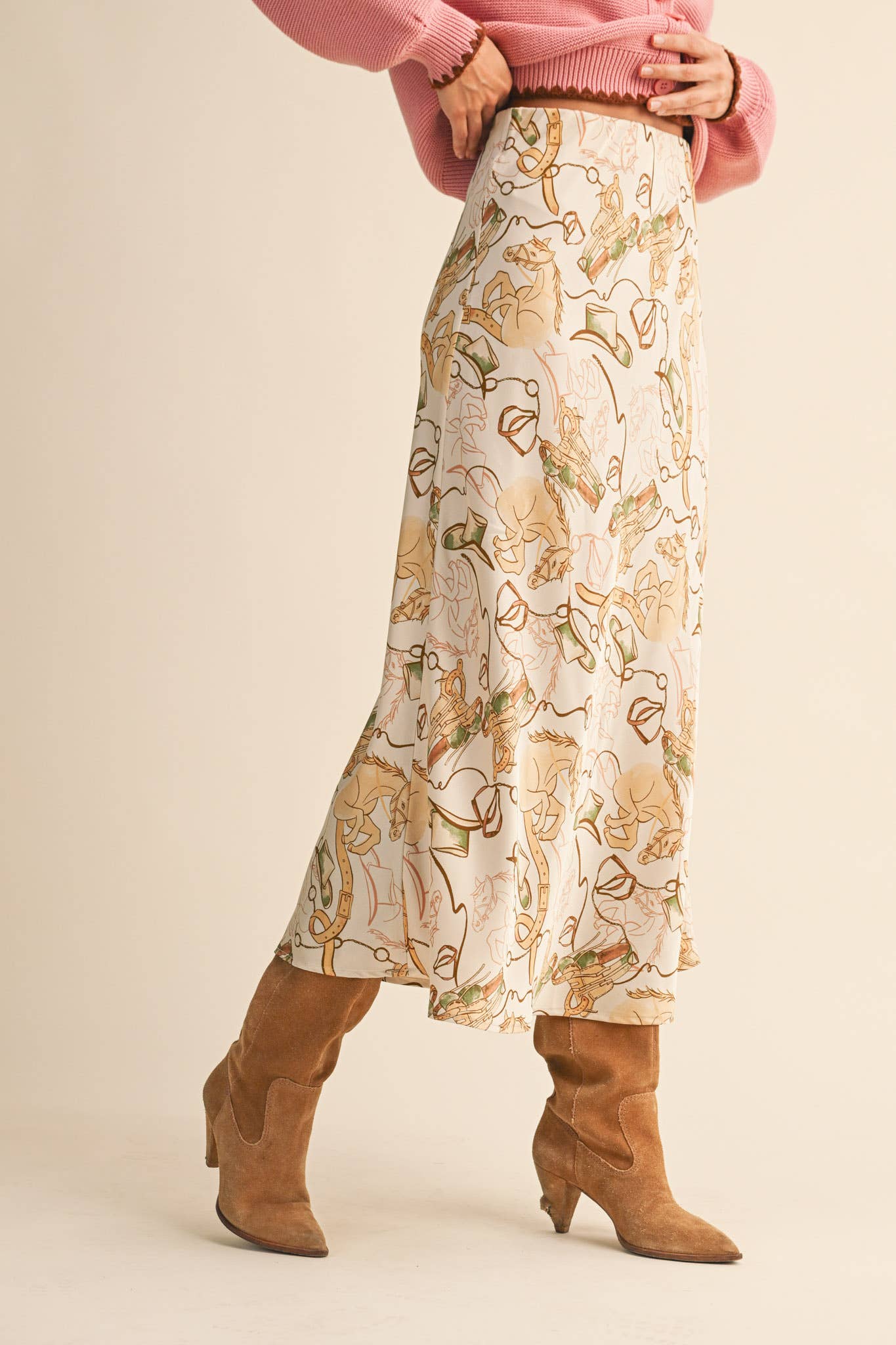 Features: Satin western print midi slip skirt, Satin effect western print fabric, High waisted fit, Covered elastic waistband,  Midi length